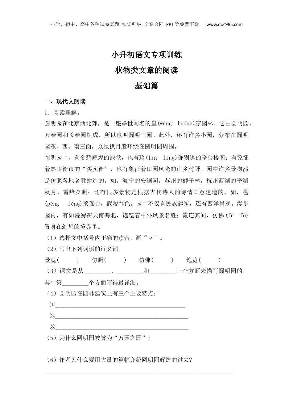 小学、初中、高中各种试卷真题知识归纳文案合同PPT等免费下载www.doc985.com小升初语文专项训练状物类文章的阅读基础篇一、现代文阅读1.阅读理解。圆明园在北京西北郊,是一座举世闻名的皇(wánghuáng)家园林。它由圆明园、万春园和长春园组成,所以也叫圆明三园。此外,还有许多小园,分布在圆明园东、西、南三面,众星拱月般环绕在圆明园周围。圆明园中,有金碧辉煌的殿堂,也有玲(línlíng)珑剔透的亭台楼阁;有象征着热闹街市的“买卖街”,也有象征着田园风光的山乡村野。园中许多景物都是仿照各地名胜建造的,如,海宁的安澜园,苏州的狮子林,杭州西湖的平湖秋月、雷峰夕照;还有很多景物是根据古代诗人的诗情画意建造的,如,蓬(péngféng)莱瑶台,武陵春色。园中不仅有民族建筑,还有西洋景观。漫步园内,有如漫游在天南海北,饱览着中外风景名胜;流连其间,仿佛(fúfó)置身在幻想的境界里。(1)选择文中括号内正确的读音,画“√”。(2)写出下列词语的近义词。景观()仿照()仿佛()饱览()(3)课文是从_________、_________和_________三个方面来描写圆明园的,其中第_________个方面写得最详细。(4)圆明园在园林建筑上有三个主要特点:①____________________________________________②_____________________________________________③_____________________________________________(5)为什么圆明园被誉为“万园之园”?________________________________________________________________(6)作者为什么要用大量的篇幅介绍圆明园辉煌的过去?________________________________________________________________小学、初中、高中各种试卷真题知识归纳文案合同PPT等免费下载www.doc985.com(7)联系上下文,说说从加横线的词语中体会到了什么。他们把园内凡是能拿走的东西,统统掠走;拿不动的,就用大车或牲口搬运;实在运不走的,就任意破坏、毁掉。________________________________________________________________2.课外类文阅读。在天安门右前方,巍然(耸屹)立着一座雄伟壮丽的大厦,这就是人民大会堂。全国各族人民的代表在这里共商国策。庄严的人民大会堂,是首都最宏伟的建筑之一,建筑面积达171800平方米,体积有1596900立方米。一条黄绿相间的琉璃屋檐,把巍峨的大会堂的轮廓从(蔚尉)蓝的天空中勾画出来。那壮丽的柱廊,淡雅的色调,以及四周层次繁多的建筑立面,组成了一(幅副)庄严绚丽的画图。迈进金黄色大铜门,穿过宽阔的风门厅和衣帽厅,就到了大会堂建筑的枢(钮纽)部分——中央大厅。建筑师站在这里,指着四周向我们介绍了整个建筑的布局:朝西直入万人大礼堂;往北通宴会厅;向南穿过长长的廊道,是全国人民代表大会常务委员会的办公大楼。整个建筑就是由这三部分组成的。万人大礼堂,里面宽76米,深60米,中部高33米,体积达86000立方米,像一座大厦。但是由于设计师们处理得巧妙,走进大礼堂的人,放眼一望,从屋顶到地面,上下(浊浑)然一体,并不感到怎样空旷。屋顶是穹隆形的,天花板上纵横密排着近500个灯孔。灯光齐明的时候,就像满天星斗。顶部的中心挂着红宝石般的五星灯,灯的周围是70条瑰丽的光芒线和40瓣镏(liú)金的向日葵花瓣,象征着全国各族人民万众一心,紧密团结在中国共产党的周围。在它的外围,有三环层次分明的水波形暗灯槽,同周围装贴的淡青色塑料板相映,形成“水天一色”的奇观。大礼堂呈椭圆形,有两层挑台像两弯新月,围拱着主席台,使大礼堂成为层次分明、错落有(至致)的整体。两层挑台连地面共3层座席,有9600多个席位。礼堂的主席台像个小会场,能容纳300多人。小学、初中、高中各种试卷真题知识归纳文案合同PPT等免费下载www.doc985.com(1)在文中括号内选择合适的字。(2)用自己的话说说第1自然段交代了哪些内容。________________________________________________________________(3)第2自然段画线句子的说明方法是()。A.举例子B.打比方C.列数字(4)第3自然段哪些词语表明了空间方位的转移?________________________________________________________________(5)文章介绍万人大礼堂采用了...