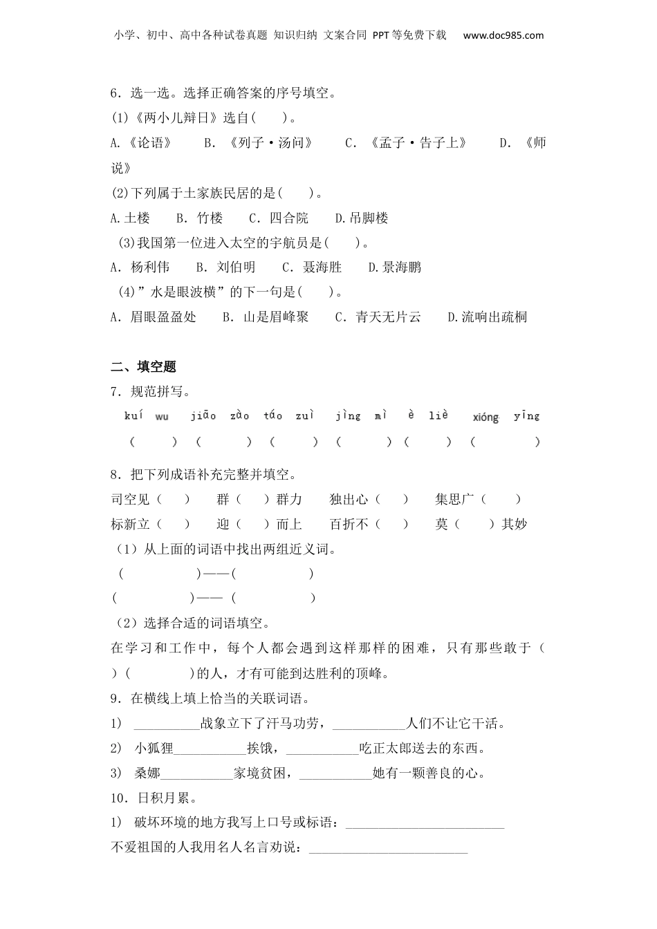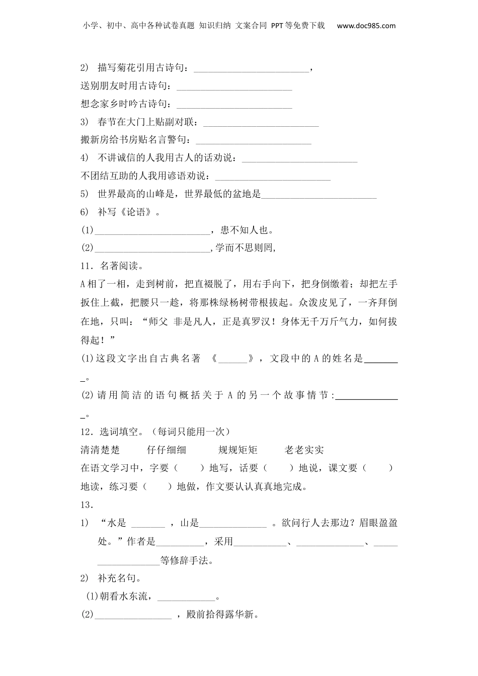 小学、初中、高中各种试卷真题知识归纳文案合同PPT等免费下载www.doc985.com小升初语文总复习(2)一、选择题1.选择正确答案的序号填在括号里。(1)“轻诺必寡信”出自()。A.《论语》B.《老子》C.《庄子》D.《礼记》(2)“三十功名尘与土,八千里路云和月”是()的词句。A.苏轼B.岳飞C.陆游D.辛弃疾(3)诗句“忽如一夜春风来,千树万树梨花开”描写的季节是()A.春B.夏C.秋D.冬(4)()不是词牌名。A.满江红B.天净沙C.西江月D.水调歌头2.加横线字解释不正确的一项是()。(1)因人而异(不相同)(2)景色奇异(特别)(3)顾名思义(情谊)(4)至仁至义(正义,合乎情理)3.加横线的词语用得恰当的一句是()。(1)开学第一天,我们鼓号队员神气活现地站在校门口吹号敲鼓。(2)利用暑假的时间去三亚旅游,是我们全家蓄谋已久的活动计划。(3)我认为这条建议很有价值,便随声附和,表示赞成。(4)得知九十高龄的张老师还健在,我们都很高兴。4.下列各句中,标点符号使用有错误的一句是()。(1)有一首歌叫《太湖美》,歌中唱道太湖美,美就美在太湖水!”(2)彭德怀向着斜倒下去的大黑骡子,慢慢地摘下军帽……(3)“我不明白”父亲并不退让:“难道世界上糟糕的诗还不够么?”(4)“嗒嗒嗒……”密集的机关枪子弹倾泻在卢沟桥桥面上。5.下面哪种说法、引用不合适?()(1)同学在我的毕业赠言中写道:“海内存知己,天涯若比邻。”(2)有道是“钟不敲不响,话不说不明”。我们要学会解释。(3)小强总是很乐意接受别人的批评和意见,有的同学不理解,小强说;“良药苦口利于病,忠言逆耳利于行。”(4)小明沉湎于网络游戏,我劝他说:“不入虎穴,焉得虎子。”小学、初中、高中各种试卷真题知识归纳文案合同PPT等免费下载www.doc985.com6.选一选。选择正确答案的序号填空。(1)《两小儿辩日》选自()。A.《论语》B.《列子·汤问》C.《孟子·告子上》D.《师说》(2)下列属于土家族民居的是()。A.土楼B.竹楼C.四合院D.吊脚楼(3)我国第一位进入太空的宇航员是()。A.杨利伟B.刘伯明C.聂海胜D.景海鹏(4)”水是眼波横”的下一句是()。A.眉眼盈盈处B.山是眉峰聚C.青天无片云D.流响出疏桐二、填空题7.规范拼写。8.把下列成语补充完整并填空。司空见()群()群力独出心()集思广()标新立()迎()而上百折不()莫()其妙(1)从上面的词语中找出两组近义词。()——()()——()(2)选择合适的词语填空。在学习和工作中,每个人都会遇到这样那样的困难,只有那些敢于()()的人,才有可能到达胜利的顶峰。9.在横线上填上恰当的关联词语。1)__________战象立下了汗马功劳,___________人们不让它干活。2)小狐狸___________挨饿,___________吃正太郎送去的东西。3)桑娜___________家境贫困,___________她有一颗善良的心。10.日积月累。1)破坏环境的地方我写上口号或标语:________________________不爱祖国的人我用名人名言劝说:________________________小学、初中、高中各种试卷真题知识归纳文案合同PPT等免费下载www.doc985.com2)描写菊花引用古诗句:________________________,送别朋友时用古诗句:________________________想念家乡时吟古诗句:________________________3)春节在大门上贴副对联:________________________搬新房给书房贴名言警句:________________________4)不讲诚信的人我用古人的话劝说:________________________不团结互助的人我用谚语劝说:________________________5)世界最高的山峰是,世界最低的盆地是________________________6)补写《论语》。(1)________________________,患不知人也。(2)________________________,学而不思则罔,11.名著阅读。A相了一相,走到树前,把直裰脱了,用右手向下,把身倒缴着;却把左手扳住上截,把腰只一趁,将那株绿杨树带根拔起。众泼皮见了,一齐拜倒在地,只叫:“师父非是凡人,正是真罗汉!身体无千万斤气力,如何拔得起!”(1)这段文字出自古典名著《______》,文段中的A的姓名是________。(2)请用简洁的语句概括关于A的另一个故事情节:______________。12.选词填空。(每词只能用一次)清...