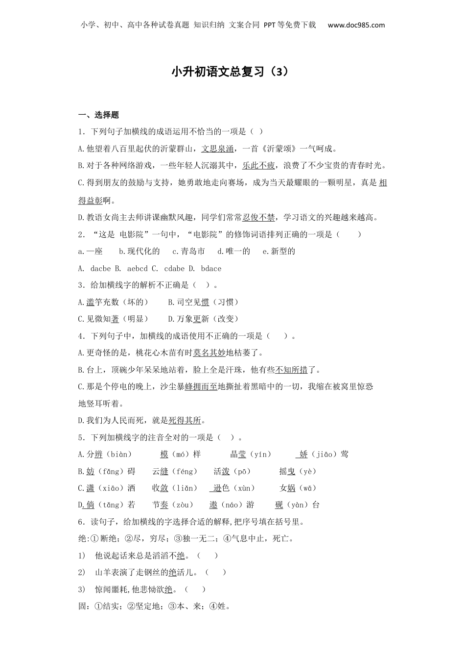 小学、初中、高中各种试卷真题知识归纳文案合同PPT等免费下载www.doc985.com小升初语文总复习(3)一、选择题1.下列句子加横线的成语运用不恰当的一项是()A.他望着八百里起伏的沂蒙群山,文思泉涌,一首《沂蒙颂》一气呵成。B.对于各种网络游戏,一些年轻人沉溺其中,乐此不疲,浪费了不少宝贵的青春时光。C.得到朋友的鼓励与支持,她勇敢地走向赛场,成为当天最耀眼的一颗明星,真是相得益彰啊。D.教语女尚主去师讲课幽默风趣,同学们常常忍俊不禁,学习语文的兴趣越来越高。2.“这是电影院”一句中,“电影院”的修饰词语排列正确的一项是()a.—座b.现代化的c.青岛市d.唯一的e.新型的A.dacbeB.aebcdC.cdabeD.bdace3.给加横线字的解析不正确是()。A.滥竽充数(坏的)B.司空见惯(习惯)C.见微知著(明显)D.万象更新(改变)4.下列句子中,加横线的成语使用不正确的一项是()。A.更奇怪的是,桃花心木苗有时莫名其妙地枯萎了。B.台上,顶碗少年呆呆地站着,脸上全是汗珠,他有些不知所措了。C.那是个停电的晚上,沙尘暴蜂拥而至地撕扯着黑暗中的一切,我缩在被窝里惊恐地竖耳听着。D.我们为人民而死,就是死得其所。5.下列加横线字的注音全对的一项是()。A.分辨(biàn)模(mó)样晶莹(yín)娇(jiāo)莺B.妨(fǎng)碍云缝(féng)活泼(pō)摇曳(yè)C.潇(xiāo)洒收敛(liǎn)逊色(xùn)女娲(wā)D.倘(tǎng)若节奏(zòu)遨(náo)游砚(yàn)台[来源:学.科.网]6.读句子,给加横线的字选择合适的解释,把序号填在括号里。绝:①断绝;②尽,穷尽;③独一无二;④气息中止,死亡。1)他说起话来总是滔滔不绝。()2)山羊表演了走钢丝的绝活儿。()3)惊闻噩耗,他悲恸欲绝。()固:①结实;②坚定地;③本、来;④姓。小学、初中、高中各种试卷真题知识归纳文案合同PPT等免费下载www.doc985.com4)人固有一死。()5)战士们固守阵地。()来源:学§科§网]6)赵州桥不但坚固,而且美观。()7.下列加横线字的读音完全相同的一组是()(1)今日经过北京晶莹(2)存款嘴唇纯洁鹌鹑(3)谨慎渗透甚至昌盛(4)大山衬衫蹒跚删去8.下面是“黄、董、郭、张、唐”五种姓的几种排列,正确的一种是()(1)按笔画从少到多排列:郭、董、唐、张、黄(2)按部首笔画从少到多排列:郭、董、黄、唐、张(3)按音序排列为:董、郭、黄、唐、张二、填空题9.将恰当的关联词语填在括号里。()我们是为人民服务的,()我们()有缺点,()不怕别人批评指出。10.写出下列故事或成语中的主角。画龙点睛:;人木三分:;响遏行云:;胸有成竹:;大公无私:;投鞭断流:;破釜沉舟:;三打白骨精:;七擒孟获:;进贾府:;11.填空。1)爆竹声中一岁除,___________。2)人固有一死,或__________,或__________。3)__________,种德者必养其心。4)龙,是中华民族的象征,每一个炎黄子孙都是“龙的传人”。龙成了一种文化,在中华儿女的心中,占有不可取代的地位。像__________、__________、__________、等带有“龙”字的成语,都表示赞颂和祝福。5)请你完成关于关羽这位英雄人物的两个歇后语。失荆州——__________喝酒——__________小学、初中、高中各种试卷真题知识归纳文案合同PPT等免费下载www.doc985.com12.在括号里填上合适的“liáo”字。(1)星星之火,可以()原。(2)货架上琳琅满目的商品令人眼花()乱。(3)他的作业一向字迹()草。[来源:Z。xx。k.Com](4)奥运会()亮的会歌旋律随水柱飞扬。13.根据意思用“自”字组词填空。[来源:学_科_网Z_X_X_K](1)自己尊重自己叫()(2)只顾自己利益叫()(3)自己克制自己叫()(4)自己感到骄傲叫()(5)自己埋怨自己叫()(6)自己相信自己叫()14.古人云:诗言志,文传情。下列诗人的千古名句是他们情志的最好体现。苏轼有千里共对明月的情谊:__________,__________;李清照也有死为鬼雄的豪迈:__________,__________。古人云:一切景语皆情语。作者在对下列景物的描写中都蕴涵着深深的情意。花有形:它(夹竹桃)把影子投到墙上,__________,__________,可以引起我许多幻想。日有韵:(落日中)大海失...