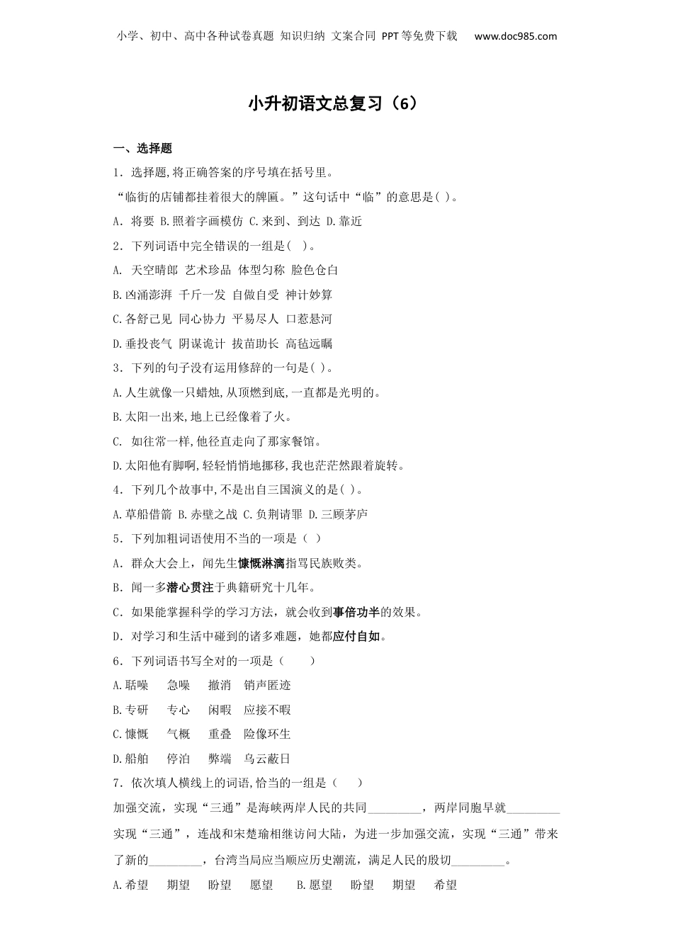 小学、初中、高中各种试卷真题知识归纳文案合同PPT等免费下载www.doc985.com小升初语文总复习(6)一、选择题1.选择题,将正确答案的序号填在括号里。“临街的店铺都挂着很大的牌匾。”这句话中“临”的意思是()。A.将要B.照着字画模仿C.来到、到达D.靠近2.下列词语中完全错误的一组是()。A.天空晴郎艺术珍品体型匀称脸色仓白B.凶涌澎湃千斤一发自做自受神计妙算C.各舒己见同心协力平易尽人口惹悬河D.垂投丧气阴谋诡计拔苗助长高毡远瞩3.下列的句子没有运用修辞的一句是()。A.人生就像一只蜡烛,从顶燃到底,一直都是光明的。B.太阳一出来,地上已经像着了火。C.如往常一样,他径直走向了那家餐馆。D.太阳他有脚啊,轻轻悄悄地挪移,我也茫茫然跟着旋转。4.下列几个故事中,不是出自三国演义的是()。A.草船借箭B.赤壁之战C.负荆请罪D.三顾茅庐5.下列加粗词语使用不当的一项是()A.群众大会上,闻先生慷慨淋漓指骂民族败类。B.闻一多潜心贯注于典籍研究十几年。C.如果能掌握科学的学习方法,就会收到事倍功半的效果。D.对学习和生活中碰到的诸多难题,她都应付自如。6.下列词语书写全对的一项是()A.聒噪急噪撤消销声匿迹B.专研专心闲暇应接不暇C.慷慨气概重叠险像环生[来源:Z_xx_k.Com]D.船舶停泊弊端乌云蔽日7.依次填人横线上的词语,恰当的一组是()加强交流,实现“三通”是海峡两岸人民的共同_________,两岸同胞早就_________实现“三通”,连战和宋楚瑜相继访问大陆,为进一步加强交流,实现“三通”带来了新的_________,台湾当局应当顺应历史潮流,满足人民的殷切_________。A.希望期望盼望愿望B.愿望盼望期望希望小学、初中、高中各种试卷真题知识归纳文案合同PPT等免费下载www.doc985.comC.愿望盼望希望期望D.期望希望盼望愿望8.找出下列各组词语中不属于同一类的一个词。1)北京上海天津浙江中国()2)词语名词动词形容词数量词()3)红色黄色彩色绿色蓝色()4)电视机电冰箱录音机洗衣机缝纫机()5)铅笔铅笔盒钢笔圆珠笔毛笔()9.下列词语注音完全正确的一组是()A.翅膀(zhìbǎng)议论(yìlùn)畜养(xùyǎng)聊以自慰(niáoyǐzìwèi)B.别墅(biéshǔ)抽噎(chōuyē)毡靴(zhānxuē)千钧一发(qiānjūnyífà)C.浏览(liúlǎn)咨询(zīxún)追悼(zhuīdào)死得其所(sǐdéqísuǒ)D.璀燦(cuǐchàn)严峻(yánjùn)俊朗(jùnlǎng)和睦相处(hémùxiāngchǔ)二、填空题10.诗句的积累和运用。“千锤万凿出深山,烈火焚烧若等闲。_____________、_____________。”这首诗的作者于借对__________的吟咏,表达了自己的志向和道德追求。11.成语、对联是祖国语言文字中的瑰宝,也很有意思,你来试试看。(1)将成语补充完整:精兵()政()机妙算坚持不()()()子孙(2)成语加减法:()顾茅庐+()步登天=()海为家十全十美−()上()下=()心()意(3)对对子:虚心使人进步,()。12.根据朗读语气填上相应的语气词及标点。_____________,今天是星期六(疑问)_____________,今天是星期六(肯定)_____________,今天是星期六(兴奋)13.先写出下列词语的近义词,再写反义词。小学、初中、高中各种试卷真题知识归纳文案合同PPT等免费下载www.doc985.com热情—()—()推却—()—()精密—()—()具体—()—()14.写出下列句子的修辞手法。⑴飞流直下三千尺,疑是银河落九天。()⑵小鸟在枝头唱歌。()⑶蓝的天,绿的水,红的花,这就是我心中的乐园。()⑷蓝的天,绿的水,构成了一幅美丽的画卷。()⑸战胜“非典”,难道我们没有信心吗?()15.常识填空《闻官军收河南河北》是代诗人的作品,被称为,诗歌中的“妻子”的意思是_______,“青春”的意思是_____________,表达了。16.书信的格式包括五部分___________________________________________17.填写成语。例:盛气(凌)人垂头()气顽强不()穷途()路口蜜()剑好意难()口()悬河青蝇点()()牙相错()武扬威前俯后()18.当你看到春天美的景色时,你想到的成语有:_________________________________________________________________19.“子曰:‘学而不思则罔,...