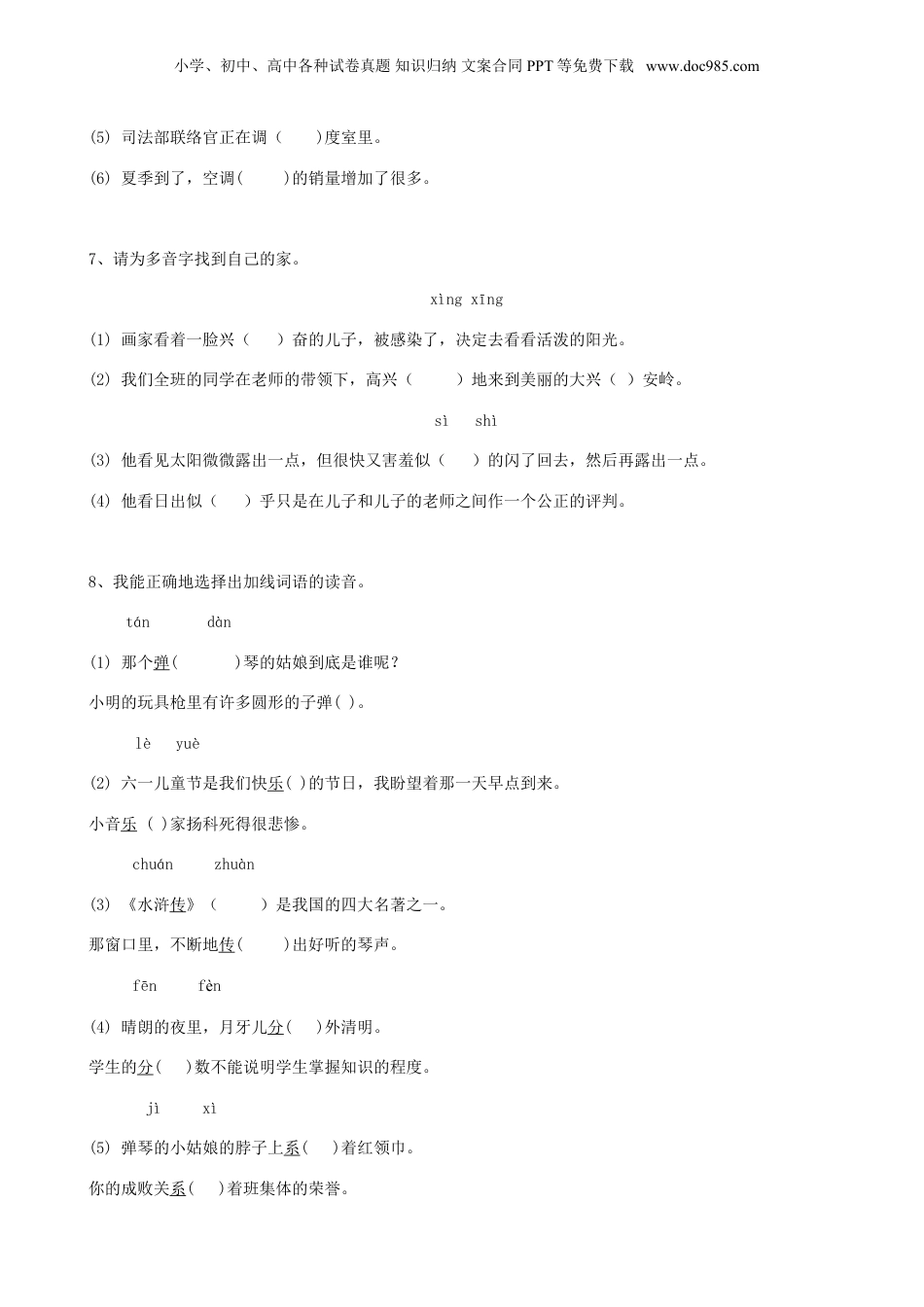 小学、初中、高中各种试卷真题知识归纳文案合同PPT等免费下载www.doc985.com1、我会在正确的读音下划横线。1、夜深了,我透过门缝(fénɡfènɡ)看到妈妈还在缝(fénɡfènɡ)衣服。2、小刚要转学了,宿舍(shěshè)里的同学都围着他,舍(shěshè)不得他走。2、选择正确的字音在下面画“____”。背(bēibei)书包教(jiàojiāo)室着(zháozhe)急3、给画线的多音字选择正确的读音,打“”表示。畜牲(chùxù)五行(xíngháng)少年(shàoshǎo)畜产(chùxù)外行(xíngháng)多少(shàoshǎo)4、给画线的字选择正确的读音,用“√”画出。大夫(dàdài)侮辱(rúrǔ)为难(nánnàn)敝国(bǐbì)囚犯(qiúqíu)临淄(zīzhī)5、多音字组词:难nàn()系xì()强qiáng()行háng()nán()jì()jiàng()xíng()6、给下面的多音字选择正确的读音。nánnàn(1)苏娜感觉到呼吸困难(),向因特网发出了呼救的信号。(2)桑恩看到苏娜的求救,并没有感到为难()。hángxíng(3)最近的电话在门外走廊里,可她已经不能行()走了。,(4)最近,银行()的储蓄额有了大幅度的增长。tiáodiào小学、初中、高中各种试卷真题知识归纳文案合同PPT等免费下载www.doc985.com(5)司法部联络官正在调()度室里。(6)夏季到了,空调()的销量增加了很多。7、请为多音字找到自己的家。xìngxīng(1)画家看着一脸兴()奋的儿子,被感染了,决定去看看活泼的阳光。(2)我们全班的同学在老师的带领下,高兴()地来到美丽的大兴()安岭。sìshì(3)他看见太阳微微露出一点,但很快又害羞似()的闪了回去,然后再露出一点。(4)他看日出似()乎只是在儿子和儿子的老师之间作一个公正的评判。8、我能正确地选择出加线词语的读音。tándàn(1)那个弹()琴的姑娘到底是谁呢?小明的玩具枪里有许多圆形的子弹()。lèyuè(2)六一儿童节是我们快乐()的节日,我盼望着那一天早点到来。小音乐()家扬科死得很悲惨。chuánzhuàn(3)《水浒传》()是我国的四大名著之一。那窗口里,不断地传()出好听的琴声。fēnfèn(4)晴朗的夜里,月牙儿分()外清明。学生的分()数不能说明学生掌握知识的程度。jìxì(5)弹琴的小姑娘的脖子上系()着红领巾。你的成败关系()着班集体的荣誉。小学、初中、高中各种试卷真题知识归纳文案合同PPT等免费下载www.doc985.comjīnjìn(6)紫禁()城是皇帝居住的地方。我禁()不住虔诚地、默默地祝福这个勤学苦练的弹琴姑娘。9、多音字组词尽jǐn()还hái()jìn()huán()10、多音字组词:模mó()强qiánɡ()mú()qiǎnɡ()11、多音字组词行xínɡ()好hǎo()hánɡ()hào()12、多音字组词。结jiē()长chánɡ()jié()zhǎnɡ()13、一字几个读音真神奇,请你给下面的多音字组词。鲜xiān()差chā()屏bǐng()xiǎn()chāi()píng()14、我会组词行xíng()háng()15、多音字组词:小学、初中、高中各种试卷真题知识归纳文案合同PPT等免费下载www.doc985.com和hé()hè()16、多音字组词钉dīng()栅zhà()钉dìng()栅shān()17、多音字组词磨mó()mò()18、多音字组词。干gàn()gān()19、多音字注音并组词。称()()挣()()()()()()20、多音字组词累lèi()léi()21、多音字组词。骨gū()gǔ()22、给多音字选择正确的读音,填入括号里。(填序号)(1)hǎo(2)hào小学、初中、高中各种试卷真题知识归纳文案合同PPT等免费下载www.doc985.com1.好学()爱好()好事()好强()(1)dàng(2)dāng2.当然()应当()当铺()当做()(1)xīng(2)xìng3.兴奋()高兴()兴致()绍兴()23、多音字组词背bēi()bèi()24、给多音字组词。难nán()摩mó()挨āi()难nàn()摩mā()挨ái()25、各就各位(多音字组词)shě()zhāo()xīng()qū()舍朝兴曲shè()cháo()xìng()qǔ()26、给多音字组词。(先写出拼音,再组词)()()()()()()少缝重()()()()()()27、我会给多音字组词。wèi()chuán()小学、初中、高中各种试卷真题知识归纳文案合同PPT等免费下载www.doc985.com为传wéi()zhuàn()28、我会给多...