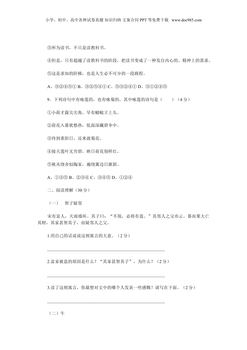 小学、初中、高中各种试卷真题知识归纳文案合同PPT等免费下载www.doc985.com小升初语文模拟试题一、语言积累与运用(40分)1.看拼音写词语。(6分)piānpìbiāozhìshēnqǐngdǐyùpáihuáimiǎoshì()()()()()()jīngzhànliáoliàngchúchuānglínglìshǎnshuòchèdǐ()()()()()()2.选字组词。(3分)(呐纳)____喊火柴____(梗便)气____(魂魄)(魅魁)____力(嘹缭)____亮(溶熔)____炼3.选词填空。(4分)描写描绘(1)这件艺术铜鼎深入细致地()了当时的风俗人情、桥梁建筑。(2)这部文学作品的第三章极细腻地()了江南的风土人情。体会体味(3)我亲身()到,一个国家、一座城市,能够举办一次奥运会,是一件了不起的事情。(4)从父亲讲的故事中,我()到了一份责任。4.根据前面的提示,把下列带“意”的词语补充完整。(6分)“小心注意”叫意;“任凭自己”叫意;“沾沾自喜”叫意;“任意妄为”叫意;“心情爽快”叫意;“心术不正”叫意。小学、初中、高中各种试卷真题知识归纳文案合同PPT等免费下载www.doc985.com5.修改病句。(6分)(1)杜甫是我国唐朝时期的伟大诗人。__________________________________________________(2)不管你信不信,事实才是事实。__________________________________________________(3)鲁班带着凿子、锯子、斧子、和木工用具去拜师学艺。__________________________________________________6.按要求填空。(4分)(1)写一句抒写思念故乡、怀念亲友的诗:_____________(2)写一句借月抒怀的诗:_____________(3)时间对每个人来说都是极其珍贵的,可是,王强就不这么认为,每当看到他沉迷于各种游乐中的时候,你真想对他说:______________________。(格言警句)(4)你认为教室里应张贴什么样的名言警句或千古佳句,请写两句。__________________________________________________________________________________________________________________________7.选择恰当的比喻,依次填入空格处。(4分)春联,是文学殿堂里的一枝奇葩,它发自于千人之心,出自于万人之手,各展其才,各显千秋,豪放_________,婉约_________,粗犷________,细腻________,洋洋洒洒,蔚为大观。如旭日喷薄似风拂扬柳如小桥流水若大江东去8.下面语句排列正确的一项是()(3分)①你才能真正懂得读书,学会读书。②读教科书,在基础知识和专业技能的学习中,当然是必需的。小学、初中、高中各种试卷真题知识归纳文案合同PPT等免费下载www.doc985.com③所为读书,不只是读教科书。④但是,只有超越了读教科书的阶段,把读书变成了一种发自内心的、精神上的需求。⑤这是求知的阶梯,也是人生必不可少的一段路程。A、③②④⑤①B、③②⑤④①C、⑤③②④①D、③①②④⑤9.下列诗句中有咏莲的,也有咏菊的,其中咏莲的诗句是()(4分)①小荷才露尖尖角,早有蜻蜓立上头。②荷花入暮犹愁热,低面深藏碧伞中。③待到重阳日,还来就菊花。④接天莲叶无穷碧,映日荷花别样红。⑤秋丛绕舍似陶家,遍绕篱边日渐斜。A、①③⑤B、②③④C、③④⑤D、①②④二、阅读理解(30分)(一)智子疑邻宋有富人,天雨墙坏。其子曰:“不筑,必将有盗。”其邻人之父亦云。暮而果大亡其财,其家甚智其子,而疑邻人之父。1.用自己的话说说这则寓言的大意。(2分)______________________________________________________2.富家被盗的原因是什么?“其家甚智其子”,为什么?(2分)______________________________________________________3.读了这则寓言,你最想对文中的哪个人发表一些感慨?请写在下面。(2分)______________________________________________________(二)牛小学、初中、高中各种试卷真题知识归纳文案合同PPT等免费下载www.doc985.com现在,我对牛是很熟悉的。第一,我就属牛。第二,我有只小铜牛,我非常喜欢它。我十岁生日那天,爷爷对我说:“今天是你的生日。你属牛,我就把这只小铜牛作为礼物送给你。”说完,就把一只金黄色的小铜牛递给了我。小铜牛好看极了。它有壮实的身骨,稳健的腿...