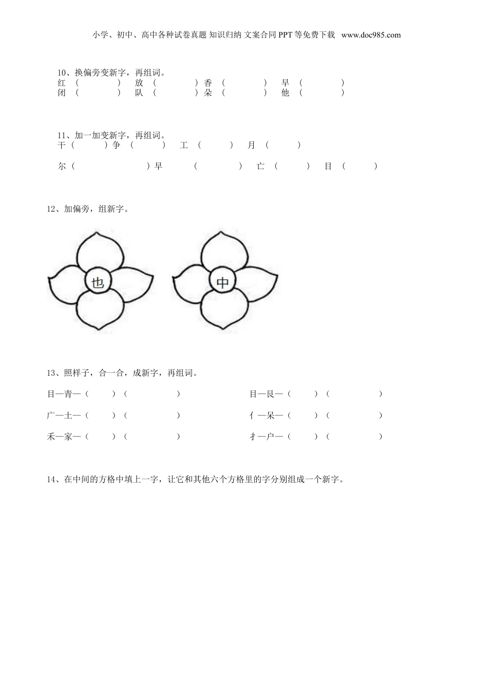 小学、初中、高中各种试卷真题知识归纳文案合同PPT等免费下载www.doc985.com1、加一笔,成新字。2、变一变。(1)“大”加一笔变成____________。(2)“白”去一笔变成____________。3、照样子,接着写。氵:清河()()()广:庄床()()()禾:稼和()()()4、你能写出带有“氵”的字吗?5、把下面的字加一笔,变成另一个汉字。小学、初中、高中各种试卷真题知识归纳文案合同PPT等免费下载www.doc985.com王——()今——()仕——()6、我会照样子写。园:()()军:()()海:()()地:()()7、写出带有下面部首的汉字。艹______________________________氵______________________________8、请把下列字工整地写在虚宫格里,再根据字的结构把朋友送回家。块坛央所坪英座排左右结构()上下结构()半包围结构()独体字()9、加一加,组成新字再组词语。小学、初中、高中各种试卷真题知识归纳文案合同PPT等免费下载www.doc985.com10、换偏旁变新字,再组词。红()放()香()早()闭()队()朵()他()11、加一加变新字,再组词。干()争()工()月()尔()早()亡()目()12、加偏旁,组新字。13、照样子,合一合,成新字,再组词。目—青—()()目—艮—()()广—土—()()亻—呆—()()禾—家—()()扌—户—()()14、在中间的方格中填上一字,让它和其他六个方格里的字分别组成一个新字。小学、初中、高中各种试卷真题知识归纳文案合同PPT等免费下载www.doc985.com15、猜字谜。田里跑到田外。()16、猜字谜。(1)上下挂钩。()(2)你我各一半。()17、按要求填空。18、2.仔细观察例子,再照样子写一写。亻(仔)(仔细)纟()()()()()()氵---主---注(注意)利寸兆支娄口向马牙巴贝禾生字项目清请晴情吵炒抄饱跑表示字义的部分表示字音的部分小学、初中、高中各种试卷真题知识归纳文案合同PPT等免费下载www.doc985.com()---()---()()()---()---()()19、给汉字加偏旁变新字,再组词。至()先()炎()云()亢()身()20、换偏旁,再组词。例:拉——(泣)(哭泣)治——()()健——()()尝——()()21、我会照样子写汉字。例:闹问闻闯闪信林消22、给下列汉字加偏旁组成新字,再组词。例:林——(麻)——(麻雀)中——()——()姑——()——()宿——()——()23、给汉字加偏旁变新字,再组词。令(冷)(寒冷)()曼()()()亥()()()奂()()()小学、初中、高中各种试卷真题知识归纳文案合同PPT等免费下载www.doc985.com24、想一想,填一填。25、照样子,写一写。26、我会照样子写一写。例:险-(阝)+(月)=脸斗+(扌)=(抖)津-()+()=()巾+()=()故-()+()=()各+()=()27、我会照样子加偏旁组字,再组词。小学、初中、高中各种试卷真题知识归纳文案合同PPT等免费下载www.doc985.com28、我会加偏旁组成新字再组词。半+(月)=(胖)(胖子)元+()=()斤+()=()()更+()=()29、加部首组成新字再组词。监:()()()()()()夜:()()()()()()夸:()()()()()()30、给下列字加上偏旁部首组成新字。兆:____________________白:____________________采:____________________主:____________________31、请写出带有下列部首的汉字。犭:________________________鸟:________________________口:________________________辶:________________________32、写出带有部首宝宝的字,再组成词语。33、把下面的字加上偏旁组成新字,写下来。士——()求——()示——()丁——()干——()工——()34、找朋友。小学、初中、高中各种试卷真题知识归纳文案合同PPT等免费下载www.doc985.com彡()()()饣()()()35、请将“氵”的汉字家族成员请出来。氵(流)()()()()()36、“木”字大家族还有哪些成员?请你试着把它们请来!木(树)()()()()()37、给“火”字大家族找朋友。火——(烟)——()()()()38、看图猜字。39、根据给出的部首写字。(至少三个)40、填一个部首,与周围的字组成新字。小学、初中、高中各种试卷真题知识归纳文案合同PPT等免费下载www.doc985.com41...