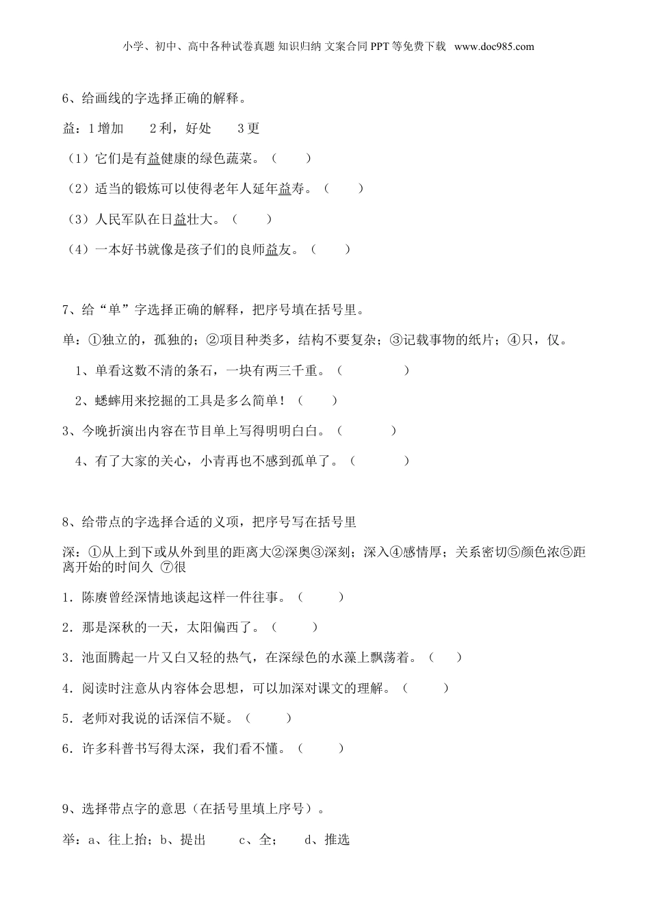 小学、初中、高中各种试卷真题知识归纳文案合同PPT等免费下载www.doc985.com1、给句子中带点的字选择恰当的解释。1.他骑在马上,心情老平静不下来。()A.陈旧的B.极、很C.总是D.年纪大2.他说着把腰一挺,做出个准备赛跑的姿势。()A.笔直B.撑直或凸出C.很D.量词3.陈赓同志回顾了自己的亲身经历。()A.回头看B.拜访C.照管或注意D.前来购物2、小小解说员(给加点字选择正确的解释)。抢A.夺,硬拿B.争先C.去掉表面的一层1.同学们都争先恐后地抢着回答问题。2.小偷把奶奶的钱包抢去了。3.我摔了一跤,右手抢去一块皮。3、给“迫”字选择合适的解释。迫:①逼,威胁②(十分)接近,靠近③急(1)时间紧迫,容不得你犹豫了。()(2)敌人的皮鞭也不能迫使江姐屈服。()(3)卖火柴的小女孩饥寒交迫,冻死在街头。()4、给画线字选择正确的解释,把序号写在括号里。首:①头。②首领。③首先。④第一;最高的。⑤量词,用于诗词等。小学、初中、高中各种试卷真题知识归纳文案合同PPT等免费下载www.doc985.com(1)今天我们学了两首古诗。()(2)国旗班的叔叔们昂首挺胸走过金水桥。()(3)这种产品在国内不是首创。()(4)老师提出问题后,小明首先举起了手。()(5)北京是全国的首都。()5、选择正确的意思填在下面的括号里。(1)手:①人上肢前端能拿东西的部分②拿着③技能,本领④小巧易拿⑤做某种事情或擅长某种技能的人养花能手()举手发言()工作手册()真有一手()(2)失:①没有掌握住②改变常态③错过④遗失⑤找不着⑥错误大惊失色()坐失良机()失物招领()过失()(3)异:①有分别,不相同②奇异,特别③惊奇,奇怪④另外的,别的⑤分开奇花异草()异口同声()诧异()异乡()(4)绝:①断绝②完全没有了,穷尽③走不通的,没有出路的④独一无二的,没有人能赶上的⑤极,最⑥绝对斩尽杀绝()绝处逢生()络绎不绝()绝大多数()(5)行:①能干②走③可以④做不管是什么人,谁向我们指出都行。()我们的卫星运行在预定的轨道上。()小学、初中、高中各种试卷真题知识归纳文案合同PPT等免费下载www.doc985.com6、给画线的字选择正确的解释。益:1增加2利,好处3更(1)它们是有益健康的绿色蔬菜。()(2)适当的锻炼可以使得老年人延年益寿。()(3)人民军队在日益壮大。()(4)一本好书就像是孩子们的良师益友。()7、给“单”字选择正确的解释,把序号填在括号里。单:①独立的,孤独的;②项目种类多,结构不要复杂;③记载事物的纸片;④只,仅。1、单看这数不清的条石,一块有两三千重。()2、蟋蟀用来挖掘的工具是多么简单!()3、今晚折演出内容在节目单上写得明明白白。()4、有了大家的关心,小青再也不感到孤单了。()8、给带点的字选择合适的义项,把序号写在括号里深:①从上到下或从外到里的距离大②深奥③深刻;深入④感情厚;关系密切⑤颜色浓⑤距离开始的时间久⑦很1.陈赓曾经深情地谈起这样一件往事。()2.那是深秋的一天,太阳偏西了。()3.池面腾起一片又白又轻的热气,在深绿色的水藻上飘荡着。()4.阅读时注意从内容体会思想,可以加深对课文的理解。()5.老师对我说的话深信不疑。()6.许多科普书写得太深,我们看不懂。()9、选择带点字的意思(在括号里填上序号)。举:a、往上抬;b、提出c、全;d、推选小学、初中、高中各种试卷真题知识归纳文案合同PPT等免费下载www.doc985.com举例()举世闻名()举目()10、给加点字选择正确的解释。径:A.小路,亦指道路、方法;B.直,直捷了当;C.数学上指连接圆心和圆周的直线。(1)生气的明明没有理睬跟在身后的妈妈,径直向前跑去。()(2)在飓风的扫荡后,直径达3米的树被连根拔起。()(3)在学习上要脚踏实地,不可走捷径。()孤:A.幼年死去父亲或父母双忘;B.单独;C.古代帝王的自称;D.古同“辜”,辜负。(4)家人的关爱,朋友的关心,让我们不再孤独。()(5)汶川大地震让许多孩子失去了父母,成为孤儿。()(6)君名孤寡。()11、给加点的词语选择正确的解释,写在()里。断:A.分成两段或几段;B.断绝,隔绝;C.拦...