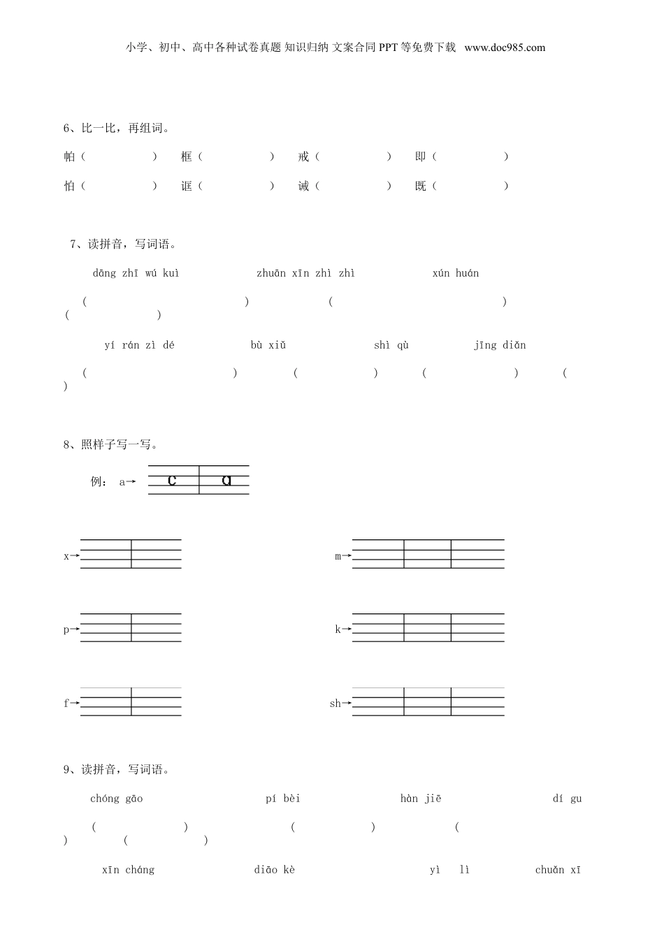 小学、初中、高中各种试卷真题知识归纳文案合同PPT等免费下载www.doc985.com1、火眼金睛。下面四组词语中正确的一组是()。A.暴动暴发暴炸爆竹B.边塞寒冷寨主堵塞C.绞通骄艳摔跤绞尽脑汁2、我会在正确的读音下划横线。1、夜深了,我透过门缝(fénɡfènɡ)看到妈妈还在缝(fénɡfènɡ)衣服。2、小刚要转学了,宿舍(shěshè)里的同学都围着他,舍(shěshè)不得他走。3、一锤定音。给加点字选择正确的读音,将序号写在括号里。(1)A.chāiB.chā出差()邮差()差()别(2)A.xiàoB.jiào学校()校()对校()风(3)A.liángB.liàng量()力而行测量()估量()4、给下面句子的加线字选择恰当的解释。A.食物烧到可吃的程度。B.植物的果实等长成。C.熟练。D.常用或常见,知道清楚。E.经过加工炼制的。(1)熟能生巧,红红的打字速度越来越快了。()(2)这个铲子是用熟铁做的。()(3)到家时,妈妈已把饭做熟了。()(4)到九十月份,人们最喜爱的葡萄成熟了。()(5)我和明明是同班同学,彼此很熟。()5、区分组词。催()爆()葡()堂()摧()暴()匍()膛()小学、初中、高中各种试卷真题知识归纳文案合同PPT等免费下载www.doc985.com6、比一比,再组词。帕()框()戒()即()怕()诓()诫()既()7、读拼音,写词语。dāngzhīwúkuìzhuānxīnzhìzhìxúnhuán()()()yíránzìdébùxiǔshìqùjīngdiǎn()()()()8、照样子写一写。例:a→x→m→p→k→f→sh→9、读拼音,写词语。chónggāopíbèihànjiēdígu()()()()xīnchángdiāokèyìlìchuǎnxī小学、初中、高中各种试卷真题知识归纳文案合同PPT等免费下载www.doc985.com()()()()10、读拼音,写词语:Shǒubìcuòzhékǔnbǎngjièshíshīfu()()()()()Sīxīnlièfèikègǔmíngxīnzhǎnzhuǎnténgnuó()()()11、辨字组词,请看清楚哦!侍()牌()隔()篇()待()脾()融()遍()12、辨字组词,请看清楚哦!赖()牌()哲()缝()租()懒()脾()暂()逢()祖()13、看拼音,写词语。zhànyìlǚcìxīshēnɡbàochóuguīdìnɡ()()()()()14、我能仔细辩别,准确组词。概()霄()既()zhēng()扎慨()屑()即()zhēng()取15、比一比再组词:崇()峻()砖()仗()小学、初中、高中各种试卷真题知识归纳文案合同PPT等免费下载www.doc985.com踪()俊()传()杖()16、初读课文,给多音字注音并组词。难________()()累________()()________()()________()()17、字义我知道。查字典解释下列加点的字。掸掸翅膀:________________________渗出:________________________松脂:____________________________黏稠:________________________18、按照部首查字法的要求查下列字。(1)“疮”应查________部,再查________画,组词________。(2)“哙”应查________部,再查________画。19、拼写小擂台。给下列多音字注音并组词。单chán()和hé()调tiáo()dān()huo()diào()20、拼写小擂台。看拼音,写词语。dòngjiāngyǐkàoxíjīèlièsùxiàng()()()()()hūxiàocánkùbīngtuóliǎngsāimiányī()()()()()21、趣味汉字。给下面的字换一个偏旁,组成一个新字,再组词。例像好像洼_______锅_______优_______小学、初中、高中各种试卷真题知识归纳文案合同PPT等免费下载www.doc985.com橡橡胶______________________________________22、比一比,口头再组词:认()准()先()队()难()失()23、给下面的字加上一部首变成一个新字。同—()青—()各—()人—()见—()及—()24、我会写笔顺ɑ()o()i()ü()e()u()y()w()25、我会组词。26、我会填。小学、初中、高中各种试卷真题知识归纳文案合同PPT等免费下载www.doc985.com27、区别字组词。旅()泄()厢()抹()旋()世()箱()沫()28、区别字组词。脆()芳()菲()酒()诡()访()诽()洒()29、写出带有下列偏旁的生字并组成词语。30、我会归类(根据加粗字的读音将词语归类)答应应该反应应用应试应当yīng()yìng()小学、初中、高中各种试卷真题知识归纳文案合同PPT等免费下载www.doc985.com3...