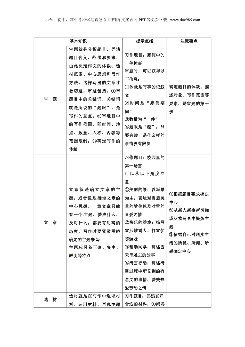 小学、初中、高中各种试卷真题知识归纳文案合同PPT等免费下载www.doc985.com基本知识提示点拨注意要点审题审题就是分析题目,弄清题目含义、范围和要求,由此决定作文的体裁、选材范围、中心思想和写作方法,这样写出的文章才会切题。审题包括:①审题目中的关键词,关键词就是所说的“题眼”,是写作的重点;②审题目中的写作范围,即时间、地点、数量、人称、内容等范围限制;③确定写作的体裁习作题目:寒假中的一件趣事审题时,可以获得以下信息:①体裁是写事的记叙文[来源:学#科#网Z#X#X#K]②时间是“寒假期间”③数量为“一件”④题眼是“趣”,只要有趣,是什么样的事情没有限制确定题目的体裁、描述对象、写作范围等要素,是审题的第一步立意立意就是确立文章的主题,或者说是确定文章的中心思想。一篇文章只能有一个主题,赞成什么,反对什么,都要有明确的态度,写作时要紧紧围绕确定的主题来写[来源:学科网]主题应具备正确、集中、鲜明等特点习作题目:校园里的第一场雪可以从以下角度立意:①美丽的景:以写景为主,表达对雪后美景的赞美以及对雪的喜爱之情②快乐的游戏:描写雪后堆雪人、打雪仗等游戏③帮助同学:讲述雪天里难忘的故事④清雪行动:讲述清雪过程中所见到的有意义的事情,赞美热爱劳动之情①根据题目要求确定中心②从新人新事新风尚或状物写景中提炼主题③依据自己对现实生活的所见、所闻、所感确定中心[来源:学科网ZXXK]选材选材就是在写作中选取材料、运用材料,再现主题习作题目:妈妈真怪合适的材料:①妈妈小学、初中、高中各种试卷真题知识归纳文案合同PPT等免费下载www.doc985.com的过程。材料就是文章的内容,直接关系着主题的表达。因此选材必须注意三点:①选材要围绕文章中心,与中心无关的材料要去除;②选取的材料要真实可信,不可随意夸张,更不可胡编乱造,无中生有;③选取的材料要新颖、典型,能够反映人或事物的个性特点,不落俗套不爱打扮,每天在家里埋头设计图案;②妈妈忘性大,总是忘记我的生日;③单位里分给妈妈新房子,妈妈将它让给了要结婚的年轻叔叔不合适的材料:①妈妈性格直爽,说话声音大;②妈妈很孝敬爷爷奶奶;③妈妈最近在学电脑习作时需要对生活中的材料进行适当取舍、剪裁、扩充,在生活的基础上进行加工结构安排文章的结构就是组织安排材料,先写什么,后写什么;哪些先说,哪些后说;哪些详写,哪些略写;怎样开头,怎样结尾,怎样过渡等。安排材料常见的方法有:①按事情发展的顺序安排材料,适合于叙事、活动类文章,一般有顺叙、倒叙、插叙几种;②按时间顺序安排材料,适合时间性很强的文章;③按空间顺序安排材料,游记、参观访问记以及描写静物、场所和环境的文章多采用这种方法;④按事物的几个方面安排材料,说明文和用几件事写人的文章多采用这种方法习作题目:难忘的一件事习作提纲:主要内容:我的脚扭伤,周丽照顾我主题:关心同学、急人所急结构安排:(1)在练习跳绳时,我扭伤了脚。(略)(2)周丽同学热心照顾我。(重点段)[来源:Z*xx*k.Com]①周丽把我扶到她的家。(次详)②周丽给我洗脚,喷“好得快”。(详)③我好了一些,周丽又小心地搀我回家。(次详)(3)我十分感动,至今记忆犹新。(略,点题)调动自己掌握的材料,进行取舍安排、设计,初步形成一篇作文的大致轮廓,既包括打草稿,也包括拟定提纲小学、初中、高中各种试卷真题知识归纳文案合同PPT等免费下载www.doc985.com语言①要准确达意。要求把话说对,表达准确到位,合乎情理;②要具体形象。一般来说,描写事物的声音、色彩、形状等的词语,是具体形象的;③适当运用各种修辞手法,如比喻、拟人、夸张、排比等如:“他累了。”这是一句非常简单,难以给读者留下深刻印象的句子,我们可以通过“看”“听”[来源:学科网ZXXK]“感”描写“他”的形象,通过修辞的运用,通过采用恰当的动词、形容词来让这句话具体形象,生动可感:我看见他额前的碎发被汗湿了,粘在脸上,听见他呼吸的声音越来越重,像拉动风箱一样语言通顺、流畅是基本要求,要想使作文的语言富有表现力,就要多角度去描写,写外形,写声音,写给人的感受,注意运用修辞,运用词语来使句子丰富起来
