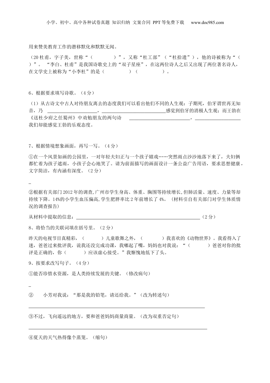 小学、初中、高中各种试卷真题知识归纳文案合同PPT等免费下载www.doc985.com小升初语文试卷一、基础知识积累与运用(38分)1、根据拼音写汉字,并按要求答题。(12分)húlúntǎntèwù()吞枣()不安恍然大()rǎngrǎngjūcǎi熙熙()不()一格兴高()烈同音字:quán:()愈()缩()势依次写出第一行词语的近义词:依次写出第二行词语的反义词:2、根据前面的提示,把下列带“手”的成语补充完整。(3分)形容极为兴奋()形容医术高明()形容重归于好()形容十分喜爱()形容情深如兄弟()形容做事机警、敏捷()3、下列选项恰当的一项是()(2分)A、“返璞归真、亭亭玉立、形色匆匆”这三个词中有两个错别字。B、刚劲、狂风怒号、含情脉脉、埋怨加点的字都是多音字。C、“饱经风霜”与“饱览群书”中的“饱”字意思不一样。D、“张灯结彩、目瞪口呆、姹紫嫣红、怒目圆睁”都是含有近义词的成语。4、在横线上填上恰当的语句。(2分)①君子一言——②不入虎穴——③——死而后已④——不能动人。5、按要求填空。(3分)(1)我们常用杜甫的《春夜喜雨》中“,”这两句诗来形容春雨,也通常被小学、初中、高中各种试卷真题知识归纳文案合同PPT等免费下载www.doc985.com用来赞美教育工作的潜移默化和默默无闻。(20杜甫,字子美,世称“()”,又称“杜工部”(“杜拾遗”),他的诗被称为“()”。“李白、杜甫”是我国诗歌史上的“双子星座”,在这两位诗人之后又出现了两位著名诗人,在文学史上被称为“小李杜”的是()()。6、根据要求填写诗歌。(4分)(1)从古诗文中古人对待朋友离去的态度我们可以看出他们不同的人生观:子期死,伯牙谓世再无知音,乃,感觉到伯牙的消极人生观;而王勃在《送杜少府之任蜀州》中劝勉朋友的两句诗,我们却能感觉王勃的乐观态度。7、根据情境想象画面,再写一写。(4分)①在一个风景如画的公园里,一对年轻夫妇正与一个孩子嬉戏……突然雨点沙沙地落下来了,夫妇俩都忙着为孩子遮雨,小孩子会心地笑了。请为前面描写的画面设计一条公益广告用语,要求思想健康,文字简洁,有内涵有深度。(2分)②根据有关部门2012年的调查,广州市学生身高、体重、胸围等持续增长,但肺活量、速度、力量等却持续下降。14%的小学生血压偏高,学生肥胖率比2年前增长了4%。(材料引自有关部门对学生体质情况的调查报告)从材料中提取的信息:(2分)8、将恰当的关联词填在括号里。(2分)昨天的电视节目真精彩,()儿童歌舞之外,()我喜欢的《动物世界》。我看得入了迷,爸爸过来批评我,说我还没完成功课,我嘟起了嘴,妈妈也对我说:“()爸爸对你的批评是正确的,你()应该虚心接受。”我惭愧地低下了头。9、按要求改写句子。(4分)①能否珍惜水资源,是人类持续发展的关键。(修改病句)②小芳对我说:“那是我的铅笔,请还给我。”(改为转述句)③不过,飞向遥远的地方,要和爸爸妈妈商量商量。(改为双重否定句)④夏天的天气热得像个蒸笼。(缩句)小学、初中、高中各种试卷真题知识归纳文案合同PPT等免费下载www.doc985.com10、按要求填空。(2分)①写出下列作品的作者。(1分)《绿山墙的安妮》()《战争与和平》()②根据谜面猜成语。(1分)1×1=1()12345609()二、阅读下面文章,按要求回答问题。(20分)精神救助张莉我一直以为自己是个善解人意的人,在别人需要的时候,能解囊相助。可是,一个没坐过火车,没看过电视,连50元人民币都没见过的山村小女孩,面对我的盛情邀请,竟然对城市的繁华不感兴趣。那年,我在瓦房店乡百车沟小学采访一位小学教师时,有一个小女孩从门缝里看了我好久,我笑,她也笑。老师介绍说,她叫范春芳,好学生。家里爸爸傻,妈妈哑,生活可困难了。两次辍学,她又靠养鹅、采药卖钱,回到了学校。后来我们结交成了朋友。夏天,在女儿的催促下,我接她来沈阳度假。我们登电视塔,逛公园,吃烧烤,唱卡拉OK,她却木然。一路上总是问我:“阿姨,妹妹的旧书能给我几本吗?”“那当然,你头一次来市里,玩够了再说。”她只好不作声。晚上,我和女儿的说话声、电视的吵闹声都没能转移她的注意力。她先把...
