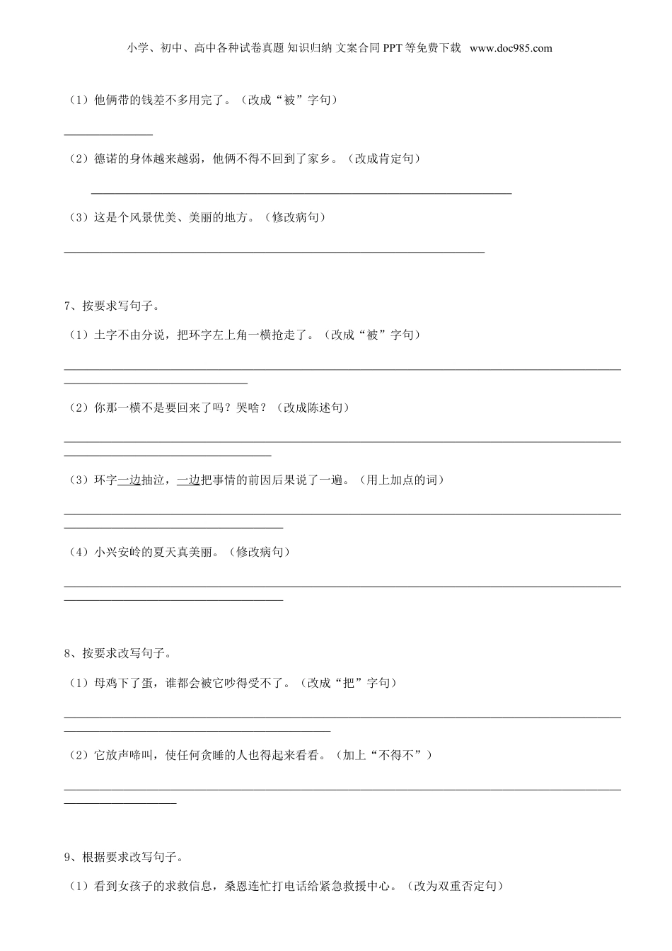 小学、初中、高中各种试卷真题知识归纳文案合同PPT等免费下载www.doc985.com1、单选。下面哪一句是疑问句?A.这样标致的人物,有谁不喜欢呢?B.小胖墩儿膀大腰粗,小嘎子怎能扳倒他?C.你莫不是还有两个亲人不曾见面?2、以下句子中与其他三句意思不同的是第几句?A.你觉得和田维吾尔姑娘漂亮吗?B.难道你觉得和田维吾尔姑娘不漂亮吗?C.你不会不觉得和田维吾尔姑娘是漂亮的吧?D.你一定觉得和田维吾尔姑娘很漂亮。3、给下面句子中的破折号选择正确用法,并把序号填在()里。A.表示意思的递进。B.表示后者是前者的解释或说明。C.表示声音的延续。D.表示意思的转折。1.“汪——汪——汪”从屋里传来狗叫声。()2.大家要精心保护地球——人类的家园。()3.训练动物是很有意思的——猴子的动作多么像人啊!()4.我告诉妹妹,这本《词语手册》花了十五元钱——以后,看书读报,不理解的词语,查一查就知道它的意思了。()4、给下面句中引号的作用选择正确的答案。A用于直接引用的部分B用于具有特殊含义的词语C用于特定的称谓1人们称之为“韦编三绝”。()2一听“烤白薯哇真热乎”,就非买上一块不可。()3父亲教我在石板上甩出“糖风”来。()4父亲的认真劲儿,在卖糖葫芦的人当中出了名,人称“小辫糖四”。()5、用连线标出省略号在句子中的作用。1.那……我们还是……等在这儿吧。A、表示话未说完2、老师说:“同学们,让我们开始上课……”B、表示列举的省略3、荒滩,沟渠,山坡,公路……C、表示说话断断续续6、按要求写句子。小学、初中、高中各种试卷真题知识归纳文案合同PPT等免费下载www.doc985.com(1)他俩带的钱差不多用完了。(改成“被”字句)(2)德诺的身体越来越弱,他俩不得不回到了家乡。(改成肯定句)(3)这是个风景优美、美丽的地方。(修改病句)7、按要求写句子。(1)土字不由分说,把环字左上角一横抢走了。(改成“被”字句)(2)你那一横不是要回来了吗?哭啥?(改成陈述句)(3)环字一边抽泣,一边把事情的前因后果说了一遍。(用上加点的词)(4)小兴安岭的夏天真美丽。(修改病句)8、按要求改写句子。(1)母鸡下了蛋,谁都会被它吵得受不了。(改成“把”字句)(2)它放声啼叫,使任何贪睡的人也得起来看看。(加上“不得不”)9、根据要求改写句子。(1)看到女孩子的求救信息,桑恩连忙打电话给紧急救援中心。(改为双重否定句)小学、初中、高中各种试卷真题知识归纳文案合同PPT等免费下载www.doc985.com(2)世界上没什么困难是克服不了的。(改为肯定句)10、根据要求改写句子。(1)燕子停在电线竿上,像一个个音符。(缩句)__________________________________。(2)武松道:“这可奇怪了!你如何不肯卖酒给我吃?”(改为陈述句)__________________________________。11、照样子,改句子。天空中的云雀叫得真动听。云雀在天空中的叫得真动听。(1)井里的青蛙抬头看着天空。____________________________________________________________________(2)树叶上的小水珠滚来滚去。____________________________________________________________________12、照样子,改写句子。例:爸爸的爱让我怦然心动。爸爸的爱怎么能不让我怦然心动?爸爸的爱不能不让我怦然心动。(1)高粱的全身具有鲜明的个性。(2)作为学生,我们听从老师的教导。小学、初中、高中各种试卷真题知识归纳文案合同PPT等免费下载www.doc985.com13、根据提示改写句子,不改变句意。1.“我知道苹果里面是什么。”我说。我说:“。”2.儿子说:“爸爸,我要让您看看里头藏着什么。”“。”儿子说。“,”儿子说,“。”14、魅力标点。1.突然他看见了坐在第一排的我噢新来了一个外国学生你好欢迎你来听我的课你叫什么名字哪个国家的2.他在绘画音乐方面也有着惊人的才能同时他对一些事情又特别健忘15、按要求写句子。1.这不是您最宝贵的画吗?改为陈述句:2.桂花盛开的时候非常香。改为夸张句:16、按要求改写下面的句子。(1)过了半个世纪的舞台生活以后,在66岁的高龄,他仍然能创造出这样富有朝气的美丽形象,仍然能表现出这样充沛的青春活力,这不能不说是...