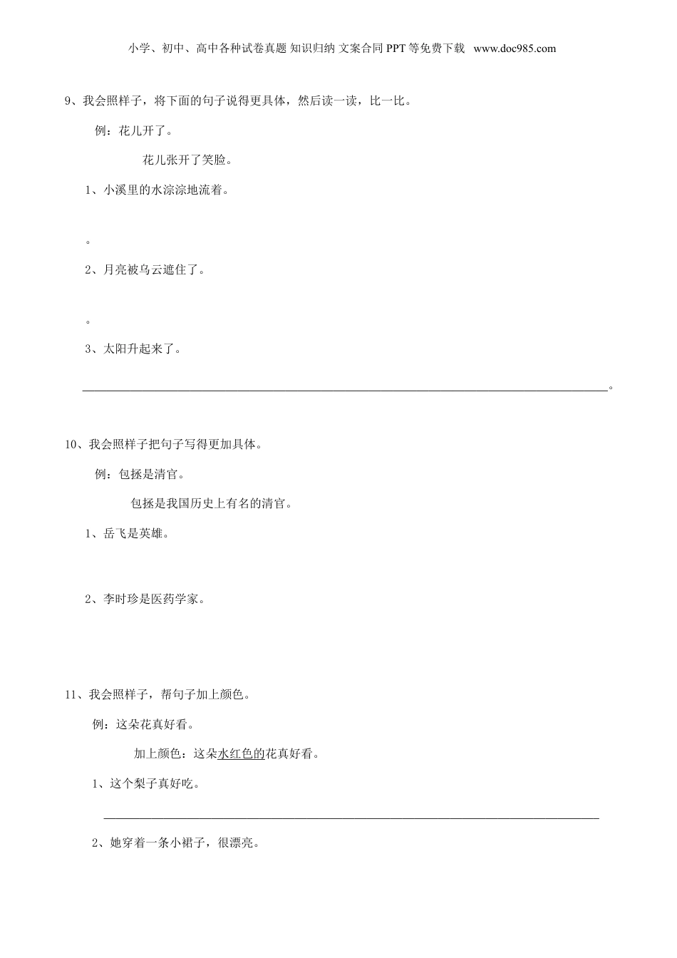 小学、初中、高中各种试卷真题知识归纳文案合同PPT等免费下载www.doc985.com1、下列各句与下面的话衔接最恰当的一句是()生产衬衫的关键工序是上领子和上袖子。二厂和三厂这两家衬衫厂各有所长,_____________________________________A.二厂上领子的技术比三厂强,三厂上袖子的技术比二厂强。B.三厂上领子的技术没有二厂好,上袖子的技术比二厂强。C.三厂上领子的技术没有二厂好,二厂上袖子的技术没有三厂强。D.二厂上领子的技术比三厂强,上袖子的技术没有三厂强。2、选择正确的答案。(1)凡卡在给爷爷的信中回忆了乡下的生活,是因为()。A.乡下的生活很幸福。B.乡下的生活虽然很艰难,但在凡卡看来,和爷爷在一起生活是那么自由、欢乐,那么值得怀念。(2)课文的结尾,写凡卡做美梦,是为了说明()。A.凡卡寄出信后非常高兴。B.凡卡十分想念他的爷爷。C.在沙皇统治下的资本主义社会,凡卡追求自由生活的愿望只能是个梦,永远不能实现。3、用:处处“造句。处处:4、用下面的成语造句。一望无际三顾茅庐六神无主九霄云外5、请用下列所给的词语造句。朋友__________________________________________。品味__________________________________________。小学、初中、高中各种试卷真题知识归纳文案合同PPT等免费下载www.doc985.com6、照样子扩句。例:一位母亲抱着一个小孩。一位年轻的母亲抱着一个出生不久的小孩。(1)树上有小鸟。(2)我们去爬山。7、把下面的句子补充完整:(1)热心帮助同学。________________________________________________________________(2)在天空飞得又高又快。________________________________________________________________(3)我们在小河里。________________________________________________________________8、按要求写句子。1.我每天按时完成各科作业和语文作业。(修改病句)_____________________________________________________________________2.3点钟不到,我们就沿着崎岖的山路登上清凉台。(缩句)_____________________________________________________________________3.朝阳腾空而出。(扩句)_____________________________________________________________________4.风把云块向我们推来,越来越近,简直伸手可捉。(改为“被”字句)_____________________________________________________________________小学、初中、高中各种试卷真题知识归纳文案合同PPT等免费下载www.doc985.com9、我会照样子,将下面的句子说得更具体,然后读一读,比一比。例:花儿开了。花儿张开了笑脸。1、小溪里的水淙淙地流着。。2、月亮被乌云遮住了。。3、太阳升起来了。。10、我会照样子把句子写得更加具体。例:包拯是清官。包拯是我国历史上有名的清官。1、岳飞是英雄。2、李时珍是医药学家。11、我会照样子,帮句子加上颜色。例:这朵花真好看。加上颜色:这朵水红色的花真好看。1、这个梨子真好吃。2、她穿着一条小裙子,很漂亮。小学、初中、高中各种试卷真题知识归纳文案合同PPT等免费下载www.doc985.com3、春天里,桃花开了。12、照样子,把句子写得更好些。例:早晨,彩霞染红了天空。早晨,(美丽的)彩霞染红了天空。1、公鸡垂下翅膀。。2、大哥哥牵着小狗。。13、按要求,写句子。(1)黄山的松树挺秀坚劲。(改为拟人句)_____________________________________________(2)瀑布挂在岩壁上。(扩句)_____________________________________________(3)黄山的松树也许是吃石髓而长大起来的吧?(改为陈述句)(4)如果这株松树长在悬崖旁边,一面靠近岩壁,一面向着空中,那么它的枝条就全部向空中生长。(用带点的词造句)14、按要求改写句子。(1)它伤痕累累,树干上有被火烧伤的痕迹。树冠仍然茂盛。(用关联词连成一句话)(2)我游览着天山。(扩句)15、按要求改写句子。(1)我就不信,五尺的汉子还捂不熟一块地,养不活一棵树?(改成肯定句)小学、初中、高中各种试卷真题知识归纳文案合同PPT等免费下载www.doc985.com(2)它伫立在最前端。(扩句)16、按要求改写句子。(1)在我满头大汗的时候,有一...