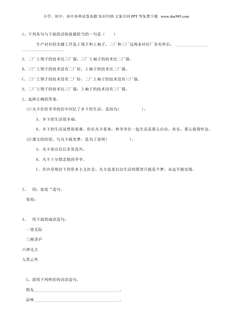 小学、初中、高中各种试卷真题知识归纳文案合同PPT等免费下载www.doc985.com1、下列各句与下面的话衔接最恰当的一句是()生产衬衫的关键工序是上领子和上袖子。二厂和三厂这两家衬衫厂各有所长,_____________________________________A.二厂上领子的技术比三厂强,三厂上袖子的技术比二厂强。B.三厂上领子的技术没有二厂好,上袖子的技术比二厂强。C.三厂上领子的技术没有二厂好,二厂上袖子的技术没有三厂强。D.二厂上领子的技术比三厂强,上袖子的技术没有三厂强。2、选择正确的答案。(1)凡卡在给爷爷的信中回忆了乡下的生活,是因为()。A.乡下的生活很幸福。B.乡下的生活虽然很艰难,但在凡卡看来,和爷爷在一起生活是那么自由、欢乐,那么值得怀念。(2)课文的结尾,写凡卡做美梦,是为了说明()。A.凡卡寄出信后非常高兴。B.凡卡十分想念他的爷爷。C.在沙皇统治下的资本主义社会,凡卡追求自由生活的愿望只能是个梦,永远不能实现。3、用:处处“造句。处处:4、用下面的成语造句。一望无际三顾茅庐六神无主九霄云外5、请用下列所给的词语造句。朋友__________________________________________。品味__________________________________________。小学、初中、高中各种试卷真题知识归纳文案合同PPT等免费下载www.doc985.com6、照样子扩句。例:一位母亲抱着一个小孩。一位年轻的母亲抱着一个出生不久的小孩。(1)树上有小鸟。(2)我们去爬山。7、把下面的句子补充完整:(1)热心帮助同学。________________________________________________________________(2)在天空飞得又高又快。________________________________________________________________(3)我们在小河里。________________________________________________________________8、按要求写句子。1.我每天按时完成各科作业和语文作业。(修改病句)_____________________________________________________________________2.3点钟不到,我们就沿着崎岖的山路登上清凉台。(缩句)_____________________________________________________________________3.朝阳腾空而出。(扩句)_____________________________________________________________________4.风把云块向我们推来,越来越近,简直伸手可捉。(改为“被”字句)_____________________________________________________________________小学、初中、高中各种试卷真题知识归纳文案合同PPT等免费下载www.doc985.com9、我会照样子,将下面的句子说得更具体,然后读一读,比一比。例:花儿开了。花儿张开了笑脸。1、小溪里的水淙淙地流着。。2、月亮被乌云遮住了。。3、太阳升起来了。。10、我会照样子把句子写得更加具体。例:包拯是清官。包拯是我国历史上有名的清官。1、岳飞是英雄。2、李时珍是医药学家。11、我会照样子,帮句子加上颜色。例:这朵花真好看。加上颜色:这朵水红色的花真好看。1、这个梨子真好吃。2、她穿着一条小裙子,很漂亮。小学、初中、高中各种试卷真题知识归纳文案合同PPT等免费下载www.doc985.com3、春天里,桃花开了。12、照样子,把句子写得更好些。例:早晨,彩霞染红了天空。早晨,(美丽的)彩霞染红了天空。1、公鸡垂下翅膀。。2、大哥哥牵着小狗。。13、按要求,写句子。(1)黄山的松树挺秀坚劲。(改为拟人句)_____________________________________________(2)瀑布挂在岩壁上。(扩句)_____________________________________________(3)黄山的松树也许是吃石髓而长大起来的吧?(改为陈述句)(4)如果这株松树长在悬崖旁边,一面靠近岩壁,一面向着空中,那么它的枝条就全部向空中生长。(用带点的词造句)14、按要求改写句子。(1)它伤痕累累,树干上有被火烧伤的痕迹。树冠仍然茂盛。(用关联词连成一句话)(2)我游览着天山。(扩句)15、按要求改写句子。(1)我就不信,五尺的汉子还捂不熟一块地,养不活一棵树?(改成肯定句)小学、初中、高中各种试卷真题知识归纳文案合同PPT等免费下载www.doc985.com(2)它伫立在最前端。(扩句)16、按要求改写句子。(1)在我满头大汗的时候,有一...