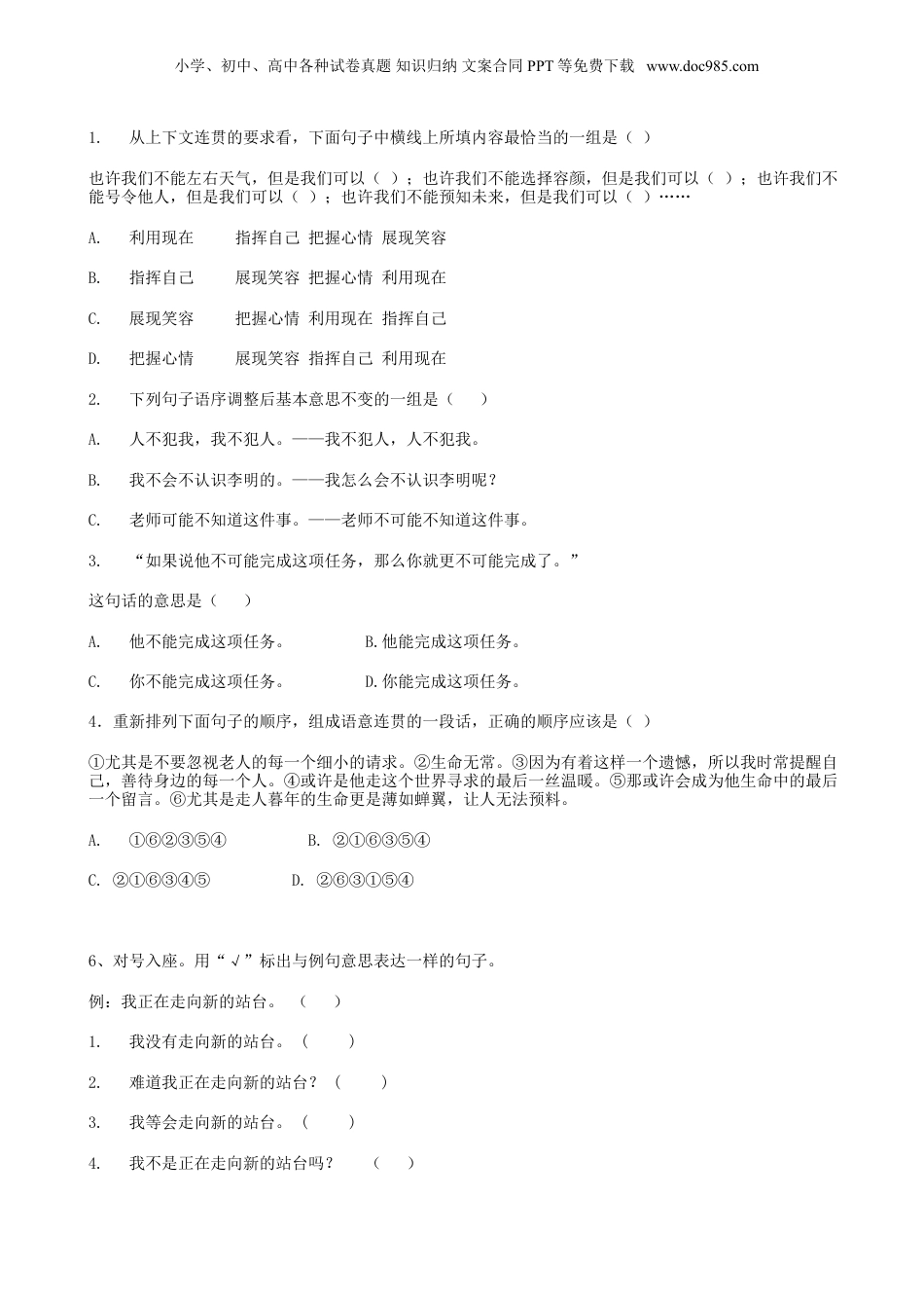小学、初中、高中各种试卷真题知识归纳文案合同PPT等免费下载www.doc985.com1、读句子,选择正确的答案。“谁都有生活的权利,谁都可以创造一个属于自己的缤纷世界。”这句话的意思是()A.只要你拥有一个健康的体魄,你就会创造出一个精彩的世界。B.只要你热爱生活,你就会拥有一个健康的体魄,精彩的人生。C.无论你是否拥有健康的体魄,只要你热爱生活、热爱生命,就一定能创造出一个属于自己的春天,编织出一个属于自己的五彩斑斓的世界。2、判断语气A惊讶B怀疑C肯定D谦虚E询问1、“是吗?”“你真有这样的本事?”()2、“大王,我不用箭,只要一拉弓,这只大雁就能掉下来。”()3、我现在已经是一家公司的董事长了。()3、说说句子中的引号作用。A.表示引用;B.直接引用所说的话;C.表示特殊含义,需要强调;D.表示讽刺或否定。(1)这是评委们精心设计的“圈套”。()(2)古人对写文章有两个基本要求,叫做“有物有序”。()4、读句子,选择正确的答案。1.“起初,峡里只能感觉到它蒙眬的青光,和黄昏连在一起;而不知在什么时候,它忽然出现在山上。”这句话意思是(1)月亮出现的时间不确定,估计不准。(2)山太高,挡住了月亮,看见时,它和山崖贴得那样近。(3)作者一时没有注意看,月亮很快便升到了山顶。2.长江平静而轻缓地流淌,变得有如一条明亮的小溪。这是因为(1)长江到这里便窄了,像小溪一样。(2)长江平缓流淌像小溪一样。(3)长江两边都是黑色的山崖的倒影,只剩江心是光亮的,像一条小溪。5、对号入座。小学、初中、高中各种试卷真题知识归纳文案合同PPT等免费下载www.doc985.com1.从上下文连贯的要求看,下面句子中横线上所填内容最恰当的一组是()也许我们不能左右天气,但是我们可以();也许我们不能选择容颜,但是我们可以();也许我们不能号令他人,但是我们可以();也许我们不能预知未来,但是我们可以()……A.利用现在指挥自己把握心情展现笑容B.指挥自己展现笑容把握心情利用现在C.展现笑容把握心情利用现在指挥自己D.把握心情展现笑容指挥自己利用现在2.下列句子语序调整后基本意思不变的一组是()A.人不犯我,我不犯人。——我不犯人,人不犯我。B.我不会不认识李明的。——我怎么会不认识李明呢?C.老师可能不知道这件事。——老师不可能不知道这件事。3.“如果说他不可能完成这项任务,那么你就更不可能完成了。”这句话的意思是()A.他不能完成这项任务。B.他能完成这项任务。C.你不能完成这项任务。D.你能完成这项任务。4.重新排列下面句子的顺序,组成语意连贯的一段话,正确的顺序应该是()①尤其是不要忽视老人的每一个细小的请求。②生命无常。③因为有着这样一个遗憾,所以我时常提醒自己,善待身边的每一个人。④或许是他走这个世界寻求的最后一丝温暖。⑤那或许会成为他生命中的最后一个留言。⑥尤其是走人暮年的生命更是薄如蝉翼,让人无法预料。A.①⑥②③⑤④B.②①⑥③⑤④C.②①⑥③④⑤D.②⑥③①⑤④6、对号入座。用“√”标出与例句意思表达一样的句子。例:我正在走向新的站台。()1.我没有走向新的站台。()2.难道我正在走向新的站台?()3.我等会走向新的站台。()4.我不是正在走向新的站台吗?()小学、初中、高中各种试卷真题知识归纳文案合同PPT等免费下载www.doc985.com7、按照语言得体的要求,选出最恰当的一句()你的一位自尊心极强的朋友做错了某件事,你建议他去道歉:A.这事你错了,该找人家赔礼道歉去!B.这事咱们也有不对,最好还是跟人家说清楚。C.这事你是确确实实做错了!还不去认错?D.这事你难道没做错吗?赶快去认错!8、选择与例句意思相同的句子,在句后打“√”。例句:杭州西湖的景色真美。(1)杭州西湖的景色不能说很美。()(2)杭州西湖的景色谁不说美?()(3)杭州西湖的景色不能不说很美。()(4)杭州西湖的景色没有一个人不说不美。()(5)杭州西湖的景色没有一个人不说美。()(6)杭州西湖的景色谁说不美?()(7)杭州西湖的景色不能不说不美。()(8)杭州西湖的景色怎么能说美呢?()9、根据课文下列说法不正确的一项是()A.我伏在窗口痴想渴望见到波涛汹涌的大海。...