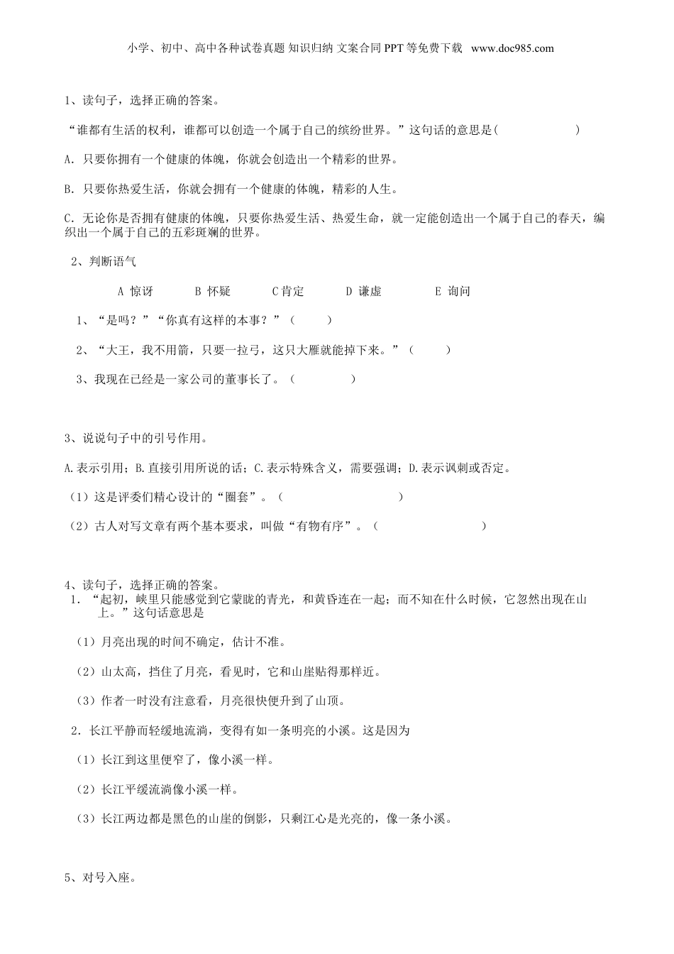 小学、初中、高中各种试卷真题知识归纳文案合同PPT等免费下载www.doc985.com1、读句子,选择正确的答案。“谁都有生活的权利,谁都可以创造一个属于自己的缤纷世界。”这句话的意思是()A.只要你拥有一个健康的体魄,你就会创造出一个精彩的世界。B.只要你热爱生活,你就会拥有一个健康的体魄,精彩的人生。C.无论你是否拥有健康的体魄,只要你热爱生活、热爱生命,就一定能创造出一个属于自己的春天,编织出一个属于自己的五彩斑斓的世界。2、判断语气A惊讶B怀疑C肯定D谦虚E询问1、“是吗?”“你真有这样的本事?”()2、“大王,我不用箭,只要一拉弓,这只大雁就能掉下来。”()3、我现在已经是一家公司的董事长了。()3、说说句子中的引号作用。A.表示引用;B.直接引用所说的话;C.表示特殊含义,需要强调;D.表示讽刺或否定。(1)这是评委们精心设计的“圈套”。()(2)古人对写文章有两个基本要求,叫做“有物有序”。()4、读句子,选择正确的答案。1.“起初,峡里只能感觉到它蒙眬的青光,和黄昏连在一起;而不知在什么时候,它忽然出现在山上。”这句话意思是(1)月亮出现的时间不确定,估计不准。(2)山太高,挡住了月亮,看见时,它和山崖贴得那样近。(3)作者一时没有注意看,月亮很快便升到了山顶。2.长江平静而轻缓地流淌,变得有如一条明亮的小溪。这是因为(1)长江到这里便窄了,像小溪一样。(2)长江平缓流淌像小溪一样。(3)长江两边都是黑色的山崖的倒影,只剩江心是光亮的,像一条小溪。5、对号入座。小学、初中、高中各种试卷真题知识归纳文案合同PPT等免费下载www.doc985.com1.从上下文连贯的要求看,下面句子中横线上所填内容最恰当的一组是()也许我们不能左右天气,但是我们可以();也许我们不能选择容颜,但是我们可以();也许我们不能号令他人,但是我们可以();也许我们不能预知未来,但是我们可以()……A.利用现在指挥自己把握心情展现笑容B.指挥自己展现笑容把握心情利用现在C.展现笑容把握心情利用现在指挥自己D.把握心情展现笑容指挥自己利用现在2.下列句子语序调整后基本意思不变的一组是()A.人不犯我,我不犯人。——我不犯人,人不犯我。B.我不会不认识李明的。——我怎么会不认识李明呢?C.老师可能不知道这件事。——老师不可能不知道这件事。3.“如果说他不可能完成这项任务,那么你就更不可能完成了。”这句话的意思是()A.他不能完成这项任务。B.他能完成这项任务。C.你不能完成这项任务。D.你能完成这项任务。4.重新排列下面句子的顺序,组成语意连贯的一段话,正确的顺序应该是()①尤其是不要忽视老人的每一个细小的请求。②生命无常。③因为有着这样一个遗憾,所以我时常提醒自己,善待身边的每一个人。④或许是他走这个世界寻求的最后一丝温暖。⑤那或许会成为他生命中的最后一个留言。⑥尤其是走人暮年的生命更是薄如蝉翼,让人无法预料。A.①⑥②③⑤④B.②①⑥③⑤④C.②①⑥③④⑤D.②⑥③①⑤④6、对号入座。用“√”标出与例句意思表达一样的句子。例:我正在走向新的站台。()1.我没有走向新的站台。()2.难道我正在走向新的站台?()3.我等会走向新的站台。()4.我不是正在走向新的站台吗?()小学、初中、高中各种试卷真题知识归纳文案合同PPT等免费下载www.doc985.com7、按照语言得体的要求,选出最恰当的一句()你的一位自尊心极强的朋友做错了某件事,你建议他去道歉:A.这事你错了,该找人家赔礼道歉去!B.这事咱们也有不对,最好还是跟人家说清楚。C.这事你是确确实实做错了!还不去认错?D.这事你难道没做错吗?赶快去认错!8、选择与例句意思相同的句子,在句后打“√”。例句:杭州西湖的景色真美。(1)杭州西湖的景色不能说很美。()(2)杭州西湖的景色谁不说美?()(3)杭州西湖的景色不能不说很美。()(4)杭州西湖的景色没有一个人不说不美。()(5)杭州西湖的景色没有一个人不说美。()(6)杭州西湖的景色谁说不美?()(7)杭州西湖的景色不能不说不美。()(8)杭州西湖的景色怎么能说美呢?()9、根据课文下列说法不正确的一项是()A.我伏在窗口痴想渴望见到波涛汹涌的大海。...