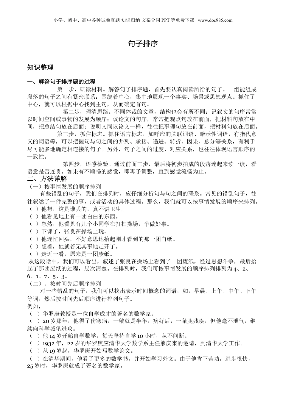 小学、初中、高中各种试卷真题知识归纳文案合同PPT等免费下载www.doc985.com句子排序知识整理一、解答句子排序题的过程第一步,研读材料。解答句子排序题,首先要认真阅读所给的句子。一组能组成段落的句子之间有紧密联系:围绕着中心,集中地展现一个事实、场景或思想观点。抓住了中心,就可以根据中心找到主句,从而确定首句。第二步,理清思路。不同体裁的文章,结构也会有所不同:记叙文的句序常常以时间空间或事物的发展为顺序;议论文的句序,常常把观点句放在前面,把材料句放在中间,把总结句放在后面;说明文同议论文一样,往往把事理句放在前面,把材料句放在后面。第三步,抓住标志。抓住语言标志,如呼应的关联词语、暗示性词语,有指代意义的词语等,可以把握句与句之间的并列、承接、递进、转折、因果、总分等关系,有利于尽可能多地确定相连接的句子。另外,句子之间的过度、对应关系,也往往体现语言顺序的一致性。第四步,语感检验。通过前面三步,最后将初步拍成的段落连起来读一读,看语意是否连贯。如果有不顺畅的感觉,即再予调整,直到感觉流畅为止。二、方法详解(一)按事情发展的顺序排列有些错乱的句子,我们在排列时,应仔细分析句与句之间的联系。常见的错乱句子,往往叙述了一件完整的事,或者活动的具体过程。那么,我们就可以按事情发展的顺序来排列。()他想,这是谁丢的,真不讲卫生。()他看见地上有一团白白的东西。()忽然,他看见有几个小同学在打扫操场,争做好事。()下课了,张良在操场上玩。()他连忙回头,不好意思地拾起刚才看到的那一团白纸。()想着,他就若无其事地走开了。()走近一看,原来是一团废纸。从这段话中,我们可以看出,叙述了张良在操场上看到了一团废纸,经过思想斗争,最后拾起了那团废纸的过程,层次清楚。在排列时,我们可按事情发展的顺序排列排列为4、2、6、1、7、5、3。(二)、按时间先后顺序排列对一些错乱的句子,我们可以找出表示时间概念的词语,如,早晨、上午、中午、下午等词,然后按时间先后顺序进行排列句子。例如,()华罗庚教授是一位自学成才的著名的数学家。()20岁那年,他得了伤寒病,一躺就是半年,病好后,一条腿残疾,但他毫不泄气,继续向科学城堡进攻。()他14岁开始自学数学,每天坚持自学10小时,从不间断。()1932年,22岁的华罗庚应清华大学数学系主任熊庆来的邀请,到清华大学工作。()从19岁起,华罗庚开始写数学论文。()在清华期间,他看了更多的数学书,并开始学习外文。由于他肯下苦功,进步很快,25岁时,华罗庚就成了著名的数学家。小学、初中、高中各种试卷真题知识归纳文案合同PPT等免费下载www.doc985.com排列这段话时,我们可以抓住“14岁”、“19岁”、“20岁”、“22岁”、“25岁”这些表示年龄的词,也就是以时间顺序来排列句子,那问题就迎刃而解了,正确的排列应是:1、4、2、5、3、6。(三)、按先总述后分述的顺序排列有这么一个习题:()有桉树、椰子树、橄榄树、凤凰树,还有别的许多亚热带树木。()初夏,桉树叶子散发出来的香味,飘得满街满院都是。()小城里每一个庭院都栽了很多树。()凤凰树开了花,开得那么热闹,小城好像笼罩在一片片红云中。根据这段话的特点,“小城里每一个庭院都栽了很多树”这句话是个中心句,其他三句话都是围绕着这句话来说的。显而易见,我们可按先总后分的顺序来排列句子。排列的顺序为:2、3、1、4。(四)、按空间推移的顺序排列所谓空间推移,就是由地点的转移,表达出不同的内容。排列时,要十分注意,不要与其他的方法相混淆。譬如,()一听到这熟悉的叫声,我就猜准它一定生蛋了。()我高兴地把蛋拣在手里,还热乎乎的呢。()跨进屋门,果然,一个鹅蛋似的双黄蛋躺在鸡窝里。()一天下午,我参加学习小组后回家,老远就听到我家的那只老母鸡“咯咯哒”、“咯咯哒”地在房子里叫个不停。这段话,我们可以抓住“屋外”和“屋里”两个不同地点,对句子进行排列,顺序是2、4、3、1。训练句子排列五步骤三、方法总结:排列句子是从句到段(篇)的过渡训练,能培养大家读写思维、综合运用的能力。一、粗...