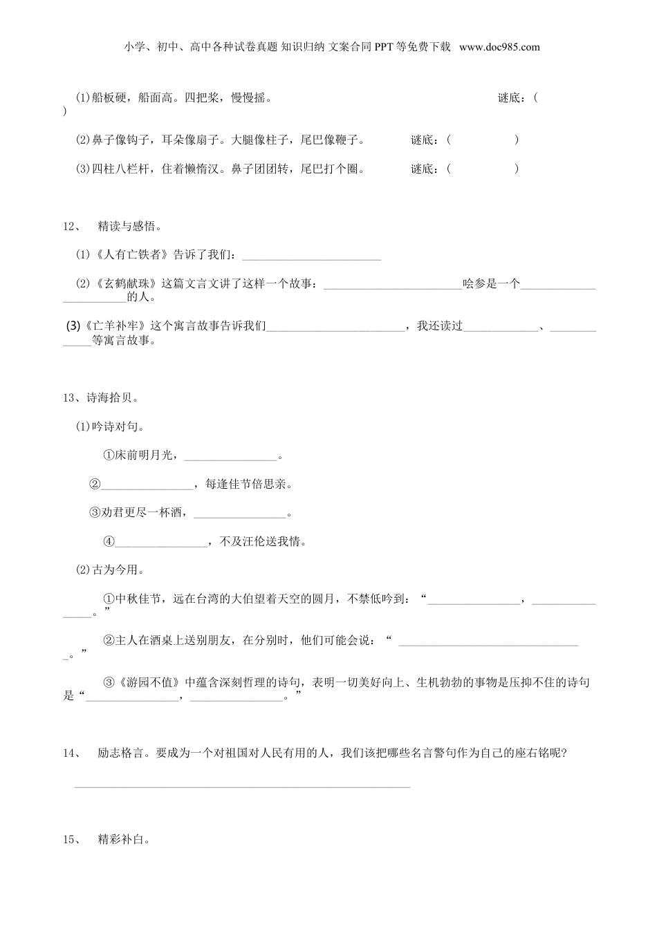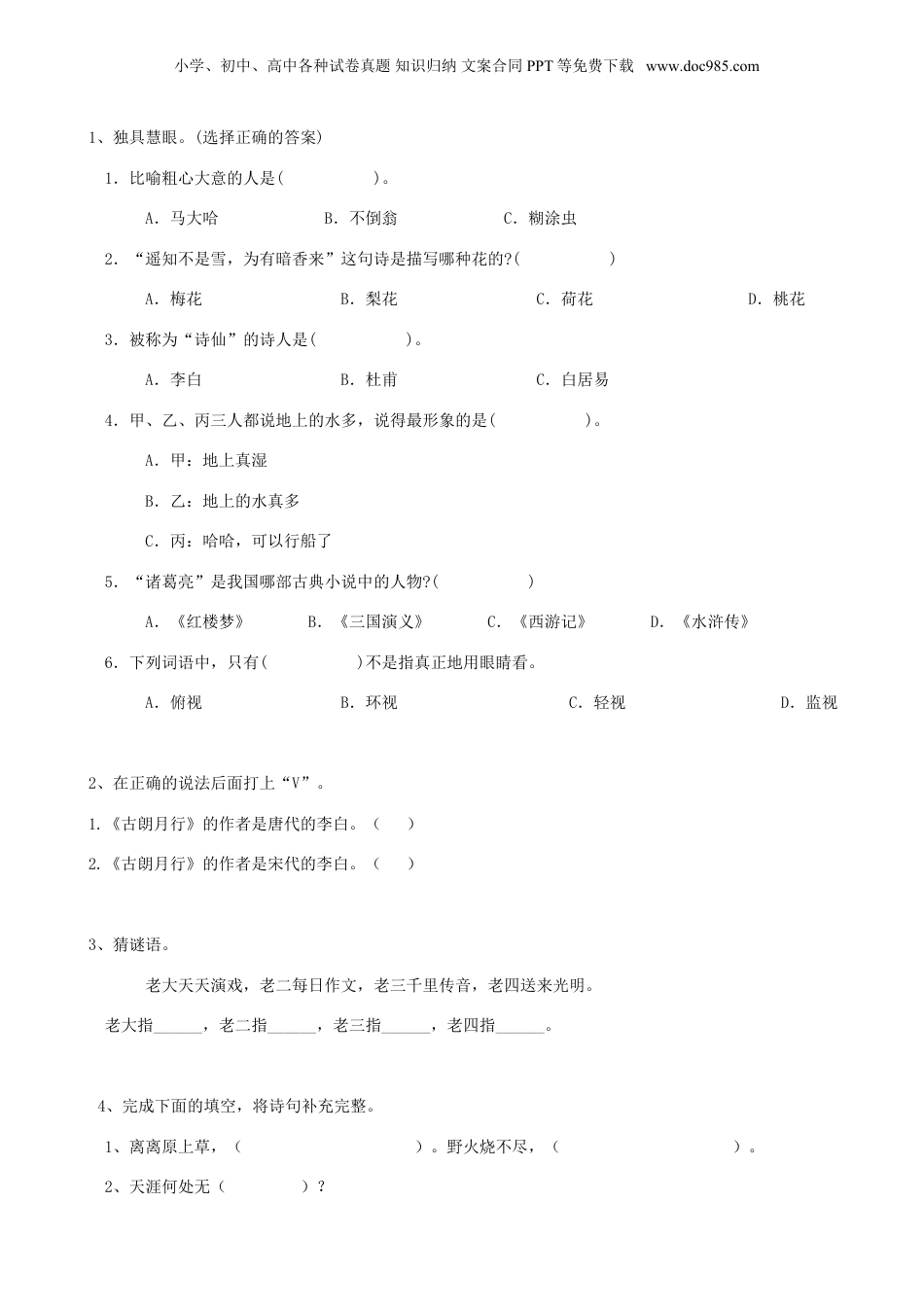 小学、初中、高中各种试卷真题知识归纳文案合同PPT等免费下载www.doc985.com1、独具慧眼。(选择正确的答案)1.比喻粗心大意的人是()。A.马大哈B.不倒翁C.糊涂虫2.“遥知不是雪,为有暗香来”这句诗是描写哪种花的?()A.梅花B.梨花C.荷花D.桃花3.被称为“诗仙”的诗人是()。A.李白B.杜甫C.白居易4.甲、乙、丙三人都说地上的水多,说得最形象的是()。A.甲:地上真湿B.乙:地上的水真多C.丙:哈哈,可以行船了5.“诸葛亮”是我国哪部古典小说中的人物?()A.《红楼梦》B.《三国演义》C.《西游记》D.《水浒传》6.下列词语中,只有()不是指真正地用眼睛看。A.俯视B.环视C.轻视D.监视2、在正确的说法后面打上“V”。1.《古朗月行》的作者是唐代的李白。()2.《古朗月行》的作者是宋代的李白。()3、猜谜语。老大天天演戏,老二每日作文,老三千里传音,老四送来光明。老大指______,老二指______,老三指______,老四指______。4、完成下面的填空,将诗句补充完整。1、离离原上草,()。野火烧不尽,()。2、天涯何处无()?小学、初中、高中各种试卷真题知识归纳文案合同PPT等免费下载www.doc985.com3、茅檐()低小,溪上()青青草。5、完成古诗填空。1、咬定青山不放松,()。2、(),任尔东西南北风。6、填空。《菊花》这首诗中,()这一句点出了作者喜爱菊花和对菊花历尽风霜后才凋谢的坚贞品格的赞美。7、请你写出本课这两首诗的名句。《山行》:《敕勒歌》:8、下面两则谜语,你能猜出是什么吗?(1)小小游泳家,说话呱呱呱。捉虫本领大,人人都夸它。谜底:()(2)一生总是忙,爱上百花乡,回来献一物,香甜胜过糖。谜底:()9、读一读,猜一猜。(1)白天出现,晚上不见。又红又圆,照亮地面。谜底:()(2)早晨跳出东海面,傍晚休息下西山。夏天我们躲着它,冬天人人都喜欢。谜底:()10、读读猜猜。说马不像马,路上没有它。若用它做药,要到海中抓。谜底:()11、猜一猜。下面说的是哪三种动物?小学、初中、高中各种试卷真题知识归纳文案合同PPT等免费下载www.doc985.com(1)船板硬,船面高。四把桨,慢慢摇。谜底:()(2)鼻子像钩子,耳朵像扇子。大腿像柱子,尾巴像鞭子。谜底:()(3)四柱八栏杆,住着懒惰汉。鼻子团团转,尾巴打个圈。谜底:()12、精读与感悟。(1)《人有亡铁者》告诉了我们:________________________(2)《玄鹤献珠》这篇文言文讲了这样一个故事:________________________哙参是一个________________________的人。(3)《亡羊补牢》这个寓言故事告诉我们________________________,我还读过_____________、_____________等寓言故事。13、诗海拾贝。(1)吟诗对句。①床前明月光,________________。②________________,每逢佳节倍思亲。③劝君更尽一杯酒,________________。④________________,不及汪伦送我情。(2)古为今用。①中秋佳节,远在台湾的大伯望着天空的圆月,不禁低吟到:“________________,________________。”②主人在酒桌上送别朋友,在分别时,他们可能会说:“________________________________。”③《游园不值》中蕴含深刻哲理的诗句,表明一切美好向上、生机勃勃的事物是压抑不住的诗句是“________________,________________。”14、励志格言。要成为一个对祖国对人民有用的人,我们该把哪些名言警句作为自己的座右铭呢?__________________________________________________________15、精彩补白。小学、初中、高中各种试卷真题知识归纳文案合同PPT等免费下载www.doc985.com养不教__________________________________________子不学__________________________________________昔孟母__________________________________________为人子__________________________________________16、在括号里面填入相应的反义词,使诗句完整。画唐.王维远看山()色,近听水()声。春()花还在,人()鸟不惊。17、查阅资料完成填空。《向狼借路》作者是()国作家()。18、根据课文内容填空。本文作者(),选自著名长篇小说()。本文主要描写了()的紧张场面,表现了他()的英雄本色。19、尝试填空。《雷雨》这篇...