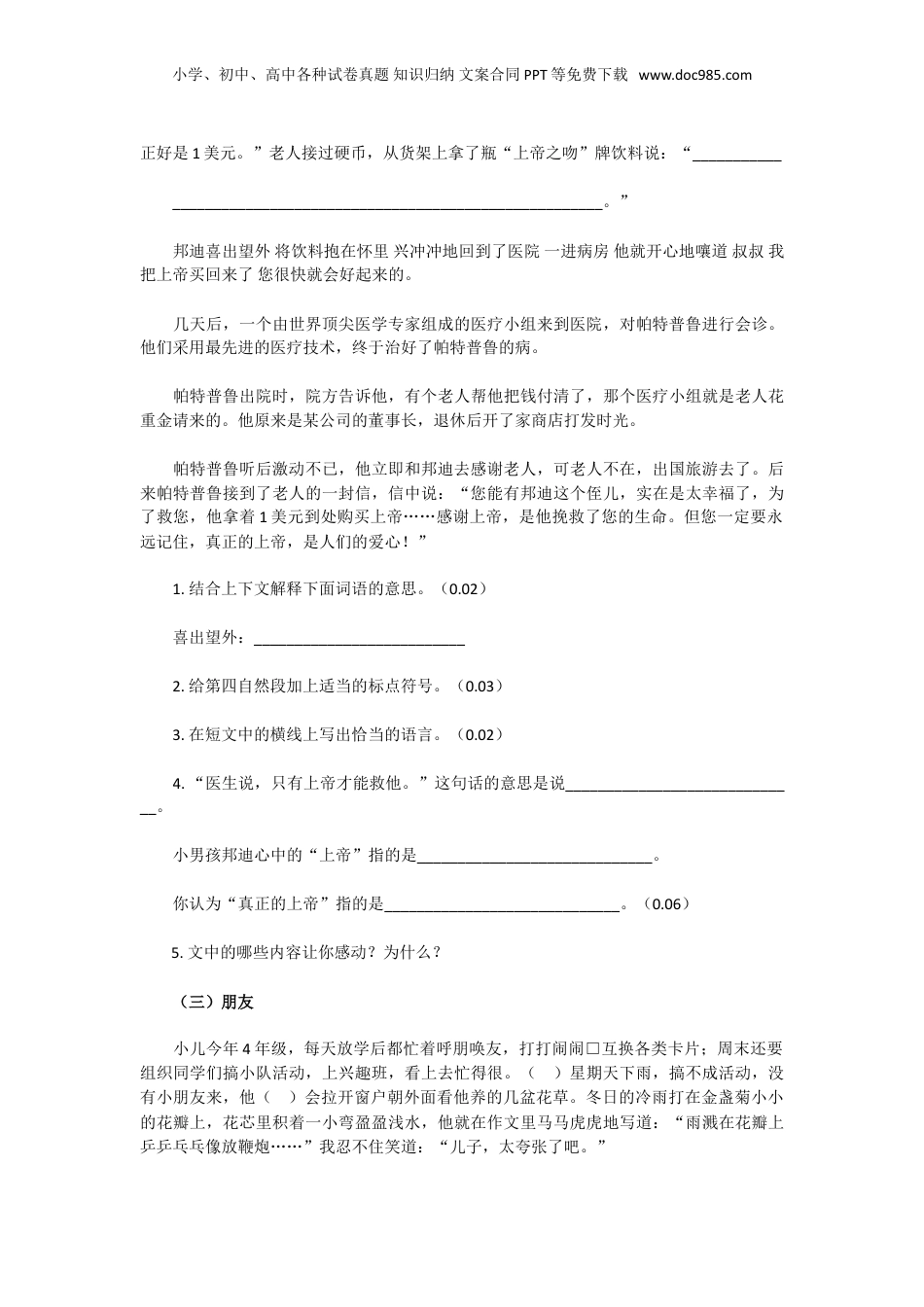 小学、初中、高中各种试卷真题知识归纳文案合同PPT等免费下载www.doc985.com小升初语文阅读精选练习题10套(附答案)(一)森林是绿色的宝库地球上郁郁葱葱的森林,是自然界巨大的绿色宝库。森林是制造氧气的工厂,一亩森林每天生产的氧气能满足65个人一天的需要。森林能吸收有害物质,一公顷的柳杉林,每天可吸收二氧化硫60千克。森林能防止水土流失,20厘米厚的表土层,如果被雨冲刷干净,林地需要57.7万年,草地要8.2万年,耕地是26年,裸(luǒ)地只要18年。森林能涵养水源,树冠就像一把张开的伞,可以截留20%的雨量,5万亩森林的储水量,相当于一个100万立方米的小型水库。假如没有森林,地球将会有450万个物种灭绝,洪水将泛滥,沙漠将不断扩大,人类的生存环境也会大大恶化,因此保护森林就是保护人类自己。1.根据短文内容,任选下面一个关联词语写一句话。(0.04)不但……而且因为……所以只要……就___________________________________________2.根据短文内容选择,对的画“√”,错的画“×”。(0.06)(1)这段话主要运用了比较说明的方法。()(2)这段话主要运用了假设说明的方法。()(3)这段话主要运用了数字说明的方法。()3.短文是围绕哪句话写的?用“_________”画出来。(0.02)4.森林对人类有哪些重要作用?概括地写出来。(0.04)(二)购买上帝的男孩一个小男孩捏着1美元硬币,沿着街边的商店一家一家地询问:“请问您这儿有上帝卖吗?”店主有的说没有,有的嫌他在捣乱,都不爱搭理他。天快黑了,第29家商店的店主��一位六十多岁的老人热情地接待了男孩。他笑眯眯地问男孩:“你买上帝干嘛?”男孩流着泪告诉老人,他叫邦迪,父母很早就去世了他是叔叔帕特普鲁抚养大的。叔叔是个建筑工人,前不久从脚手架上摔下来,至今昏迷不醒。医生说,只有上帝才能救他。邦迪想:上帝一定是种奇妙的东西,我把上帝买回来,让叔叔吃了,他就会好的。老人听完眼睛湿润了,问:“你有多少钱?”“1美元。”“孩子,眼下上帝的价格小学、初中、高中各种试卷真题知识归纳文案合同PPT等免费下载www.doc985.com正好是1美元。”老人接过硬币,从货架上拿了瓶“上帝之吻”牌饮料说:“________________________________________________________________。”邦迪喜出望外将饮料抱在怀里兴冲冲地回到了医院一进病房他就开心地嚷道叔叔我把上帝买回来了您很快就会好起来的。几天后,一个由世界顶尖医学专家组成的医疗小组来到医院,对帕特普鲁进行会诊。他们采用最先进的医疗技术,终于治好了帕特普鲁的病。帕特普鲁出院时,院方告诉他,有个老人帮他把钱付清了,那个医疗小组就是老人花重金请来的。他原来是某公司的董事长,退休后开了家商店打发时光。帕特普鲁听后激动不已,他立即和邦迪去感谢老人,可老人不在,出国旅游去了。后来帕特普鲁接到了老人的一封信,信中说:“您能有邦迪这个侄儿,实在是太幸福了,为了救您,他拿着1美元到处购买上帝……感谢上帝,是他挽救了您的生命。但您一定要永远记住,真正的上帝,是人们的爱心!”1.结合上下文解释下面词语的意思。(0.02)喜出望外:__________________________2.给第四自然段加上适当的标点符号。(0.03)3.在短文中的横线上写出恰当的语言。(0.02)4.“医生说,只有上帝才能救他。”这句话的意思是说_____________________________。小男孩邦迪心中的“上帝”指的是_____________________________。你认为“真正的上帝”指的是_____________________________。(0.06)5.文中的哪些内容让你感动?为什么?(三)朋友小儿今年4年级,每天放学后都忙着呼朋唤友,打打闹闹□互换各类卡片;周末还要组织同学们搞小队活动,上兴趣班,看上去忙得很。()星期天下雨,搞不成活动,没有小朋友来,他()会拉开窗户朝外面看他养的几盆花草。冬日的冷雨打在金盏菊小小的花瓣上,花芯里积着一小弯盈盈浅水,他就在作文里马马虎虎地写道:“雨溅在花瓣上乒乒乓乓像放鞭炮……”我忍不住笑道:“儿子,太夸张了吧。”小学、初中、高中各种试卷真题知识归纳文案合同PPT等免费下载www.doc985.com10多岁的男孩,心思...