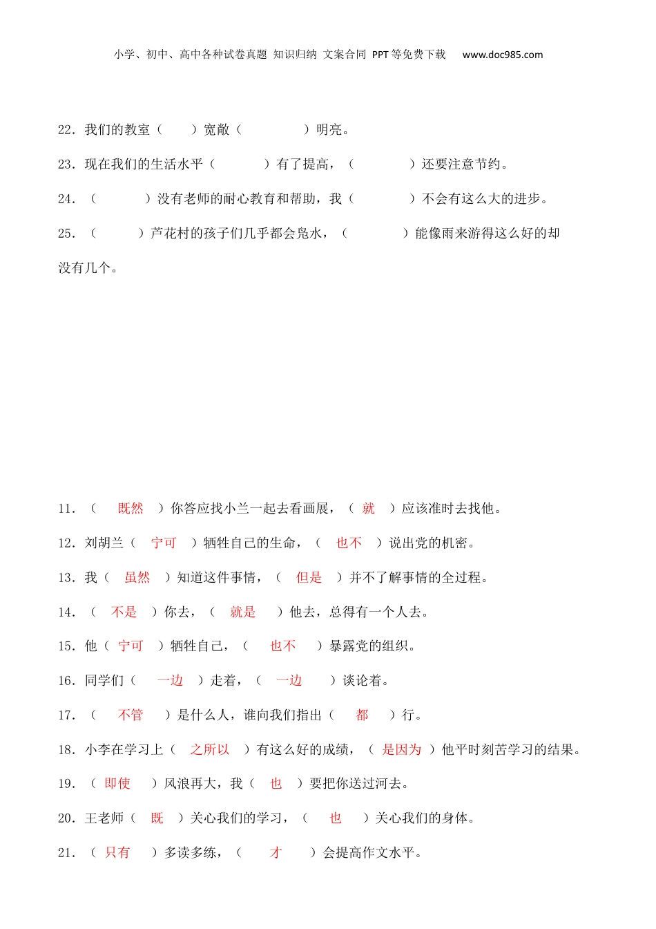 小学、初中、高中各种试卷真题知识归纳文案合同PPT等免费下载www.doc985.com语法作业关联词100题1.我们()把轮船停在港口,()冒着狂风暴雨前进。2.()从小学好本领,()能更好地为国家建设出力。3.鲁迅()是伟大的文学家,()是伟大的思想家和革命家。4.()今天下雨了,我们()要去探望李老师。5.()长城是那样雄伟壮丽,()吸引了很多游客。6.一滴水()很小很小,()无数滴水汇集起来,就可以形成江河湖海。7.()我们现在不好好学习,将来()不能担当起建设祖国的重任。8.很多同学在实践中体会到,()多读多写,作文(才)会有进步。9.()困难有多大,我们()能克服。10.()他热情地为同学们服务,()受到同学们的好评。小学、初中、高中各种试卷真题知识归纳文案合同PPT等免费下载www.doc985.com语法作业关联词100题1.我们(与其)把轮船停在港口,(不如)冒着狂风暴雨前进。2.(只有)从小学好本领,(才)能更好地为国家建设出力。3.鲁迅(不但)是伟大的文学家,(还)是伟大的思想家和革命家。4.(尽管)今天下雨了,我们(仍然)要去探望李老师。5.(因为)长城是那样雄伟壮丽,(所以)吸引了很多游客。6.一滴水(虽然)很小很小,(但是)无数滴水汇集起来,就可以形成江河湖海。7.(如果)我们现在不好好学习,将来(就)不能担当起建设祖国的重任。8.很多同学在实践中体会到,(只有)多读多写,作文(才)会有进步。9.(无论)困难有多大,我们(都)能克服。10.(因为)他热情地为同学们服务,(所以)受到同学们的好评。11.()你答应找小兰一起去看画展,()应该准时去找他。12.刘胡兰()牺牲自己的生命,()说出党的机密。13.我()知道这件事情,()并不了解事情的全过程。14.()你去,()他去,总得有一个人去。15.他()牺牲自己,()暴露党的组织。16.同学们()走着,()谈论着。17.()是什么人,谁向我们指出()行。18.小李在学习上()有这么好的成绩,()他平时刻苦学习的结果。19.()风浪再大,我()要把你送过河去。20.王老师()关心我们的学习,()关心我们的身体。21.()多读多练,()会提高作文水平。小学、初中、高中各种试卷真题知识归纳文案合同PPT等免费下载www.doc985.com22.我们的教室()宽敞()明亮。23.现在我们的生活水平()有了提高,()还要注意节约。24.()没有老师的耐心教育和帮助,我()不会有这么大的进步。25.()芦花村的孩子们几乎都会凫水,()能像雨来游得这么好的却没有几个。11.(既然)你答应找小兰一起去看画展,(就)应该准时去找他。12.刘胡兰(宁可)牺牲自己的生命,(也不)说出党的机密。13.我(虽然)知道这件事情,(但是)并不了解事情的全过程。14.(不是)你去,(就是)他去,总得有一个人去。15.他(宁可)牺牲自己,(也不)暴露党的组织。16.同学们(一边)走着,(一边)谈论着。17.(不管)是什么人,谁向我们指出(都)行。18.小李在学习上(之所以)有这么好的成绩,(是因为)他平时刻苦学习的结果。19.(即使)风浪再大,我(也)要把你送过河去。20.王老师(既)关心我们的学习,(也)关心我们的身体。21.(只有)多读多练,(才)会提高作文水平。小学、初中、高中各种试卷真题知识归纳文案合同PPT等免费下载www.doc985.com22.我们的教室(既)宽敞(又)明亮。23.现在我们的生活水平(虽然)有了提高,(但)还要注意节约。24.(如果)没有老师的耐心教育和帮助,我(就)不会有这么大的进步。25.(虽然)芦花村的孩子们几乎都会凫水,(但是)能像雨来游得这么好的却没有几个。26.()人人都献出一点爱,世界()会变成美好的人间。27.()走到天涯海角,我()不会忘记自己的祖国。28.凡卡()在城里受罪,()回到乡下爷爷那里去。29.邱少云()牺牲自己,()暴露潜伏部队。30.()工作再忙,他每天晚上()挤出时间学习英语。31.每天上学,()王杰来找我,()我去找他,我俩总是结伴去学校。32.他()把自己的大提包扔了,()放弃朋友的纸箱子。33.()我做了充分准备,这次试验()没有成功。...