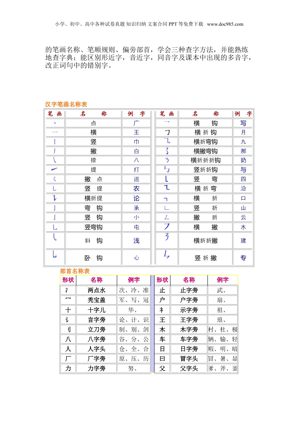 小学、初中、高中各种试卷真题知识归纳文案合同PPT等免费下载www.doc985.com六年级语文知识复习整理杨成明一、提纲:(一)、拼音1、认真复习下面的拼音字母及整体认读音节。声母:bpmfdtnlgkhjqxzhchshrzcyw单韵母:aoeiuü复韵母:aieiuiaoouiuieüeer鼻韵母:aneninunünangengingong整体认读音节:zhichishirizicisiyiwuyuyeyueyinyunyuanying2、按拼音字母表的顺序对凌乱的拼音字母进行正确的排序。并能在四线三格上正确书写。3、拼音字母的大小写转换。4、前鼻音、后鼻音字的区分练习设计。主要看音节的韵母:如音节的韵母是aneninunün的是前鼻音的字;如音节的韵母是angengingong的是后鼻音的字。5、翘舌音、平舌音字的区分练习设计。主要看音节的声母:如音节的声母是zcs的是平舌音的字;如音节的声母是zhchshr的是翘舌音的字。6、按音序查字法准确地查出给定的字。音序指音节的第一个字母。(表示时必须用大写字母表示)7、正确对给定的字标调的练习设计。看见母不放过,没有a母找o、e,i、u并列标在后,单个韵母不用说。重点强调i、u相遇标在后,i上标调时要先去点后标调。8、16个整体认读音节的练习设计。9、看拼音写词语或句子。注意:音节zhichishiri既是整体认读音节的字又是翘舌音的字;音节zicisi既是整体认读音节的字又是平舌音的字;音节yinyunyuan既是整体认读音节的字又是前鼻音的字;音节ying既是整体认读音节的字又是后鼻音的字。10、变调在普通话里,有些音节的声调起了一定的变化,而与单字声调不同,这种变化叫变调。阴平阳平去声轻声一yī单念或用在词尾以及用在序数中yí在去声前yì在非去声前在相同的动词中间不bú在去声前bù在非去声前,在小学阶段应掌握的还有一种变调现象是出现在ABB叠词中,后面BB二字均念阴平声。(二)汉字能够读准字音,认清字形,了解字义,大部分会用,要掌握汉字小学、初中、高中各种试卷真题知识归纳文案合同PPT等免费下载www.doc985.com的笔画名称、笔顺规则、偏旁部首,学会三种查字方法,并能熟练地查字典;能区别形近字,音近字,同音字及课本中出现的多音字,改正词句中的错别字。汉字笔画名称表笔画名称例字笔画名称例字丶点广乛横钩写一横王折横钩月丨竖巾折横弯钩九丿撇白横撇弯钩那捺八ㄋ折折折横钩奶提打折折竖钩与ㄑ撇点巡竖弯四し竖提农折横弯沿折提横论┐横折口亅弯钩承∟竖折山亅竖钩小ㄥ撇折云乚竖弯钩屯横撇水斜钩浅折折横撇建卧钩心折竖撇专部首名称表形状名称例字形状名称例字冫两点水次、冷、准止止字旁武、冖秃宝盖军、写、冠户户字旁扇、十十字儿华、礻示字旁祖、讠言字旁论、计、识王王字旁琅、刂立刀旁制、别、剑木木字旁村、杜、极八八字旁谷、分、公车车字旁辆、输、轻人人字头仓、全、合日日字旁暇、明、暗厂厂字旁原、压、历曰冒字头冒、暑、显力力字旁努、父父字头爹、斧、釜小学、初中、高中各种试卷真题知识归纳文案合同PPT等免费下载www.doc985.com又又字旁艰、牜牛字旁牵、特、物亻单人旁侵、攵反文旁敏、故、卩单耳刀却、斤斤字头新、阝双耳刀陆、爫爪字头爱、廴建字旁延、月月字旁腹、肋、膛勹包字头甸、穴穴宝盖穿、空、窟厶私字儿参、立立字旁竖、匚三框儿医、目目字旁盲、瞳、盯冂同字框网、田田字旁男、胃、累氵三点水泸、石石字旁研、砂、磊彡三撇儿彤、矢矢字旁矮、忄竖心旁悄、疒病字旁疼、宀宝盖儿宜、衤衣字旁衬、广广字旁底、钅金字旁错、夕夕字旁梦、罒皿字头蜀、辶走之旁邀、皿皿字底孟、盖、寸寸字旁封、禾禾木旁秋、秀、秒扌提手旁拖、白白字旁泉、土提土旁地、鸟鸟字旁鸭、艹草字头药、米米字旁粒、糕、料大大字头套、西西字头栗、要、小小字头肖、页页字旁顷、口口字旁唱、舌舌字旁乱囗方框儿国、缶缶字旁缸、缺、门门字框阅、耳耳字旁耽、职、巾巾字旁师、虫虫字旁蛹、山山字旁峡、虍虎字头虑、虚、虎彳双人旁徐、竹竹字头管、篮、犭反犬旁猪、舟舟字旁船、饣食字旁饱、走走字旁赵、尸尸字头屡、足足字旁距、踞、跳弓弓字旁张、角角字旁触、解、孑子字旁孩、身身字旁躲、女女字旁妈、鱼鱼字旁鲜、鳄、鳔小学、初中、高中各种试卷真题知识归纳文案合同PPT等免费下载w...