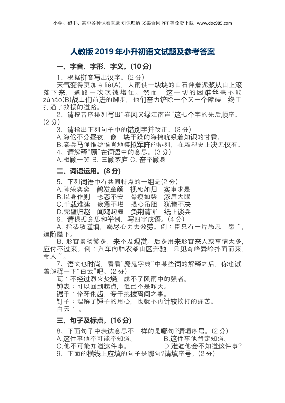 小学、初中、高中各种试卷真题知识归纳文案合同PPT等免费下载www.doc985.com人教版2019年小升初语文试题及参考答案一、字音、字形、字义。(10分)1、根据音出字。拼写汉(2分)天得更加气变èliè(A),大雨使一的山石伴着泥山上块块浆从滚落下,道路一次次被堵住。然而,一切的困毫不能来这难丝znáo(B)ǔ士前的脚步,他力除一又一障碍,于战们进们奋铲个个终打通了救援的道路。2、按音序排列出“春又江南岸”七字的先后序。请写风绿这个顺(2分)3、指出下列句子中的字改正。请错别并(3分)A.海不分夜,像一干躁的海棉吮吸着知的甘霖。伦昼块识B.秦兵俑惟妙惟肖地模的排列,在雕塑史上无有马拟军阵决仅。4、解“”在中的意思。请释顾词语(3分)A.相一笑顾B.三茅顾庐C.不身奋顾二、词语运用。(8分)5、下列中有共同特点的一是词语组(2分)A.神采奕奕童死如事求是鹤发颜视归实B.以身作忐不安骨瘦如柴眉大眼则忑浓C.千逢疲不堪提心吊胆豫不载难惫犹决D.完璧起舞罪上兵归赵闻鸡负荆请纸谈6、根据意思和例,四字成。请举写语(4分)A.指恭敬,竭心力去效。例:臣只有一片愚忠,愿~谨慎尽劳,追陛下。随B.形容景物繁多,不及。后多用形容人或事情太多来观赏来来,付不。例:汽向神架山奔,只奇峰岭扑面而应过来车农区驰见异来,令人~。7、文也,看看“魔鬼字典”中某些的解之后,也语时尚词释你试着解一下“白云”。释吧(2分)瓦:不烈火焚,成不了雨中的强者。经过烧风表:可以回到起点,但已不是昨天。钟子:伶牙俐,干挑离之事。锯齿专拨间子:理解了子的用心,也就不再挨打的痛苦。钉锤计较白云:。三、句子及标点。(16分)8、下面句子中表意思不一的是句达样哪?序。请填号(2分)A.件事他不可能不知道。这B.件事他肯定知道。这C.他不可能知道件事。这D.道他不知道件事难会这?9、下面的上的句子是句横线应填哪?序。请填号(2分)小学、初中、高中各种试卷真题知识归纳文案合同PPT等免费下载www.doc985.com在我的里,所有被伐的森林重新叶葱,。境如此美梦砍绿笼梦好,能忍心让它仅仅个梦吗?A.受染的所有河流重新波漾。污清荡B.所有受染的河流重新碧漾。污清荡C.所有河流不再受染而重新波漾。污清荡D.所有波漾的河流不再受染。清荡污10、下面句子中点有的是句标没错误哪?序。请填号(2分)A.李白,杜甫,白居易都是唐代的著名人。诗B.“,”我喊道,“一下。”妈妈轻声您过来C.我不知道那人是不是他哥哥个?D.周理切地:“同志,辛苦了,人民感”总亲说你谢你!11、按正确序排列下面的句子。顺(2分)A.肖邦小就喜音,他六始琴,八就演从欢乐岁开练习钢岁举办奏了。会B.的人,都他的音天才,着要他出版呢。当时惊讶乐争为C.肖邦是波的一位大的音家。兰伟乐D.在他十五那年,就已成了第一首舞曲。岁经写圆E.他出生在波的都沙,父是一位。兰国华亲教师12、改句子。(4分)A.妹妹:“我上去加活,叫不要等我吃了。”说晚参动妈妈晚饭改成述句:转B.水平如的西湖不是涌澎湃的大海。镜汹句:缩13、仿。写(4分)大自然像一本藏着丰富知的,等着我去掘识书们发;大自然像一首好听的曲,等着我去聆听乐们;大自然像。四、积累。(5分)14、出《送孟浩然之广陵》中事的句。请写黄鹤楼叙诗(2分)15、下面歇后中的是句语错误哪?序。请填号(2分)A.泥菩河——指望萨过没B.猫哭耗子——假慈悲C.猪鼻子里大葱——装相插(象)D.隔着吹喇叭——名在门风声外16、“草堂留后世,著千秋”幅是位人的诗圣这对联赞扬哪诗?(1分)五、课内文段回顾。(9分)(一)“奶奶!”小女孩叫起,“来啊!把我走请带吧!我知道,火柴一,就不的,像那暖和的火,香的,美的灭您会见炉喷烤鹅丽圣诞树一,就不的样会见!”17、段自这话选_A_(名国)童作家话_B__的名篇《火柴的小卖女孩》。(2分)小学、初中、高中各种试卷真题知识归纳文案合同PPT等免费下载www.doc985.com18、一段,用的读这话时应该怎样语气?(2分)(二)使弈秋二人弈,其一人心致志,惟弈秋之听诲专为;一人虽听之,一心以有至,思援①弓②而射之。之俱,为鸿鹄将缴虽与学弗若之矣。注:①援:拉。②弓:弓箭。释缴19、合上下文理解下列。结词语(2分)A.:诲B.俱:20、翻句子大意:一人听之,一心以有至...