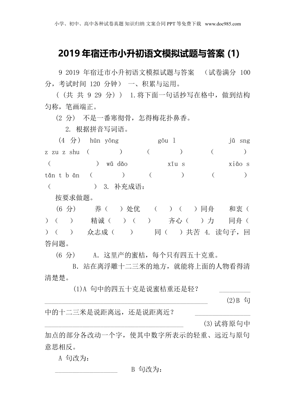 小学、初中、高中各种试卷真题知识归纳文案合同PPT等免费下载www.doc985.com2019年宿迁市小升初语文模拟试题与答案(1)92019年宿迁市小升初语文模拟试题与答案(试卷满分100分,考试时间120分钟)一、积累与运用。((共共929分))1.将下面一句话抄写在格中,做到结构匀称,笔画端正。(2分)不是一番寒彻骨,怎得梅花扑鼻香。2.根据拼音写词语。(4分)hūnyōnggōuljǔsngzzuzshu()()()()wǔdǎoxīusxiāostǎntbān()()()()3.补充成语:按要求做题。(6分)养()处优()()同舟和衷()()精诚()()齐心()力同舟()()众志成()同()共苦4.读句子,回答问题。(6分)A.这里产的蜜桔,每个只有四五十克重。B.站在离浮雕十二三米的地方,就能将上面的人物看得清清楚楚。(1)A句中的四五十克是说蜜桔重还是轻?________________________________________________________(2)B句中的十二三米是说距离远,还是说距离近?________________________________________________________(3)试将原句中加点的部分各改动一个字,使其中数字所表示的轻重、远近与原句意思相反。A句改为:__________________B句改为:小学、初中、高中各种试卷真题知识归纳文案合同PPT等免费下载www.doc985.com__________________5.判断下列句子各运用了什么修辞手法?(3分)(1)没有他们的辛劳,就没有石板砌成的阶梯,就没有脚下的路,也就没有游人的欢乐。()(2)大雨没喘气,一连下了五天五夜。()(3)海水向岸边奔来,像野马一样咆哮。()6.古诗文积累,根据你的积累补充句子。(8分)(1)洛阳亲友如相问,。(2)千磨万击还坚劲,。(3)人非生而知之者,?(4)使卵石臻于完美的,并非锤的打击,而是水的。二、阅读理解。((共共636分))(一)学习文言文,技能感受传统文化的精髓,也可以明白做人做事的道理。阅读下面的语段,回答问候的问题。(12分)王戎不取道旁李王戎【1】七岁,尝与诸小儿游,看道边李树多子折枝【2】,诸儿竞走取之,唯戎不动。人问之,答曰:树在道边而多子,此必苦李。取之,信然。【注释】【1】王戎,西晋琅琊(今属山东)人,自幼聪明过人,为竹林七贤之一。【2】折枝:压弯枝条。1.解释文中加点字和词语的含义。(4分)竞:信然:2.用现代汉语说说划线句子的意思。(4分)3.读了这个故事,你得到什么启示?(4分)小学、初中、高中各种试卷真题知识归纳文案合同PPT等免费下载www.doc985.com(二)课内阅读:(12分)我抬头望了望在暮色中顶天立地的天游峰,上山九百多级,下山九百多级,一上一下一千八百多级。那层层叠叠的石阶,常常使游客们气喘吁吁,大汗淋漓,甚至望而却步,半途而返。可是这位老人,每天都要一级一级....扫上去,再一级一级....扫下来我不禁倒抽了一口气。借着淡淡的星光,我仔细打量了他:瘦削的脸,面色黝黑,淡淡的眉毛下,一双慈善的眼睛炯炯有神。(六年级下册《天游峰的扫路人》)1.顶天立地的意思是:2.这段话在进行人物描写时采用的表现手法是描写。文中两处强调一级一级,这样写的作用是。3.这段话是按顺序来写的,从和两个词语可以明显看出来。4.从老人的外貌看出他是一个人。(三)课外阅读检测台(12分)耐磨的人生我的一个朋友在一次意外的事故中失去了右手。炎炎夏日里,我到他的小书屋去选书。我本来打算要穿一件凉爽的短袖汗衫出门的。可是,临行前我还是毅然换了一件长袖汗衫我忘不掉两年前他在酷暑时节穿一件长袖汗衫对我说我今生再也无福穿短袖汗衫了的悲苦神情,我希望这件长袖汗衫从我身上蒸出淋淋汗水,希望这淋淋汗水能多少减淡一点朋友的哀伤和痛楚。当我出现在那间小书屋时,朋友热情地迎上来与我握手。两只左手紧紧相握的瞬间,我俩都忍不住看着对方的衣衫大笑起来因为,朋友居然穿了一件短袖汗衫。小学、初中、高中各种试卷真题知识归纳文案合同PPT等免费下载www.doc985.com朋友说,谢谢,我知道你的良苦用心。倒退两年,我还真的特别需要你这样做,但现在不同了不瞒你说,刚出事的那阵子,我认为我活不下去了,我说什么也接受不了没有右手的残酷现实。我笨拙地穿衣,歪歪扭扭地写字,刮胡子的时...