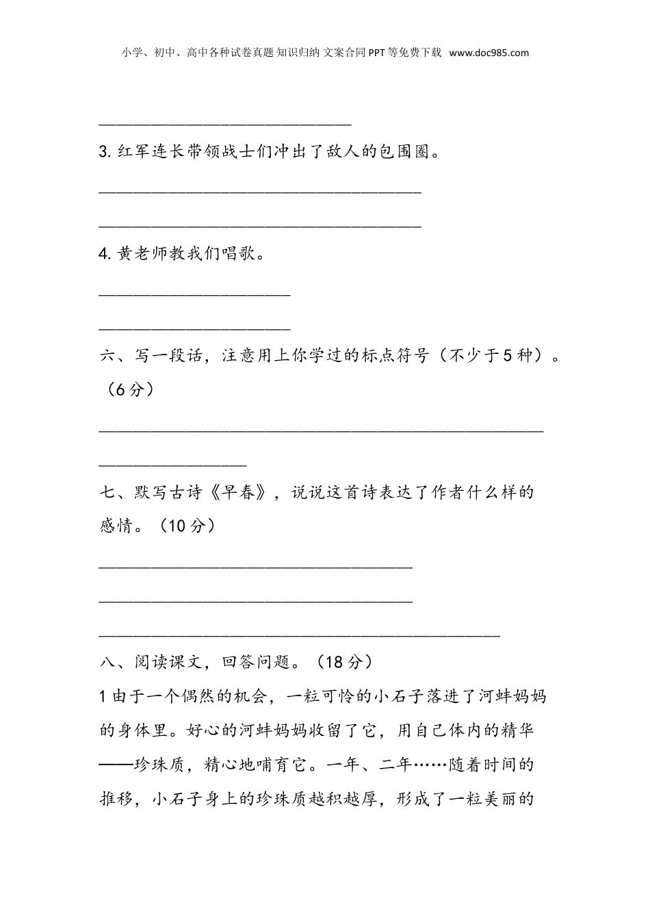 小学、初中、高中各种试卷真题知识归纳文案合同PPT等免费下载www.doc985.com2018年小升初语文检测试卷及答案为了帮助每个考生更好的备考小升初,下面是为大家搜索整理的关于小升初语文检测试卷,欢迎参考学习,希望对学生们有所帮助!一、查字典,按要求填空。(5分)“封”字按部首查字法,先查()部,再查()画。“捋”字按音序查字,先查大写字母()字,再查音节()。“严”字按数笔画查字法,共()画。二、修改病句。(10分)1.他出席了学校举行的秋季运动会短跑竞赛。______________________________________2.秋天的西安是个美丽的季节。______________________________________3.六年级的同学都尊重小学生守则。______________________________________4.这本书我整整用了差不多半天的时间才看完。______________________________________5.我们要珍惜时间,不要把时间白白地,无缘无故地浪费掉。______________________________________三、把下面的成语补充完整。(10分)小学、初中、高中各种试卷真题知识归纳文案合同PPT等免费下载www.doc985.com精兵()政()()向荣丢盔()甲千里()()安居()业倾盆()()口若()河垂头()()神机()算斗志()()四、用三组不同的关联词,把下面的两个分句连接起来,抄在横线上。(6分)“中国人民下定决心”,“修好京张铁路”_________________________________________________________________________________________________________________________________________________________五、读下面的例句,注意三个句子的关系,仿照例句,把一个句子分解成两个小句子。(8分)例:我们请老师讲故事。我们请老师。老师讲故事。1.老师带领我们去慰问军烈属。________________________________________________2.大队委员会组织我们参加义务劳动。_____________________________小学、初中、高中各种试卷真题知识归纳文案合同PPT等免费下载www.doc985.com_____________________________3.红军连长带领战士们冲出了敌人的包围圈。__________________________________________________________________________4.黄老师教我们唱歌。____________________________________________六、写一段话,注意用上你学过的标点符号(不少于5种)。(6分)____________________________________________________________________七、默写古诗《早春》,说说这首诗表达了作者什么样的感情。(10分)______________________________________________________________________________________________________________________八、阅读课文,回答问题。(18分)1由于一个偶然的机会,一粒可怜的小石子落进了河蚌妈妈的身体里。好心的河蚌妈妈收留了它,用自己体内的精华──珍珠质,精心地哺育它。一年、二年……随着时间的推移,小石子身上的珍珠质越积越厚,形成了一粒美丽的小学、初中、高中各种试卷真题知识归纳文案合同PPT等免费下载www.doc985.com珍珠。2河蟹见到了珍珠,高兴地说:“你长得比河蚌妈妈更美啦。”3珍珠听了满肚子不高兴地说:“河蚌有什么资格做我的妈妈呢?论美丽,我比她强十倍;论身价,我比她贵一百倍。”4“但你毕竟是河蚌妈妈千辛万苦养大的呀,而且她现在还继续精心地哺育着你。”河蟹不平地说。5“你不知道,现在我讨厌的正是她的精心哺养,她把我抱在怀里,使我失去了被人发现的机会,我希望她早些被渔夫网去,那样,我会被送到皇宫里,饰在皇冠上……”6“如果当初河蚌妈妈不收留你这没良心的家伙,你现在不还是一颗可怜的小石子吗?”河蟹气愤地说。7“应该承认现实嘛,我现在已经是非凡的珍珠了!”珍珠厚颜无耻地说。8河蟹越听越气,用大钳子狠狠一夹,把珍珠夹碎了。1.“厚颜无耻”的“颜”的字义是[](3分)A.颜面、脸面B.颜色、色彩2.短文中破折号的作用是[](4分)A.表示递进或转折B.表示解释、说明C.表示声音的延续小学、初中、高中各种试卷真题知识归纳文案合同PPT等免费下载www.doc985.com3.本文正确的分段是[](4分)A.第一段:第1-2自然段;第二段:第3-7自然段;第三段:第8自然段。B.第一段:第1自然段;第二段:第2-8自然段。C.第一段...