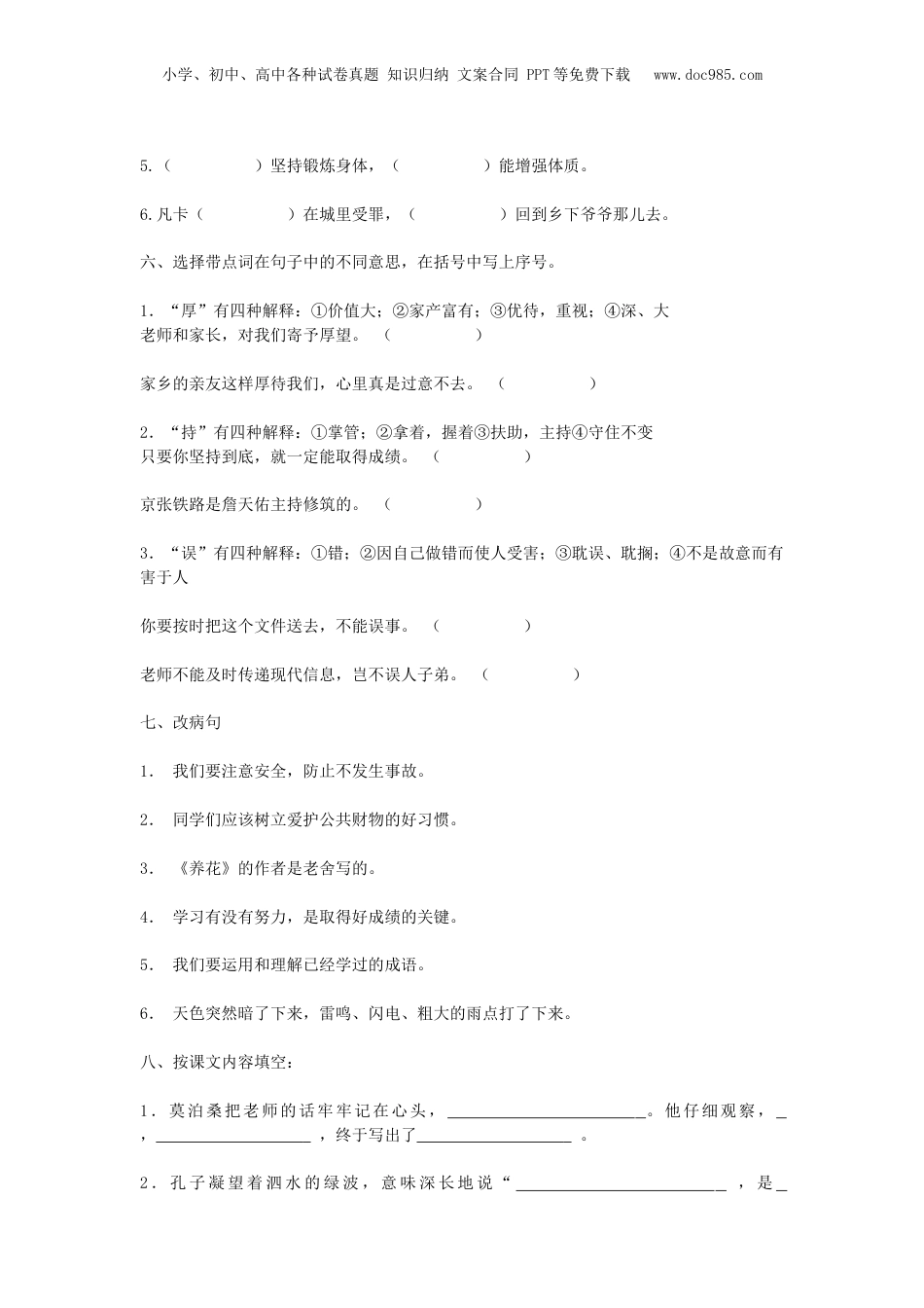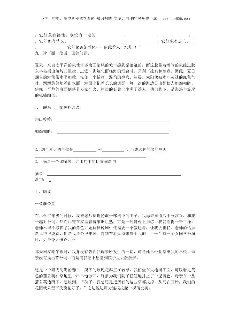 小学、初中、高中各种试卷真题知识归纳文案合同PPT等免费下载www.doc985.com2019小升初语文模拟试卷一、看拼音写词语zhènhàntuǒyuáncuòzhéxiāoyǒnghuǐhuài()()()()()yōuhuìpàiqiǎnbāofúfázhànmáizàng()()()()()二、给下面带点字选择正确的读音。朝夕(cháozhāo)收藏(cángzàng)干净(gāngàn)困难(nànnán)似乎(sìshì)旅行(xíngháng)差别(chāchà)号召(hàoháo)三、组词详()竣()架()仿()祥()峻()驾()防()拆()遣()陵()衔()折()遗()凌()街()四、在括号中写上合适的字,组成成语。富丽()()不及防()勃勃所向披()心急如()负()请罪日()月()昂()挺胸五、从下面的关联词中选择合适的填在括号里。宁可……也不……因为……所以……与其……不如……不但……而且……既然……就……只有……才……1.()赵国武有廉颇,文有蔺相如,()秦王不敢轻举妄动。2.桑娜()挨丈夫揍,()丢下西蒙的孩子不管。3.……否则,()那些外国人要讥笑我们,()会使中国工程师失掉信心。4.这本书()是你先借的,你()先那去吧。小学、初中、高中各种试卷真题知识归纳文案合同PPT等免费下载www.doc985.com5.()坚持锻炼身体,()能增强体质。6.凡卡()在城里受罪,()回到乡下爷爷那儿去。六、选择带点词在句子中的不同意思,在括号中写上序号。1.“厚”有四种解释:①价值大;②家产富有;③优待,重视;④深、大老师和家长,对我们寄予厚望。()家乡的亲友这样厚待我们,心里真是过意不去。()2.“持”有四种解释:①掌管;②拿着,握着③扶助,主持④守住不变只要你坚持到底,就一定能取得成绩。()京张铁路是詹天佑主持修筑的。()3.“误”有四种解释:①错;②因自己做错而使人受害;③耽误、耽搁;④不是故意而有害于人你要按时把这个文件送去,不能误事。()老师不能及时传递现代信息,岂不误人子弟。()七、改病句1.我们要注意安全,防止不发生事故。2.同学们应该树立爱护公共财物的好习惯。3.《养花》的作者是老舍写的。4.学习有没有努力,是取得好成绩的关键。5.我们要运用和理解已经学过的成语。6.天色突然暗了下来,雷鸣、闪电、粗大的雨点打了下来。八、按课文内容填空:1.莫泊桑把老师的话牢牢记在心头,。他仔细观察,,,终于写出了。2.孔子凝望着泗水的绿波,意味深长地说“,是小学、初中、高中各种试卷真题知识归纳文案合同PPT等免费下载www.doc985.com,它好象有德性。水没有一定的,,,,它好象有情义。,,,它好象有志向。,,它好象善施教化……由此看来,水是!”九、读下面一段话,回答问题。夏天,来自太平洋的风使许多南面临风的城市感到湿漉漉的,而这股带着潮气的风经过胶东半岛崇山峻岭的阻拦、过滤,到达北面临海的烟台时,只剩下凉爽和惬意。因此,夏日烟台的海常常水平如镜,宛如一个恬静、温柔的少女。清晨,太阳像被水冲洗过的红色气球,飘飘悠悠地浮出水面,海面上拖着长长的倒影,每一次的海边日出都使人如痴如醉。傍晚,平静的海面倒映着万家灯火,岸边的石凳上坐满了游人,他们脚下,是海浪与堤岸的呢喃细语。1.联系上下文解释词语。崇山峻岭:如痴如醉:2.烟台夏天的气候是和。形成这种气候的原因2.摘录一个比喻句,并用句中的比喻词造句摘录:造句:十.阅读一朵蒲公英在小学三年级的时候,我被老师挑选扮演一部剧中的王子。我母亲知道后十分高兴,和我一起对台词。然而尽管在家里背得滚瓜烂熟,可是一到舞台上排练,我就忘得一干二净。老师不得不撤换了我的角色。她解释说剧中还需要一个叙述者,让我去担任。老师的话虽然说得很委婉,但是我还是很难过。特别在看见原来属于我的“王子”有一个女同学扮演时,更是令人伤心。//那天回家吃午饭时,我并没有告诉我母亲所发生的一切,可是她已经觉察出我的不快。母亲没有提出背台词,而是问我愿不愿意到院子里去散散步。这是一个阳光明媚的春日,架下的玫瑰花瓣正在转绿。我们坐在大榆树下面,可以看见黄色的蒲公英在草地里一串串地散开,好象为我们院子轻轻地抹上...