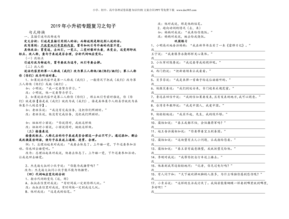 小学、初中、高中各种试卷真题知识归纳文案合同PPT等免费下载www.doc985.com2019年小升初专题复习之句子句式转换一、直接引述句改转述句定义分析:引述是直接引用别人的话;而转述则是转达别人说的话。改写原则:只改变双引号里的内容,冒号和双引号外面的内容不变。具体改法:冒变逗,去双引,一变三,二变对像回头看,来变去,这变那即改标点、改人称,查句子表述是否合理,分析代词响应变化。(一)改标点引述句改为转述句,冒号要改为逗号,双引号要去掉。(二)改人称说话内容里的第一人称我(我们)改为第三人称他/她(他们/她们);第二人称你(你们)改为听话对象。1、如果说话内容中是第一人称我(我们),一般情况下把我(我们)改为第三人称他(他们)或她(她们)。如:小明说:“我一定要努力学习。”改:小明说,他一定要努力学习。2、如果说话内容中是第二人称你(你们),那么双引号前对谁说,你(你们)就是谁【谁是我(我们)就改为我(我们),谁是具体某个人的名字就改为具体某个人的名字】。如:老班长说:“我没有完成任务,没把你们照顾好。”改:老班长说,他没有完成任务,没把我们照顾好。如:姐姐对小丽说:“你说得对,我就这样做改:姐姐对小丽说,小丽说得对,她就这样做。(三)检查表达检查改标点、人称之后的句子表述是否合理这一步必不可少。通过添加、删去或改换某些词语,使句子在表述上通顺、连贯、合理。例:1、总理站起来对我说:“我要去休息了。上午睡一觉,下午还要参加活动。你也回去睡觉吧。”改为:总理站起来对我说,他要去休息了。上午睡一觉,下午还要参加活动。让我也回去睡觉。2、杰克逊大叔对小伙子说:“你能为我捶背吗?”改为:杰克逊大叔问小伙子能不能为他捶背。(四)代词响应变化的分析1、指示代词的变化(这,那)A、叔叔在信里对我说:“有时间我一定到你那儿玩。”改:叔叔在信里对我说,有时间他一定到我这儿玩。B、他对我说:“这是我的铅笔。”改:他对我说,那是他的铅笔。2、趋向动词的情况(去,来)如:妈妈对我说:“我来给你烧饭。”改:妈妈对我说,她去给我烧饭。巩固练习1、小明高兴地告诉妈妈:“我在新华书店买了一本《雷锋日记》。”改王宁说:“我要像李永勤那样关心集体。”改3、小红军对陈赓说:“我还要等我的同伴呢。”改4、西门豹说:“把新娘领来让我看看。”改5、贝多芬说:“我是来弹一首曲子给这位姑娘听的。”改6、他微笑着说:“我们到延安来,专门赶来采槐花蜜。”改7、鲁迅在回信中说:“我的信如果要发表,且有发表的地方,我可以同意。”改8、台湾青年教师说:“我是中国人,我爱中国。”改9、他轻轻地说:“我买不起,先生,我的钱不够。”改10、蔺相如说:“秦王我都不怕,会怕廉将军吗?”改11、赵王告诉蔺相如说:“你要带着宝玉到秦国。”改12、蔺相如说:“这块璧有点儿小问题,让我指给您看。”改13、蔺相如说:“秦王若有诚意换璧,我就把璧交给他。”改14、李刚对我说:“我帮你把自行车送上楼去。”改15、他凑到我耳边轻轻地问:“记者,你见过电灯吗?”改15、有人问卞和:“天下被砍掉双脚的人很多,为什么唯独你感到悲伤呢?”改17、小青石说:“这样的生活我讨厌了。我倘若能像蝴蝶一样要到哪里就到哪里,多好啊!”改小学、初中、高中各种试卷真题知识归纳文案合同PPT等免费下载www.doc985.com18、爸爸指着叙利奥对他子说:“他实在使我伤心!”改19、哥哥告诉小明说:“我明天要去你家。”改二、转述句改直接引述句方法:1、把逗号变为冒号,要加上“引号”。2、第三人称的“他”或“她”应改为第一人称的“我”,将听话对像改为第二人称的“你”。3、检查改后句子在表述上是否通顺、连贯、合理。4、分析代词响应变化相关练习1、有一次她说,我的琴声能给她带来幸福和快乐。改:有一次她说:“她的琴声能给我带去幸福和快乐。”2、王波对小明说,他擦玻璃,小明倒垃圾。改3、妈妈说,我今天要上街,让我你自己做饭吃。改4、阿姨对我说,她家在大理,大理三月的风光很美,欢迎我到她们那里去玩。改三、陈述句改为把字句、被字句方法1:在陈述句中分析出名词和动词,而...