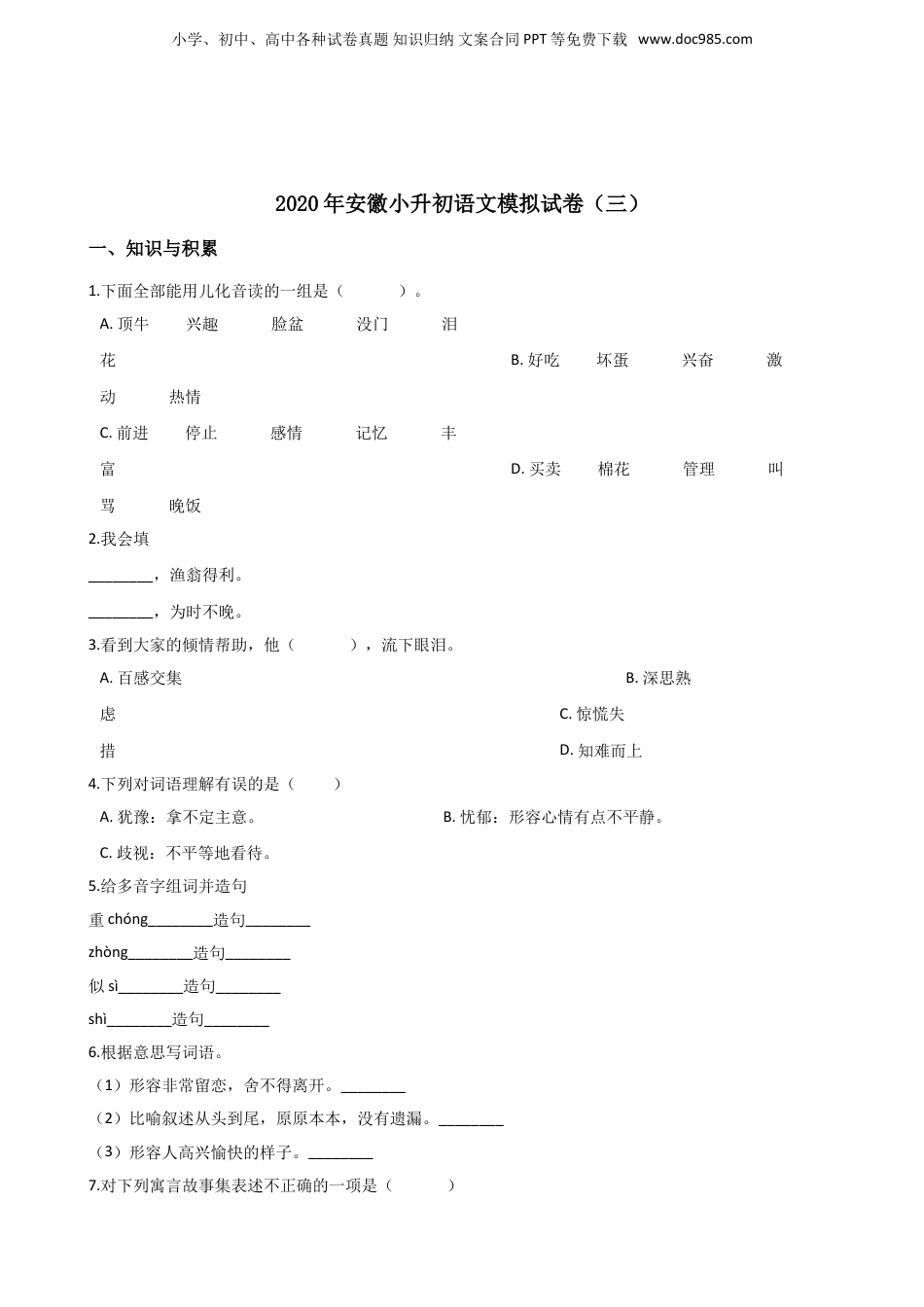 小学、初中、高中各种试卷真题知识归纳文案合同PPT等免费下载www.doc985.com2020年安徽小升初语文模拟试卷(三)一、知识与积累1.下面全部能用儿化音读的一组是()。A.顶牛兴趣脸盆没门泪花B.好吃坏蛋兴奋激动热情C.前进停止感情记忆丰富D.买卖棉花管理叫骂晚饭2.我会填________,渔翁得利。________,为时不晚。3.看到大家的倾情帮助,他(),流下眼泪。A.百感交集B.深思熟虑C.惊慌失措D.知难而上4.下列对词语理解有误的是()A.犹豫:拿不定主意。B.忧郁:形容心情有点不平静。C.歧视:不平等地看待。5.给多音字组词并造句重chóng________造句________zhòng________造句________似sì________造句________shì________造句________6.根据意思写词语。(1)形容非常留恋,舍不得离开。________(2)比喻叙述从头到尾,原原本本,没有遗漏。________(3)形容人高兴愉快的样子。________7.对下列寓言故事集表述不正确的一项是()小学、初中、高中各种试卷真题知识归纳文案合同PPT等免费下载www.doc985.comA.《中国古代寓言》中,许多故事短小而精悍(hàn),蕴(yùn)藏着深刻的道理。B.《伊索寓言》收集整理了很多古希腊的民间故事。C.《克雷洛夫寓言》是俄国杰出寓言家拉·封丹的作品集。8.填上恰当的关联词。________除夕之夜要守岁,________除了很小的孩子,没有人睡觉。9.下列句子中,标点符号使用正确的一项是()。A.紫禁城的城墙十米多高,有四座城门:南面午门、北面神武门、东西面东华门、西华门。B.进了太和门,就到紫禁城的中心,三大殿:太和殿、中和殿、保和殿。C.广场北面乾清门以内叫“内廷”,是皇帝和后妃们起居生活的地方,主要建筑有乾青宫、交泰殿、坤宁宫和东六宫,西六宫。D.前三殿的图案以龙为主,后三宫凤凰逐斩增加,出现了双凤朝日、龙凤是祥彩画,还有凤、舞凤、凤凰牡丹等图案。10.下列与例句表达的意思不相同的一句是()例句:我恋着西山、昆明湖、长城。A.我恋着西山,恋着昆明湖,恋着那雄伟绵延的长城。B.西山、昆明湖、长城,是我朝思暮想的故乡美景。C.怎么能说我恋着西山、昆明湖、长城呢?D.我喜欢西山、昆明湖和长城。二、阅读理解11.阅读古文,完成练习。匡(kuānq)衡凿(záo)壁借光匡衡勤学而无烛,邻舍有烛而不逮①,衡乃穿壁引其光,以书映②光而读之。邑人大姓文不识,家富多书,衡乃与其佣作而不求偿③。主人怪④,问衡,衡曰:“愿得主人书遍读之。”主人感叹,资给⑤以书,遂⑥成大学。【注】①逮:达到,及。②映:照。③偿:报酬,回报。④怪:对……感到奇怪。⑤资给:资助,供给。⑥遂:最终,终于。(1)“凿壁”的“凿”,下列解释正确的一项是()A.挖槽或穿孔用的工具,称“凿子”B.打孔,穿通C.明确,真实小学、初中、高中各种试卷真题知识归纳文案合同PPT等免费下载www.doc985.com(2)下面对本文内容分析正确的一项是()A.邻居家有蜡烛,但烛光照不到匡衡家。B.匡衡自己家也有蜡烛。C.匡衡帮一个叫“文不识”的人干活是有工钱的。D.匡衡最后成不了大学问家。(3)你从匡衡身上学到了什么?12.阅读文章,回答问题。友情拯救了生命两个朋友一起到北极探险,不料在返回途中迷了路,身陷冰谷。寒风像刀子一样刮着两个人的身体。他们凭着钢铁般顽强的毅力始终不渝地寻找着出路。意外的情况发生了,由于滞留时间过长,加之天气实在太冷,他们随身携带的水壶都上冻了,水,变成了冰。长途跋涉,疲惫不堪之际,一口水甚至比一碗面还重要!终于,其中一人因无法忍受饥渴,突然昏倒了!另外一个人感觉到死神在向他们袭来。望着脚下同伴,他的心激烈地跳动着。就在他差点流出绝望的泪水时,一个念头灵光般闪进他的脑海。于是,他果断地把水壶揣进怀里,揣在贴胸口最近的地方,然后,毅然背起同伴上路了。后来,他把带着体温的水一口一口地送进同伴的嘴里。同伴醒来了,他却由于疲劳和冰冷倒下了。再后来,他的同伴也把水壶揣进自己的怀里,然后又背起他,继续前行。在当时的情况下,如果两个人中的任何一个存有私心,他们就极有可能一齐被死神掳走。而事实是,两个人都活了下来。在以后的日子里。他们仍喜欢一起出去...