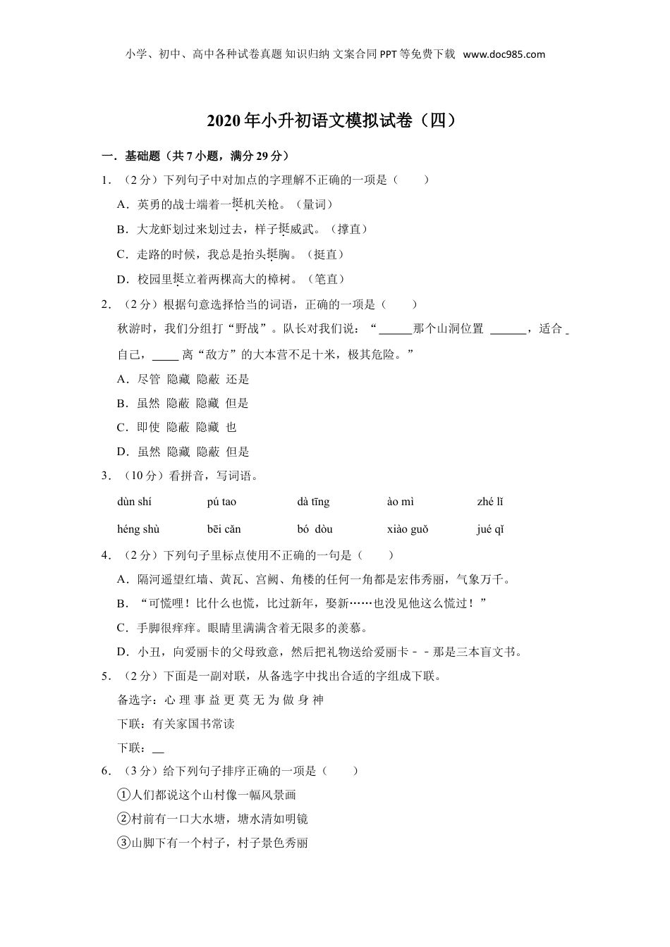 小学、初中、高中各种试卷真题知识归纳文案合同PPT等免费下载www.doc985.com2020年小升初语文模拟试卷(四)一.基础题(共7小题,满分29分)1.(2分)下列句子中对加点的字理解不正确的一项是()A.英勇的战士端着一挺机关枪。(量词)B.大龙虾划过来划过去,样子挺威武。(撑直)C.走路的时候,我总是抬头挺胸。(挺直)D.校园里挺立着两棵高大的樟树。(笔直)2.(2分)根据句意选择恰当的词语,正确的一项是()秋游时,我们分组打“野战”。队长对我们说:“那个山洞位置,适合自己,离“敌方”的大本营不足十米,极其危险。”A.尽管隐藏隐蔽还是B.虽然隐蔽隐藏但是C.即使隐蔽隐藏也D.虽然隐藏隐蔽但是3.(10分)看拼音,写词语。dùnshípútaodàtīngàomìzhélǐhéngshùbēicǎnbódòuxiàoguǒjuéqǐ4.(2分)下列句子里标点使用不正确的一句是()A.隔河遥望红墙、黄瓦、宫阙、角楼的任何一角都是宏伟秀丽,气象万千。B.“可慌哩!比什么也慌,比过新年,娶新……也没见他这么慌过!”C.手脚很痒痒。眼睛里满满含着无限多的羡慕。D.小丑,向爱丽卡的父母致意,然后把礼物送给爱丽卡﹣﹣那是三本盲文书。5.(2分)下面是一副对联,从备选字中找出合适的字组成下联。备选字:心理事益更莫无为做身神下联:有关家国书常读下联:6.(3分)给下列句子排序正确的一项是()①人们都说这个山村像一幅风景画②村前有一口大水塘,塘水清如明镜③山脚下有一个村子,村子景色秀丽小学、初中、高中各种试卷真题知识归纳文案合同PPT等免费下载www.doc985.com④塘里荷花点点,偶尔有小鱼跳出水面⑤村后有一片青翠的竹林,林中鸟声清脆悦耳⑥水里倒映着蓝天白云A.⑤②③⑥④①B.③②⑥④⑤①C.③⑤②⑥④①D.③①②⑥⑤④7.(8分)来到了句子大本营,展示一下你的聪明才智吧!(1)狂风刮断了树枝。(改成“把”字句,“被”字句)(2)月亮落下去了。(把句子写的更生动、具体)(3)同学们聚精会神地听王爷爷讲红军长征的故事。(缩句)(4)校园的早晨。(把句子补充完整)二.填空题(共7小题,满分11分)8.(1分)中华民族自古至今都是一个英雄辈出的民族。鲁迅先生曾说过:“我们从古以来,就有,有,有,有舍身求法的人……这就是。”9.(1分)《饮湖上初晴后雨》诗中,诗人描写了西湖晴天和雨天美丽景色的诗句是:,。10.(2分)群儿,一儿瓮,足水中。众皆,光击瓮破之,水迸,儿。11.(1分)李明的爸爸是宇航员。这个周末,李明的好朋友王珊准备向李明爸爸了解宇航员在太空的生活,李明笑着说:“你算是找对人了。正如《书戴嵩画牛》中说的“,。”12.(2分)《书湖阴先生壁》中,把山水化成具有生命情感的形象,主动与人亲近,以此赞美湖阴先生高洁品质的诗句是,。13.(2分)“,。”通过写梅与雪的特点,告诉我们任何事物都是一分为二的,有长处必然也有短处;唐代诗人王翰在《》中写道:“,?”描绘了将士们视死如归的勇气;老师常引用代诗人苏轼在《题西林壁》中的诗句:“,。”教我们写作时要写出自己独特的见解。俗语“,。”说的也是这个道理。14.(2分)“国学”是中华民族优秀文化集中体现,请你写出两部国学经典作品:《小学、初中、高中各种试卷真题知识归纳文案合同PPT等免费下载www.doc985.com》《》。三.语言表达(共1小题,满分5分)15.(5分)仔细观察漫画,按要求回答问题。(1)这幅漫画里描绘了什么事?用简洁的语言说明内容。(2)给漫画拟一个恰当的题目。(3)如果你的家里(亲戚)也有这种情况,你想对你的父母(亲戚说点什么?请写下来。四.现代文阅读(共2小题,满分25分)16.(10分)阅读英国伟大的物理学家牛顿是在外祖母家长大的。外祖母很疼爱他,八岁上学后,还常常给他一点零用钱。小牛顿一不买糖果,二不买玩具,他把钱积攒(zǎnzhǎn)起来,去(买卖)锤子和锯子。他喜欢自己动脑筋,做一些手工制品。一天,小牛顿兴冲冲地跑到外祖母面前说:“外婆,你看这个。”外祖母一看:小牛顿手里捧着一块木板,中间钉着一个钉(dīngdìng)子,四周画着一条条放射形的线条。外祖母问:“这是什么呀?...