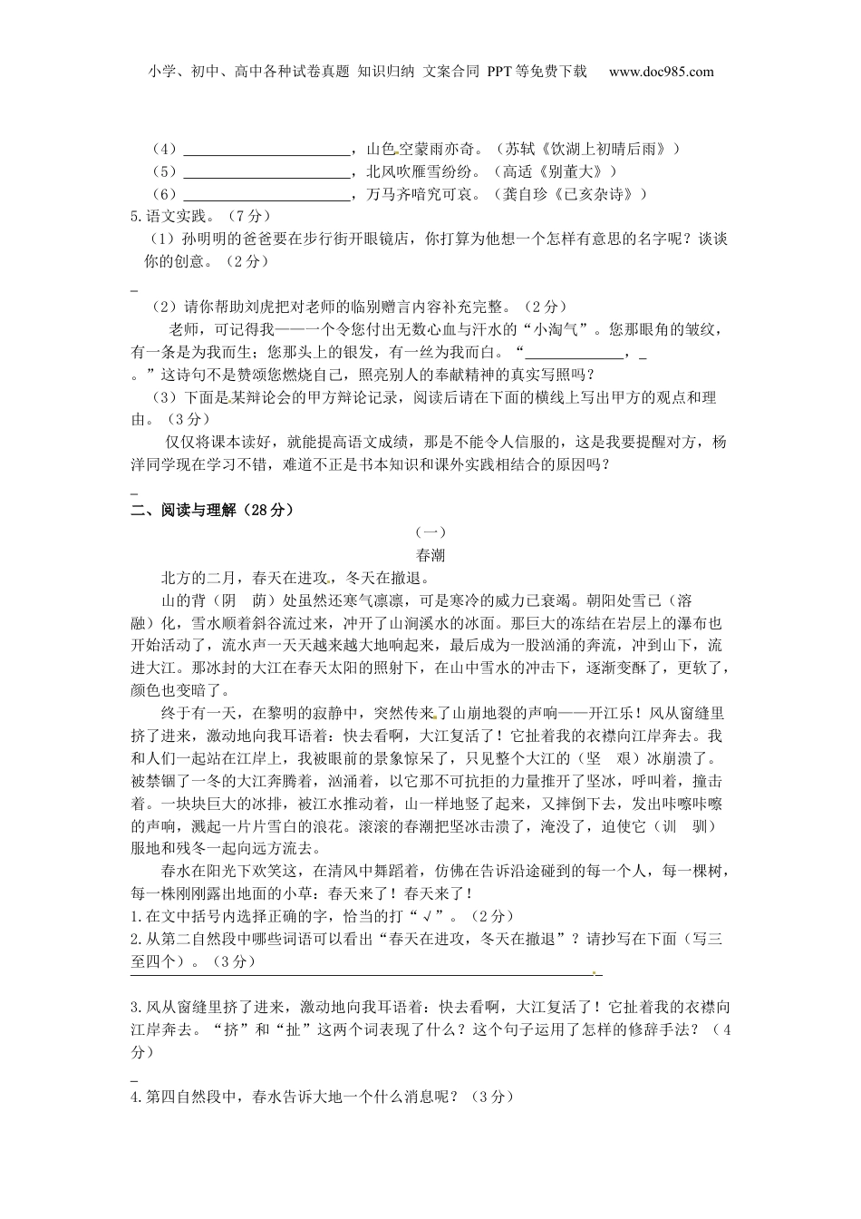 小学、初中、高中各种试卷真题知识归纳文案合同PPT等免费下载www.doc985.com小升初语文模拟试卷(十一)(分满100分,时间90分)钟一、积累与运用(42分)1.根据拼音读句填词。(8分)zhànlánguòlǜ(1)春天的野外,天空格外(),清新的空气像()过似的,méiguitiánlǒng(2)到处弥漫着()醉人的芬芳。()上走过一个盲女孩,长发piāoyìtiánjìngzhànfàng(3)在风中(),()的脸上()着笑容。她,手持fēngzhēng(),和我们一起放飞希望!2、词语百花园。(11分)(1)照例子写字词。(2分)例:表示“红”的意思的字:赤朱丹彤表示“绿”的意思的字:(2)把不一类的一个词划去。(2分)画笔砚墨纸(3)根据要求写成语。(4分)①与合作有关的成语:②与“时光荏苒”意思相近的成语:(4)选择合适的词语填空。(3分)墨黑蓝蓝闪烁飘飞轻柔温暖①太阳给月亮写信。铺开天空()的信笺,用金灿灿的阳光,写下()的问候。()的云彩,是问候开出的花朵。②月亮给太阳写信。铺开天空()的信笺,用银亮亮的月光,写下()的问候。()的星星,是问候开出的花朵。3.句子小天地。(10分)(1)春天,一朵朵花儿开放了。(把物当作人来写,使句子更生动。)(2分)(2)这些句子好生动,我会接着写。(4分)花开了,就像花睡醒似的;虫子叫了,就像;,。(3)病句修改。(4分)①通过主题队会,激发了我们热爱祖国的感情。②历史博物馆展出了两千多年前的新出土的一大批文物。4.古诗文默写。(6分)(1)少壮不努力,。(汉乐府《长歌行》)(2)九曲黄河万里沙,。(刘禹锡《浪淘沙》)(3)一水护田将绿绕,。(王安石《书湖阴先生壁》)小学、初中、高中各种试卷真题知识归纳文案合同PPT等免费下载www.doc985.com(4),山色空蒙雨亦奇。(苏轼《饮湖上初晴后雨》)(5),北风吹雁雪纷纷。(高适《别董大》)(6),万马齐喑究可哀。(龚自珍《已亥杂诗》)5.语文实践。(7分)(1)孙明明的爸爸要在步行街开眼镜店,你打算为他想一个怎样有意思的名字呢?谈谈你的创意。(2分)(2)请你帮助刘虎把对老师的临别赠言内容补充完整。(2分)老师,可记得我——一个令您付出无数心血与汗水的“小淘气”。您那眼角的皱纹,有一条是为我而生;您那头上的银发,有一丝为我而白。“,。”这诗句不是赞颂您燃烧自己,照亮别人的奉献精神的真实写照吗?(3)下面是某辩论会的甲方辩论记录,阅读后请在下面的横线上写出甲方的观点和理由。(3分)仅仅将课本读好,就能提高语文成绩,那是不能令人信服的,这是我要提醒对方,杨洋同学现在学习不错,难道不正是书本知识和课外实践相结合的原因吗?二、阅读与理解(28分)(一)春潮北方的二月,春天在进攻,冬天在撤退。山的背(阴荫)处虽然还寒气凛凛,可是寒冷的威力已衰竭。朝阳处雪已(溶融)化,雪水顺着斜谷流过来,冲开了山涧溪水的冰面。那巨大的冻结在岩层上的瀑布也开始活动了,流水声一天天越来越大地响起来,最后成为一股汹涌的奔流,冲到山下,流进大江。那冰封的大江在春天太阳的照射下,在山中雪水的冲击下,逐渐变酥了,更软了,颜色也变暗了。终于有一天,在黎明的寂静中,突然传来了山崩地裂的声响——开江乐!风从窗缝里挤了进来,激动地向我耳语着:快去看啊,大江复活了!它扯着我的衣襟向江岸奔去。我和人们一起站在江岸上,我被眼前的景象惊呆了,只见整个大江的(坚艰)冰崩溃了。被禁锢了一冬的大江奔腾着,汹涌着,以它那不可抗拒的力量推开了坚冰,呼叫着,撞击着。一块块巨大的冰排,被江水推动着,山一样地竖了起来,又摔倒下去,发出咔嚓咔嚓的声响,溅起一片片雪白的浪花。滚滚的春潮把坚冰击溃了,淹没了,迫使它(训驯)服地和残冬一起向远方流去。春水在阳光下欢笑这,在清风中舞蹈着,仿佛在告诉沿途碰到的每一个人,每一棵树,每一株刚刚露出地面的小草:春天来了!春天来了!1.在文中括号内选择正确的字,恰当的打“√”。(2分)2.从第二自然段中哪些词语可以看出“春天在进攻,冬天在撤退”?请抄写在下面(写三至四个)。(3分)3.风从窗缝里挤了进来,激动地向我耳语着:快去看啊...