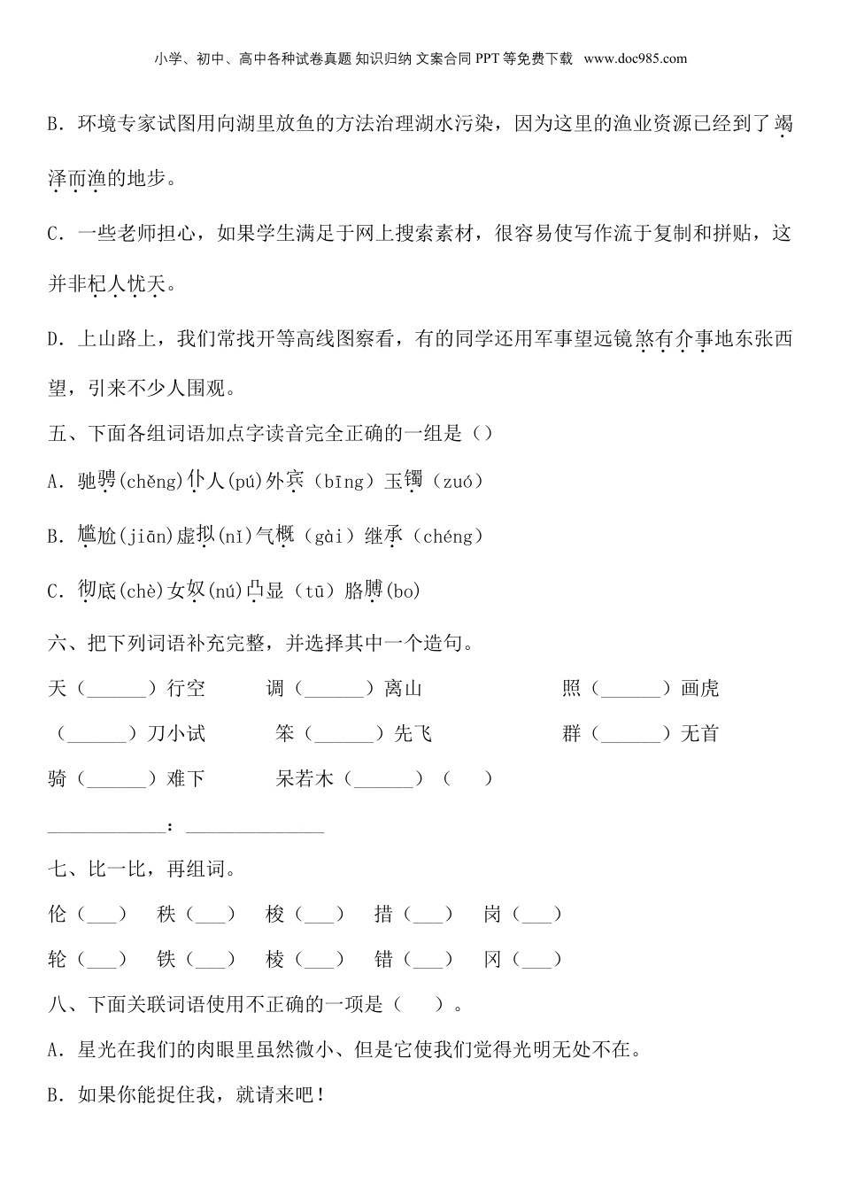 小学、初中、高中各种试卷真题知识归纳文案合同PPT等免费下载www.doc985.com部编版小升初语文字词专项练习七一、根据提示拼音,补全词语。Biāo柄千古()精兵jiǎn政()追本sù源()白璧微xiá()肆无忌dàn()远大bào负()二、看拼音,写词语。quǎnfèizītàigǒuqiěyīndiàozhèngzhònglìshēngshènzhìpìrúmǐnjiéángyáng三、下列各句中加点的词语使用恰当的一句是()A.“书山有路勤为径”,在知识爆炸的今天,我们更要努力攀登书山,而不能高山仰止。B.我们的某些规章制度还不很健全,有的“聪明人”便打起了擦边球,以此谋取私利。C.时下,网络文学蓬勃发展,痞子蔡就是屈指可数的网络写手之一。D.周末,我和同桌一起去攀岩,虽然崖壁陡峭,我们仍然摩肩接踵,奋力攀登。四、下列句子中,加点的成语使用不恰当的一句是()A.许多分析人士认为,微软收购雅虎这场角逐,可谓两败俱伤,而让他们强大的对手谷歌渔翁得利。小学、初中、高中各种试卷真题知识归纳文案合同PPT等免费下载www.doc985.comB.环境专家试图用向湖里放鱼的方法治理湖水污染,因为这里的渔业资源已经到了竭泽而渔的地步。C.一些老师担心,如果学生满足于网上搜索素材,很容易使写作流于复制和拼贴,这并非杞人忧天。D.上山路上,我们常找开等高线图察看,有的同学还用军事望远镜煞有介事地东张西望,引来不少人围观。五、下面各组词语加点字读音完全正确的一组是()A.驰骋(chěng)仆人(pú)外宾(bīng)玉镯(zuó)B.尴尬(jiān)虚拟(nǐ)气概(gài)继承(chéng)C.彻底(chè)女奴(nú)凸显(tū)胳膊(bo)六、把下列词语补充完整,并选择其中一个造句。天(______)行空调(______)离山照(______)画虎(______)刀小试笨(______)先飞群(______)无首骑(______)难下呆若木(______)()____________:______________七、比一比,再组词。伦(___)秩(___)梭(___)措(___)岗(___)轮(___)铁(___)棱(___)错(___)冈(___)八、下面关联词语使用不正确的一项是()。A.星光在我们的肉眼里虽然微小、但是它使我们觉得光明无处不在。B.如果你能捉住我,就请来吧!小学、初中、高中各种试卷真题知识归纳文案合同PPT等免费下载www.doc985.comC.之所以飞机飞行更安全了,是因为驾驶员在雷达的荧光屏上能够清楚地看到前方有没有障碍物。D.因为它远不如我想象中的那么漂亮,所以我极高兴地接受了它。九、写出下列词语的近义词。预防(_________)健康(_________)普通(_________)新奇(_________)先进(_________)十、把下列词语补充完整,并按要求写词语。(15分)鹤(______)童(______)面如(______)(______)(______)(______)彬彬慈(______)善(______)(______)发(______)中聚(______)会(______)(1).再写出两个ABCC式的词语:__________________、__________________。(2).再写出两个描写外貌的词语:__________________、__________________。十一、给下面的多音字注音,并组词。茄:①()--()②()--()夹:①()--()②()--()十二、标出下面词语中的错别字改正并对其注音。不记其数()污告()报歉()额首称庆()追朔()鬼鬼崇崇()十三、找出下列成语中的错别字,更正在括号中。肆无忌殚()既往开来()佳言懿行()艰壁清野()不可思异()克尽职守()万恶不射()仗义直言()十四、补全下列四字词小学、初中、高中各种试卷真题知识归纳文案合同PPT等免费下载www.doc985.com睡眼()针锋()()轮回()一律勾肩()唇枪()()承迎()千山十五、根据成语释义,填写合适成语在括号中(1).成语释义:指唱戏、唱歌或念白、朗读时吐字清晰准确,腔调圆润悦耳。()(2).成语释义:音乐停止后,余音仿佛正在绕着屋梁回旋。形容歌声或音乐优美动听,耐人回味。()(3).成语释义:音乐戏曲的曲调、唱腔合乎节拍,比喻言语行动有条不紊,富有节奏或章法。()(4).成语释义:桃花嫣红,柳枝碧绿。用来形容花木繁盛、色彩鲜艳的春景。()【参考答案】一、彪简溯瑕惮抱二、犬吠姿态苟且音调郑...