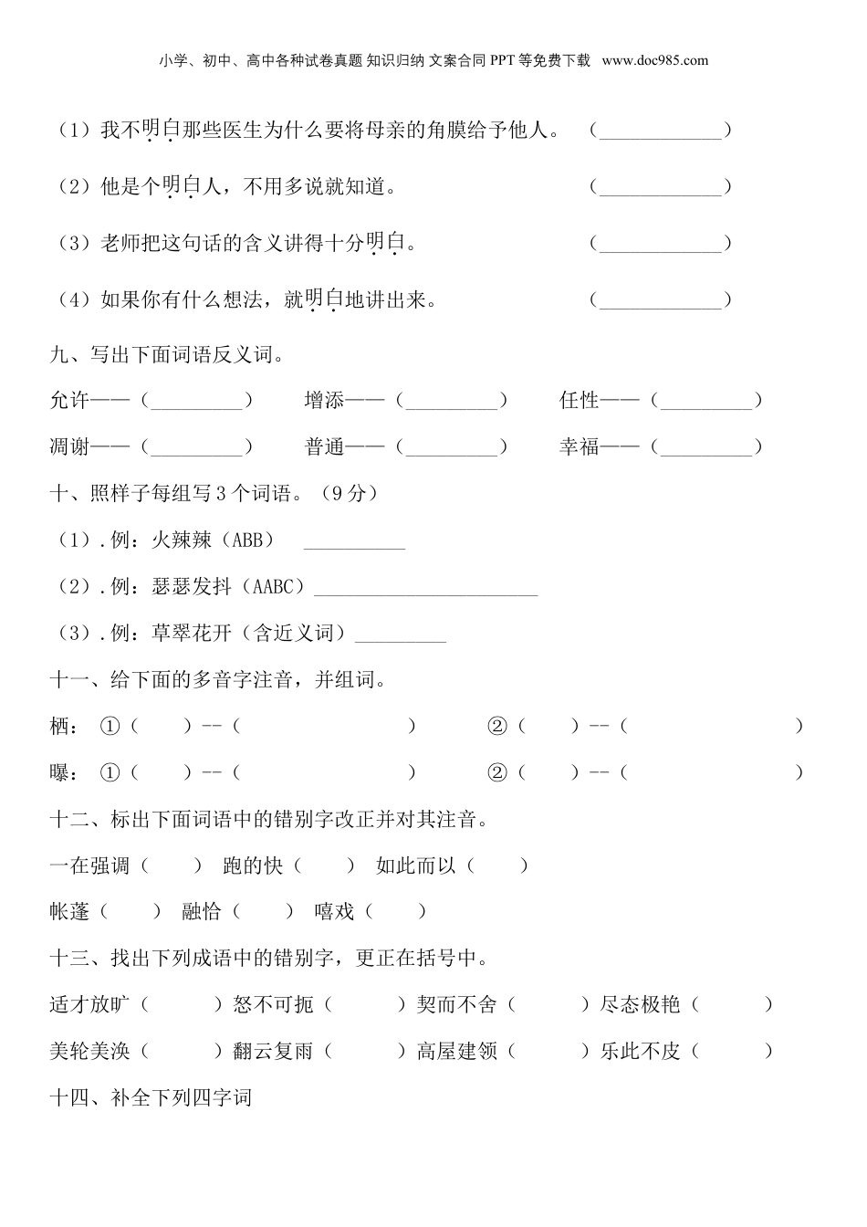 小学、初中、高中各种试卷真题知识归纳文案合同PPT等免费下载www.doc985.com部编版小升初语文字词专项练习十一、根据提示拼音,补全词语。越zǔ代庖()为虎作chāng()不láng不莠()yuán木求鱼()Xǔxǔ栩如生()yǐ老卖老()二、看拼音写词语。tànhuàwùgāngtiějiànkāngxìbāobìngzàojíbìngyùfángxūyàoyǐnxínggōngnéng三、下列各句中,加点的成语使用恰当的一句是()A.那本介绍学习方法的书出版后,受到中小学生和家长们的热烈欢迎,一时洛阳纸贵。B.科技发展带来的便利是不容分说的,千里之外的问候,只要一个短信瞬间就能完成。C.假以时日,我们可以巧立名目,开发大批新颖别致的旅游项目,为景区再添光彩。D.学习了他的先进事迹后,我们每一个青年都应该追本溯源,看看自己做得如何。四、下列语句中加点的成语使用有误的一项是()小学、初中、高中各种试卷真题知识归纳文案合同PPT等免费下载www.doc985.comA.“成都名师论坛”上,名师的教学与作家的演讲相得益彰,让听众尽享文学之美。B.入选“感动中国十大人物,的梁益建大夫,医术精湛,医德高尚,令同行肃然起敬。C.国学泰斗季羡林先生深信开卷有益,生前多次在不同场合倡导青少年要广泛阅读。D.正如演出前预料的那样,赵雷将歌曲《成都》演绎得荡气回肠,这让导演喜出望外。五、下面加点字的读音全部正确的一组是()A.顷刻(qǐnɡ)华雄(huà)潜水(qiǎn)半晌(shǎnɡ)B.号召(zhāo)白术(zhú)滂沱(pánɡ)夹杂(jiā)C.狩猎(shòu)艄公(shāo)川芎(xiōnɡ)殡仪馆(bìn)D.愧疚(jiū)而且(ér)应声(yìnɡ)给予(jǐ)六、按要求写词语。(1)“嫦娥奔月”是我国古代的神话传说请你再写三个关于人与自然关系的神话传说:_____________、_____________、_____________。(2)“鲲鹏展翅”中的“鲲”是指古代传说中的_____________,传说鲲后来变成一只大鸟名字叫作_____________。由此产生一个成语叫作“_____________”,用来比喻前程远大。七、比一比,再组词。焰(___)揽(___)驱(___)践(___)施(___)陷(___)览(___)躯(___)钱(___)拖(___)八、给加点的词语选择正确意思。明白:a清楚,明确;b公开的,不含糊的;c知道,了解;d聪明,懂道理。小学、初中、高中各种试卷真题知识归纳文案合同PPT等免费下载www.doc985.com(1)我不明白那些医生为什么要将母亲的角膜给予他人。(____________)(2)他是个明白人,不用多说就知道。(____________)(3)老师把这句话的含义讲得十分明白。(____________)(4)如果你有什么想法,就明白地讲出来。(____________)九、写出下面词语反义词。允许——(_________)增添——(_________)任性——(_________)凋谢——(_________)普通——(_________)幸福——(_________)十、照样子每组写3个词语。(9分)(1).例:火辣辣(ABB)__________(2).例:瑟瑟发抖(AABC)______________________(3).例:草翠花开(含近义词)_________十一、给下面的多音字注音,并组词。栖:①()--()②()--()曝:①()--()②()--()十二、标出下面词语中的错别字改正并对其注音。一在强调()跑的快()如此而以()帐蓬()融恰()嘻戏()十三、找出下列成语中的错别字,更正在括号中。适才放旷()怒不可扼()契而不舍()尽态极艳()美轮美涣()翻云复雨()高屋建领()乐此不皮()十四、补全下列四字词小学、初中、高中各种试卷真题知识归纳文案合同PPT等免费下载www.doc985.com神气()济济()()扶伤()花朝摇头()门庭()()鼎鼎()花前十五、根据成语释义,填写合适成语在括号中(1).成语释义:一天一天地、一月一月地不断积累。指长时间不断地积累。()(2).成语释义:指学习工作等按照一定的步骤逐渐深入或提高。()(3).成语释义:恩情深厚,像山一样深重。()(4).成语释义:形容情爱深厚,像大海一样不可量。()【参考答案】一、俎伥稂缘栩倚二、碳化物钢铁健康细胞病灶疾病预防需要隐形功能三、A解析:“洛阳纸贵”,称颂杰出的作品风行一时。“不容分说”:分说指辩...