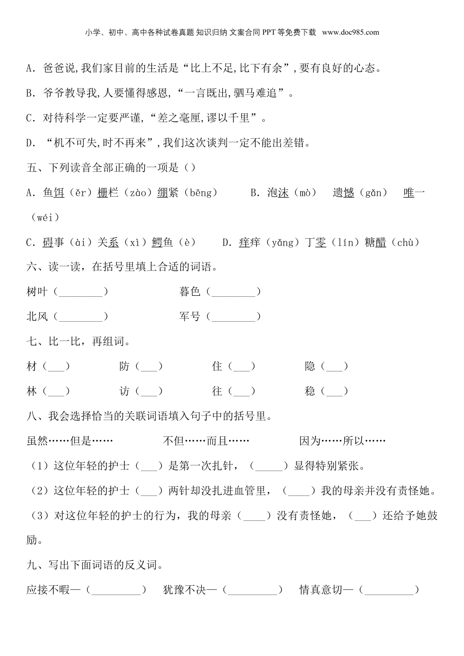 小学、初中、高中各种试卷真题知识归纳文案合同PPT等免费下载www.doc985.com部编版小升初语文字词专项练习十五一、根据提示拼音,补全词语。治丝益fén()一cù而就()利害yōu关()无礼mán骂()yǎo无音信()yǒng往直前()二、看拼音写词语。tànhuàwùgāngtiějiànkāngxìbāobìngzàojíbìngyùfángxūyàoyǐnxínggōngnéng三、下列各句中,加点的词语运用正确的一句是()A.马大嫂为人热情,工作兢兢业业,总是不胜其烦地为小区居民做好每一件事。B.我终于登上了魂牵梦萦的黄山,奇松异石、流云飞瀑宛然在目,令人赞叹不已。C.正是这些变通的劳动者,凭借着理想与信念,胼手胝足,夙兴夜寐,创造了一个个奇迹。D.他鲁莽草率,刚愎自用,走到哪里哪里就被他闹得一团糟,真可谓“人中吕布,马中赤兔”。四、下列句子中,成语使用不恰当的一项是()。小学、初中、高中各种试卷真题知识归纳文案合同PPT等免费下载www.doc985.comA.爸爸说,我们家目前的生活是“比上不足,比下有余”,要有良好的心态。B.爷爷教导我,人要懂得感恩,“一言既出,驷马难追”。C.对待科学一定要严谨,“差之毫厘,谬以千里”。D.“机不可失,时不再来”,我们这次谈判一定不能出差错。五、下列读音全部正确的一项是()A.鱼饵(ěr)栅栏(zào)绷紧(bēng)B.泡沫(mò)遗憾(gǎn)唯一(wéi)C.碍事(ài)关系(xì)鳄鱼(è)D.痒痒(yǎng)丁零(lín)糖醋(chù)六、读一读,在括号里填上合适的词语。树叶(________)暮色(________)北风(________)军号(________)七、比一比,再组词。材(___)防(___)住(___)隐(___)林(___)访(___)往(___)稳(___)八、我会选择恰当的关联词语填入句子中的括号里。虽然……但是……不但……而且……因为……所以……(1)这位年轻的护士(___)是第一次扎针,(_____)显得特别紧张。(2)这位年轻的护士(___)两针却没扎进血管里,(____)我的母亲并没有责怪她。(3)对这位年轻的护士的行为,我的母亲(____)没有责怪她,(___)还给予她鼓励。九、写出下面词语的反义词。应接不暇—(_________)犹豫不决—(_________)情真意切—(_________)小学、初中、高中各种试卷真题知识归纳文案合同PPT等免费下载www.doc985.com十、把下列词语补充完整,并按要求写词语。(15分)鹤(____)童(____)面如(____)(____)(____)(____)彬彬慈(____)善(____)(____)发(____)中聚(____)会(____)(1).再写出两个ABCC式的词语:____________、____________。(2).再写出两个描写外貌的词语:____________、____________。十一、给下面的多音字注音,并组词。散:①()--()②()--()丧:①()--()②()--()十二、标出下面词语中的错别字改正并对其注音。大才小用()令人辛酸()欢心鼓舞()兴高彩烈()气式汹汹()旅客需知()十三、找出下列成语中的错别字,更正在括号中。金榜提名()金壁辉煌()金刚努目()金钢钻头()面面相觊()海市胜楼()期期哀哀()根深地固()十四、补全下列四字词默默()不约()()吐艳()所短万紫()笑容()()缤纷()所长十五、根据成语释义,填写合适成语在括号中(1).成语释义:拾取人家的片言只语当做自己的话。()(2).成语释义:喻文章议论新奇惊人。媒体多用于惊人消息,误。()小学、初中、高中各种试卷真题知识归纳文案合同PPT等免费下载www.doc985.com(3).成语释义:假使自己处在别人的地位或境遇。指替别人的处境着想。()(4).成语释义:(贬)上面或上辈的人怎么做,下面的人就学着怎么做(多指不好的事)。不用于表示群众以干部为榜样。()【参考答案】一、棼蹴攸谩杳勇二、碳化物钢铁健康细胞病灶疾病预防需要隐形功能三、C解析:“不胜其烦”胜:禁得起;烦:烦琐。烦琐得使人受不了。“胼手胝足”胼pián、胝zhī:老茧。手脚上磨出老茧。形容经常地辛勤劳动。四、B五、C六、飘落降临呼啸齐鸣七、木材防止住处隐藏林间访问往来稳重八、(1)因为所以(2)虽然但是(3)不但而且九、应付自如毅然决然虚情假意十...