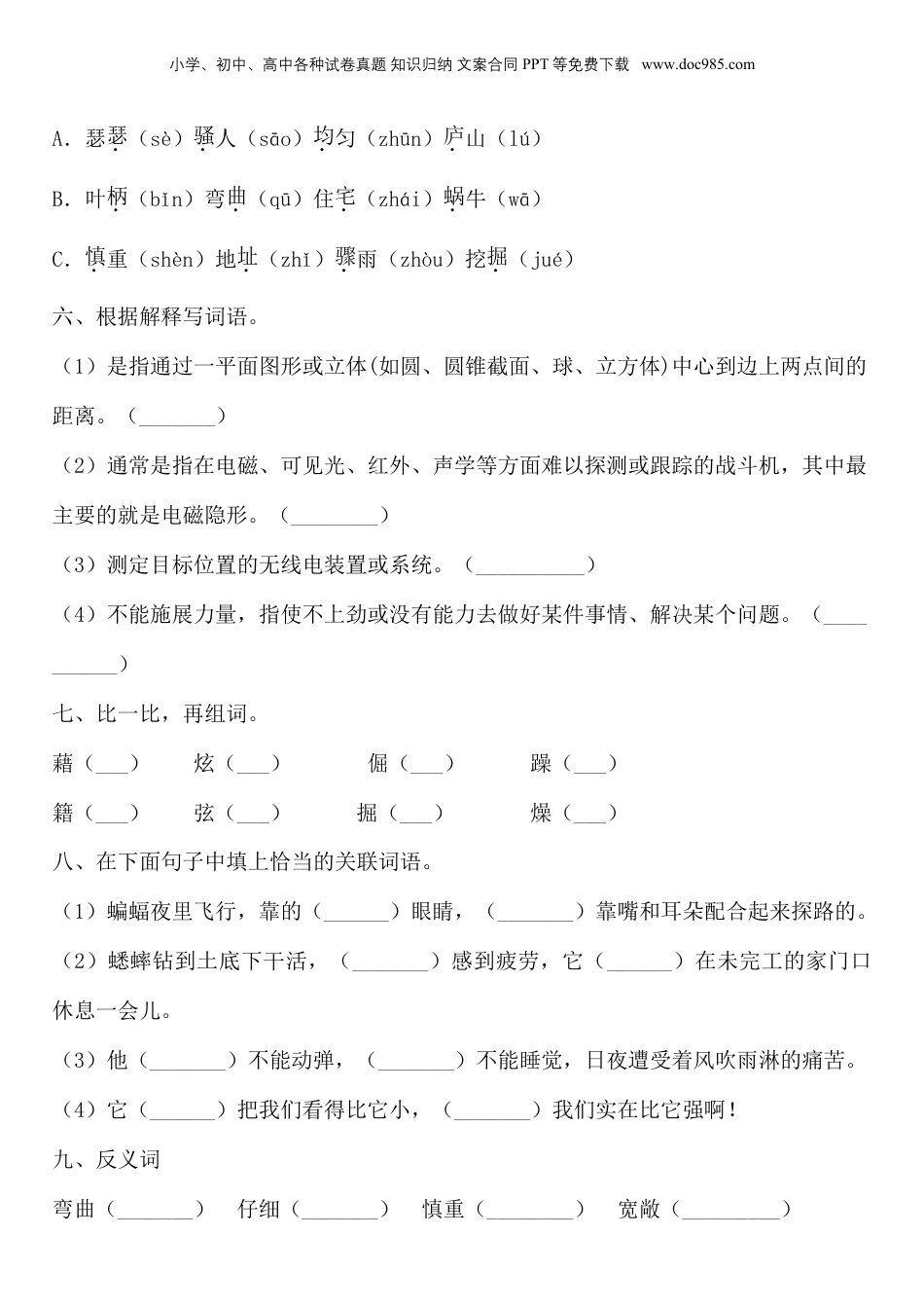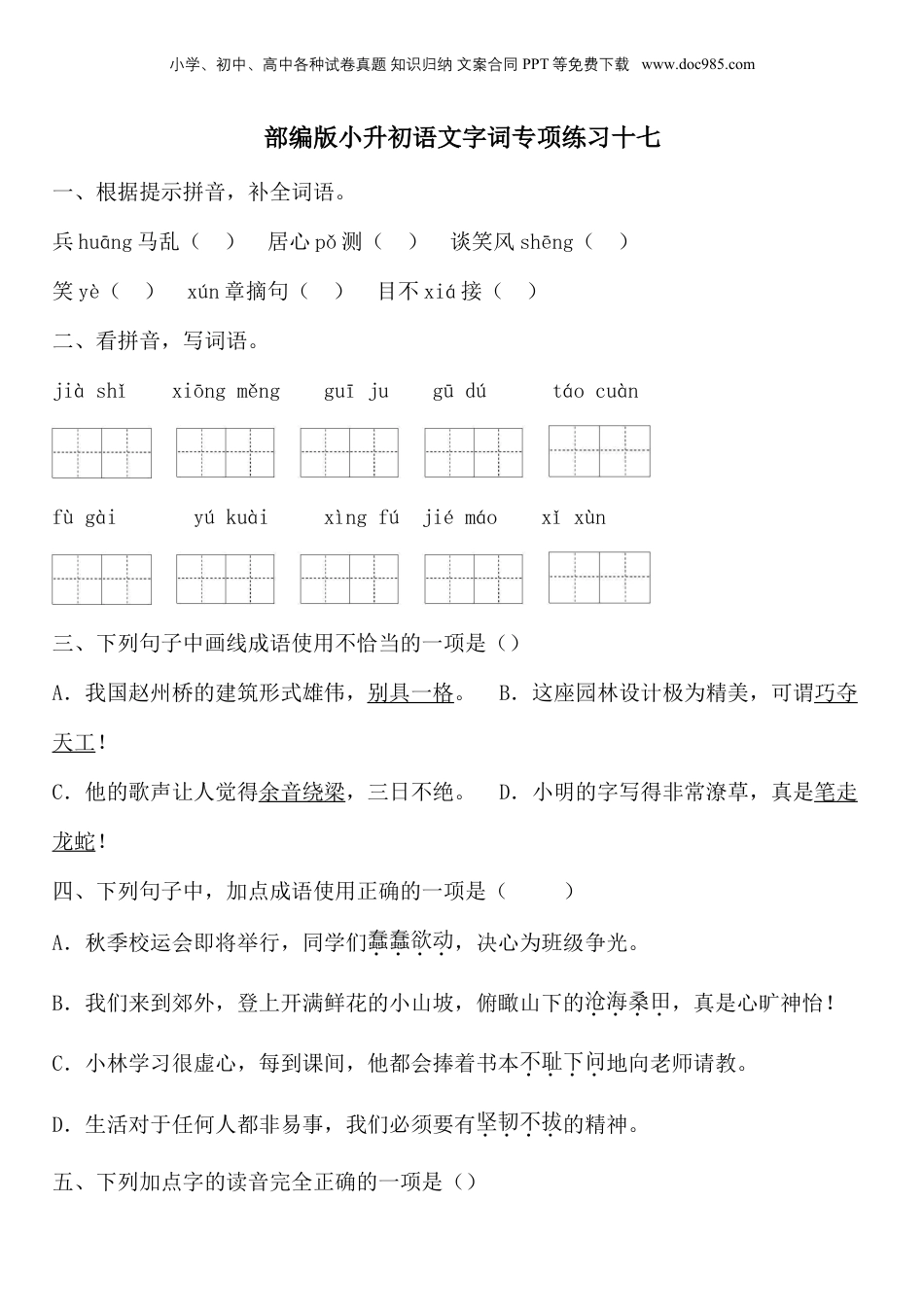 小学、初中、高中各种试卷真题知识归纳文案合同PPT等免费下载www.doc985.com部编版小升初语文字词专项练习十七一、根据提示拼音,补全词语。兵huāng马乱()居心pǒ测()谈笑风shēng()笑yè()xún章摘句()目不xiá接()二、看拼音,写词语。jiàshǐxiōngměngguījugūdútáocuànfùgàiyúkuàixìngfújiémáoxǐxùn三、下列句子中画线成语使用不恰当的一项是()A.我国赵州桥的建筑形式雄伟,别具一格。B.这座园林设计极为精美,可谓巧夺天工!C.他的歌声让人觉得余音绕梁,三日不绝。D.小明的字写得非常潦草,真是笔走龙蛇!四、下列句子中,加点成语使用正确的一项是()A.秋季校运会即将举行,同学们蠢蠢欲动,决心为班级争光。B.我们来到郊外,登上开满鲜花的小山坡,俯瞰山下的沧海桑田,真是心旷神怡!C.小林学习很虚心,每到课间,他都会捧着书本不耻下问地向老师请教。D.生活对于任何人都非易事,我们必须要有坚韧不拔的精神。五、下列加点字的读音完全正确的一项是()小学、初中、高中各种试卷真题知识归纳文案合同PPT等免费下载www.doc985.comA.瑟瑟(sè)骚人(sāo)均匀(zhūn)庐山(lú)B.叶柄(bǐn)弯曲(qū)住宅(zhái)蜗牛(wā)C.慎重(shèn)地址(zhǐ)骤雨(zhòu)挖掘(jué)六、根据解释写词语。(1)是指通过一平面图形或立体(如圆、圆锥截面、球、立方体)中心到边上两点间的距离。(_______)(2)通常是指在电磁、可见光、红外、声学等方面难以探测或跟踪的战斗机,其中最主要的就是电磁隐形。(________)(3)测定目标位置的无线电装置或系统。(__________)(4)不能施展力量,指使不上劲或没有能力去做好某件事情、解决某个问题。(__________)七、比一比,再组词。藉(___)炫(___)倔(___)躁(___)籍(___)弦(___)掘(___)燥(___)八、在下面句子中填上恰当的关联词语。(1)蝙蝠夜里飞行,靠的(______)眼睛,(_______)靠嘴和耳朵配合起来探路的。(2)蟋蟀钻到土底下干活,(_______)感到疲劳,它(______)在未完工的家门口休息一会儿。(3)他(_______)不能动弹,(_______)不能睡觉,日夜遭受着风吹雨淋的痛苦。(4)它(______)把我们看得比它小,(_______)我们实在比它强啊!九、反义词弯曲(_______)仔细(_______)慎重(________)宽敞(_________)小学、初中、高中各种试卷真题知识归纳文案合同PPT等免费下载www.doc985.com柔弱(_______)安静(________)干燥(________)简单(________)十、写一写,并任选两个词语写一个句子。(9分)毛茸茸(ABB式):_______、_______、_______姗姗来迟(AABC式):_______、_______、_______白雪皑皑(ABCC式):_______、_______、________________________________十一、给下面的多音字注音,并组词。屏:①()--()②()--()便:①()--()②()--()十二、标出下面词语中的错别字改正并对其注音。一愁莫展()穿流不息()松驰()天翻地复()言简意骇()气慨()十三、找出下列成语中的错别字,更正在括号中。忽然开朗()祸国秧民()击浊扬清()嫉恶如仇()耳熟能祥()尔欲我诈()姑名钓誉()乌和之众()十四、补全下列四字词永驻()挑肥()()盘绕()叠嶂知己()无精()()雄外()参天十五、根据成语释义,填写合适成语在括号中(1).成语释义:(贬)漫无边际地大发议论。()小学、初中、高中各种试卷真题知识归纳文案合同PPT等免费下载www.doc985.com(2).成语释义:原指①代别人表示感谢,意谓感激的心情如同亲身受到恩惠。②自己能亲身感受到给别人带来的麻烦。现泛指虽未亲身经历,但感受就如同亲身经历一样。()(3).成语释义:改换琴弦、变更行车道路,喻改变方法或制度。()(4).成语释义:琴声不和谐,换了琴弦,重新装上,喻改革制度或变更方法。()小学、初中、高中各种试卷真题知识归纳文案合同PPT等免费下载www.doc985.com【参考答案】一、荒叵生靥寻暇二、驾驶凶猛规矩孤独逃窜覆盖愉快幸福睫毛喜讯三、D四、D五、C六、直径隐形战斗机雷达无能无力七、慰藉炫耀倔...