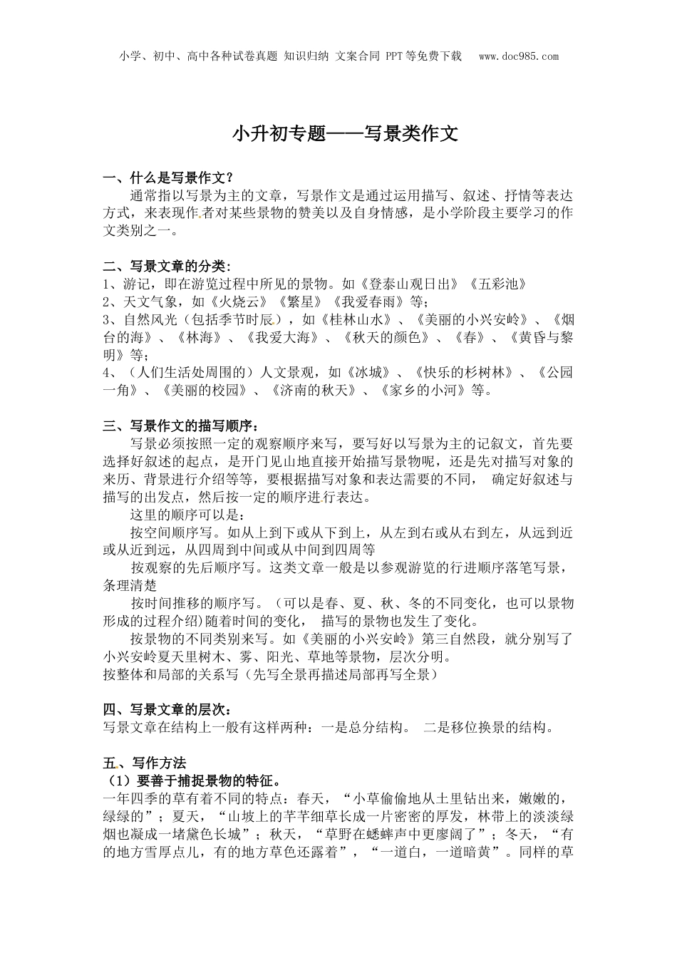 小学、初中、高中各种试卷真题知识归纳文案合同PPT等免费下载www.doc985.com小升初专题——写景类作文一、什么是写景作文?通常指以写景为主的文章,写景作文是通过运用描写、叙述、抒情等表达方式,来表现作者对某些景物的赞美以及自身情感,是小学阶段主要学习的作文类别之一。二、写景文章的分类:1、游记,即在游览过程中所见的景物。如《登泰山观日出》《五彩池》2、天文气象,如《火烧云》《繁星》《我爱春雨》等;3、自然风光(包括季节时辰),如《桂林山水》、《美丽的小兴安岭》、《烟台的海》、《林海》、《我爱大海》、《秋天的颜色》、《春》、《黄昏与黎明》等;4、(人们生活处周围的)人文景观,如《冰城》、《快乐的杉树林》、《公园一角》、《美丽的校园》、《济南的秋天》、《家乡的小河》等。三、写景作文的描写顺序:[来源:学科网ZXXK]写景必须按照一定的观察顺序来写,要写好以写景为主的记叙文,首先要选择好叙述的起点,是开门见山地直接开始描写景物呢,还是先对描写对象的来历、背景进行介绍等等,要根据描写对象和表达需要的不同,确定好叙述与描写的出发点,然后按一定的顺序进行表达。这里的顺序可以是:按空间顺序写。如从上到下或从下到上,从左到右或从右到左,从远到近或从近到远,从四周到中间或从中间到四周等按观察的先后顺序写。这类文章一般是以参观游览的行进顺序落笔写景,条理清楚按时间推移的顺序写。(可以是春、夏、秋、冬的不同变化,也可以景物形成的过程介绍)随着时间的变化,描写的景物也发生了变化。按景物的不同类别来写。如《美丽的小兴安岭》第三自然段,就分别写了小兴安岭夏天里树木、雾、阳光、草地等景物,层次分明。按整体和局部的关系写(先写全景再描述局部再写全景)四、写景文章的层次:写景文章在结构上一般有这样两种:一是总分结构。二是移位换景的结构。五、写作方法(1)要善于捕捉景物的特征。[来源:Z,xx,k.Com]一年四季的草有着不同的特点:春天,“小草偷偷地从土里钻出来,嫩嫩的,绿绿的”;夏天,“山坡上的芊芊细草长成一片密密的厚发,林带上的淡淡绿烟也凝成一堵黛色长城”;秋天,“草野在蟋蟀声中更廖阔了”;冬天,“有的地方雪厚点儿,有的地方草色还露着”,“一道白,一道暗黄”。同样的草小学、初中、高中各种试卷真题知识归纳文案合同PPT等免费下载www.doc985.com木在不同季节展现出迥异的风姿。(2)善于运用联想和想象,注意多种修辞手法的运用。把观察和联想、想象等思维活动结合起来,景物就可以突破有限的眼前,达到无限的世界。(3)融情于景,情景交融。把内心的“情”,自然地渗透到外物之中,这就是“情积于内而发之于景”。如:《芦花荡》结尾中写到:“他狠狠地敲打,向着苇塘望了一眼。在那里,鲜嫩的芦花。一片展开的紫色的丝绒,正在迎风飘洒。”把老头子复仇成功后的喜悦舒畅的心情表现了出来。(4)对比式描写还可以将人物在不同年代、不同情况下的不同感受,通过景物体现出来,这种景物的对比可以突出中心。如:“首次看见外国,感觉是那样的新鲜,边境线上耸立着的那一个个哨所就像是一处处景点,全副武装巡逻的战士就像是一幅幅流动的画面,那一块块界碑就像一面面永恒的风景。”“日子久了,在叶子的眼里一切都变了,神圣的界碑不再是风景,只是块刻着国名的石头罢了。……就这样,今天踏着昨天的脚印,明天再踏着今天的脚印,在巡逻道上走了今天再走明天,成天连人影都见不到,肯定能把人弄傻了。”《界碑》——周京东(5)五觉法描写“五觉法”就是通过人的感官(眼、耳、鼻、舌、口、手等)充分接受外界的信息表达方式(光、声、味、嗅、触等)对物体的多重感知。写景状物时,视觉描写和听觉描写是主要的,如果视、听、嗅、味、触五觉并用,将会产生更加细腻、逼真的描写效果。如果我们对所需要描写的相对静止的状态加以每一种感觉的分解、描摹,便会联想得更加丰富多彩,描写得更加生动形象。如:每天潮来的时候,听见海涛冲击岩石的声响,看见空际细雨似的,朝雾似的,幕烟似的飞沫升落,有时它带着腥气,带着咸味,一直冲进我们的窗棂,粘在我们的身上,润湿着房中...