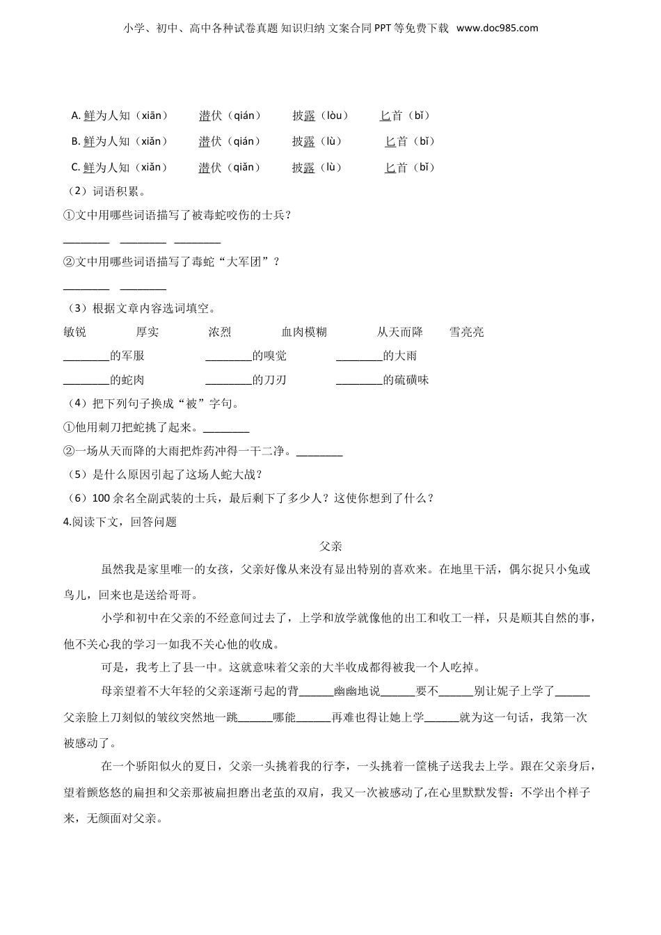 小学、初中、高中各种试卷真题知识归纳文案合同PPT等免费下载www.doc985.com小升初专题训练:现代文阅读(一)1.课外阅读。王献之从小就跟父亲学写字。一天,他问父亲,写字有什么秘诀?王羲之指着家里的十八口大缸说:“你看,秘诀就在这里。你把这十八口缸里的水全部写完,就知道了。”王献之听了父亲的话,终于明白了其中的道理。于是,他日夜勤奋地练习写字,最终也成了一位著名的书法家。(1)王羲之与王献之是________关系。(2)写字的秘诀是什么?(3)王献之是怎样成为书法家的?(4)用加下划线的词语写句子。王献之听了父亲的话,终于明白了其中的道理。2.阅读下文,回答问题。为爱掩藏女儿细心地为母亲梳理着头发,①________(竟然猛然果然)发现母亲的青丝中有一星闪亮的白。母亲老了?女儿的心中涌起一阵伤感。母亲从小就领着她去晨跑,她拼命地追,可怎么也追不上母亲轻快的步伐,她赌气停住了。这时,母亲回转身子,在前方伸开手臂笑着:“来,到妈妈这儿来。”于是,她咯咯地笑着,迈开小步子向妈妈温暖的怀抱跑去。她渐渐懂事.明白了“母亲”这一角色的艰难,然而在她的记忆中,母亲总是笑对一切,以充沛的精力和活力直面人生,难怪邻居阿姨总羡慕地说:“你妈妈呀,好像永远不会老。”女儿也坚信,母亲永远不会老,可眼前那星白分外刺眼。女儿拔下那根白发,悄悄地藏起来,对着镜子里的母亲笑着:“妈,您的头发多好啊,您永远那么年轻。”母亲笑了,女儿的小伎俩怎么能瞒得过妈妈的眼呢?多年来,从“哇哇”啼哭的娃娃到青春勃发的少女,女儿的一言一行、一举一动都印在母亲的眼里。这孩子,这么傻,白发能藏得住吗?你都这么大了,妈能不老吗?其实从你不再需要妈妈为你扎辫子时,从那天你跑步超过了妈妈,从你在作文中写下“青春无悔”的字样,妈妈就知道你长大了。你就是妈妈的延续,妈妈有了白发又有什么关系呢?可母亲没有说,她②________(安慰抚慰欣慰)地看着镜子里的女儿:“有女儿给妈梳头,真舒服!”镜子里两张美丽的笑脸,令人羡慕。原来人世间有许多深沉的爱,就藏在彼此的掩饰中。(1)在文中的横线处选填恰当的词语。小学、初中、高中各种试卷真题知识归纳文案合同PPT等免费下载www.doc985.com①________(竟然猛然果然)发现②________(安慰抚慰欣慰)地看着(2)女儿伤感的是________。邻居阿姨羡慕的是________,产生这种羡慕的原因是________。(3)女儿藏白发体现了女儿对母亲的爱,母亲对此不露声色体现了母亲对女儿的爱,文中揭示这一中心的句子是________。(4)读了此文,你有什么感受?试用几句话表达出来。3.现代文阅读人蛇大战最近,美国公布了一些鲜为人知的绝密资料。据其中一份资料披露,在越南战场上,美军曾遭遇蛇的报复,士兵伤亡惨重。1970年夏季的一天,美军第七军团某连上尉马丁带领100余名全副武装的士兵日夜兼程,于午夜时分进入了预定的潜伏地带。随即,马丁派出几十个身强力壮的士兵到河谷去背石头。士兵们走到河边,一个士兵拆开一块石头后,无意中看到石块下有两条杯口粗的大蛇扭缠在一起。他用刺刀把蛇挑了起来。受到惊吓的毒蛇一下子蹿了起来,还没等他作出反应,就张开长有毒牙的大嘴,狠狠地咬了他一口。这名士兵的脸上立刻血流如注,等同伴扑上来营救时已经来不及了。他们不敢开枪,纷纷拔出匕首,一刀一刀挥刺过去。一条蛇被杀死,另一条负伤,钻进石缝中逃生。几分钟之后,他们准备离开河滩的时候,突然四面八方响起了“咝咝”声,从黑漆漆的石缝里一下子钻出上百条黑绿相间的大蛇。士兵们急忙拔出腰间佩带的匕首向蛇群乱砍过去,毒蛇疯狂地咬噬士兵。数十名中毒的士兵倒在地上命丧黄泉,只有几个行动敏捷、受伤较轻的士兵侥幸逃回营地。可是复仇心切的蛇顺着伤兵逃走的路线追来,在美国兵的营地形成了一个包围圈。没多久,蛇群的先锋部队进入营地。负责警戒的哨兵因害怕附近有越军哨兵而不敢开枪,只能用刺刀来刺杀,雪亮亮的刀刃上不一会儿就沾满了血肉模糊的蛇肉。但是蛇群的“大军团”蜂拥而至,遍地密密麻麻。它们把营地围得水泄不通,把包围圈越缩越小,转瞬间便冲到了每个人的身边。它们昂起头,...