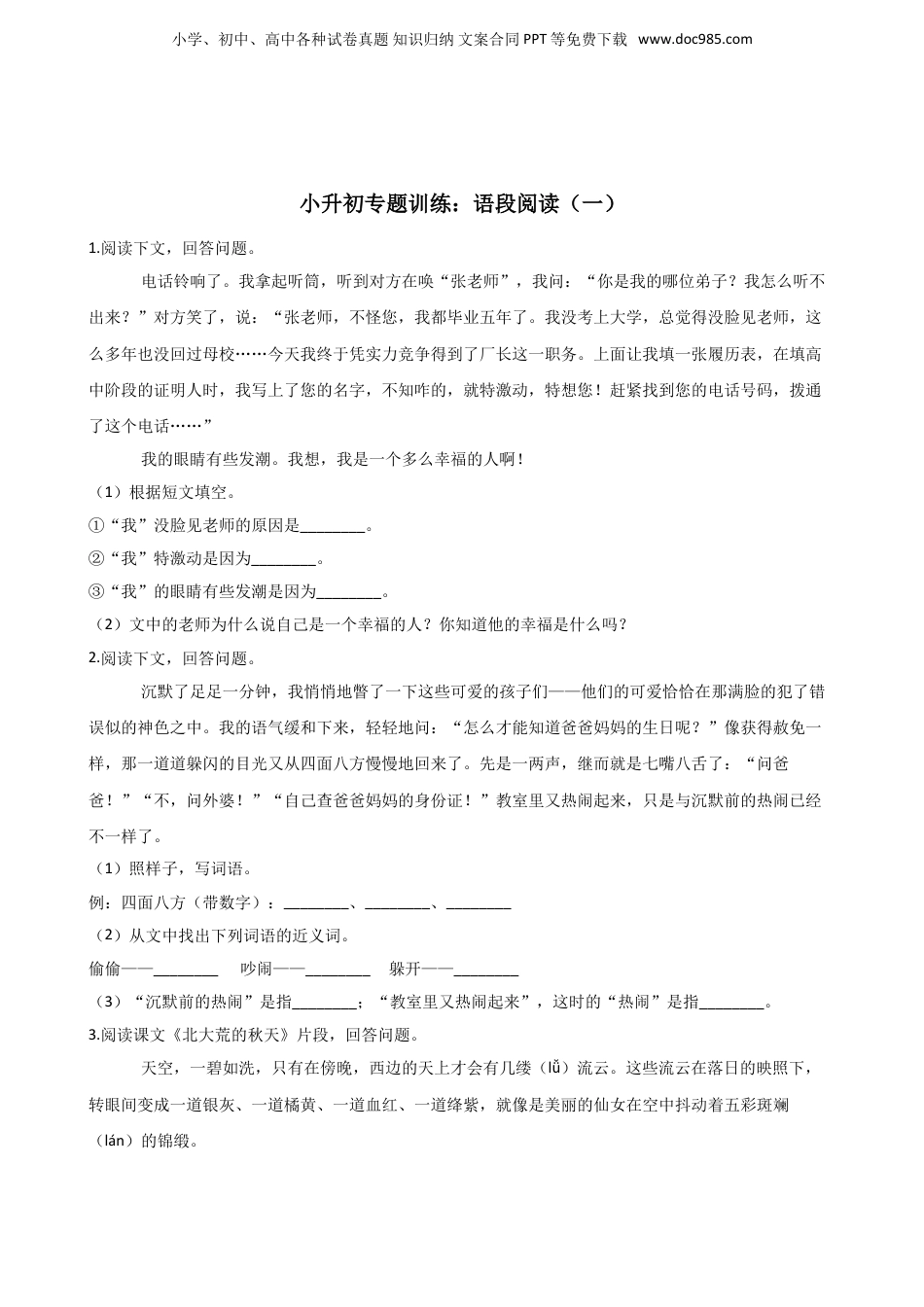 小学、初中、高中各种试卷真题知识归纳文案合同PPT等免费下载www.doc985.com小升初专题训练:语段阅读(一)1.阅读下文,回答问题。电话铃响了。我拿起听筒,听到对方在唤“张老师”,我问:“你是我的哪位弟子?我怎么听不出来?”对方笑了,说:“张老师,不怪您,我都毕业五年了。我没考上大学,总觉得没脸见老师,这么多年也没回过母校……今天我终于凭实力竞争得到了厂长这一职务。上面让我填一张履历表,在填高中阶段的证明人时,我写上了您的名字,不知咋的,就特激动,特想您!赶紧找到您的电话号码,拨通了这个电话……”我的眼睛有些发潮。我想,我是一个多么幸福的人啊!(1)根据短文填空。①“我”没脸见老师的原因是________。②“我”特激动是因为________。③“我”的眼睛有些发潮是因为________。(2)文中的老师为什么说自己是一个幸福的人?你知道他的幸福是什么吗?2.阅读下文,回答问题。沉默了足足一分钟,我悄悄地瞥了一下这些可爱的孩子们——他们的可爱恰恰在那满脸的犯了错误似的神色之中。我的语气缓和下来,轻轻地问:“怎么才能知道爸爸妈妈的生日呢?”像获得赦免一样,那一道道躲闪的目光又从四面八方慢慢地回来了。先是一两声,继而就是七嘴八舌了:“问爸爸!”“不,问外婆!”“自己查爸爸妈妈的身份证!”教室里又热闹起来,只是与沉默前的热闹已经不一样了。(1)照样子,写词语。例:四面八方(带数字):________、________、________(2)从文中找出下列词语的近义词。偷偷——________吵闹——________躲开——________(3)“沉默前的热闹”是指________;“教室里又热闹起来”,这时的“热闹”是指________。3.阅读课文《北大荒的秋天》片段,回答问题。天空,一碧如洗,只有在傍晚,西边的天上才会有几缕(lǚ)流云。这些流云在落日的映照下,转眼间变成一道银灰、一道橘黄、一道血红、一道绛紫,就像是美丽的仙女在空中抖动着五彩斑斓(lán)的锦缎。小学、初中、高中各种试卷真题知识归纳文案合同PPT等免费下载www.doc985.com小河清澈见底,如同一条透明的蓝绸子,静静地躺在大地的怀抱里。9月,从第一片树叶落地开始,北大荒的秋天也就来了。(1)找出文中,描写颜色的词语:________、________、________、________。(2)用“________”画出文中打比方的句子,它使用________比喻________。4.阅读下文,回答问题。鸭妈妈孵出一只又大又丑的小鸭,大家都要赶走他。丑小鸭想:“我还是到广大的世界里去,自己学会生活的本领吧!”丑小鸭来到小溪边,一会儿捉虫吃,一会儿跑进水里捉小鱼吃,吃饱了,他就练习游泳,练习拍翅膀。一年过去了,春天来了。丑小鸭拍拍翅膀,啊!自己会飞了。他飞到一个大湖里,低头看见清清的水里是一只天鹅。(1)照样子,写词语。例:又大又丑、________、________(2)用划线的词写一句话。一会儿……一会儿……(3)短文有________自然段。(4)丑小鸭自己学会了________。(5)后来,丑小鸭变成了________。从文中哪句话可以看出来?用“________”画出来。5.阅读片段,完成后面的练习。燕子(节选)在微风中,在阳光中,燕子斜着身子在天空中掠过,唧唧地叫着,有的由这边的稻田上,一转眼飞到了那边的柳树下边;有的横掠过湖面,尾尖偶尔沾了一下水面,就看到波纹一圈一圈地荡漾开去。几对燕子飞倦了,落在电线上。蓝蓝的天空,电杆之间连着几痕细线,多么像五线谱啊,停着的燕子成了音符,谱出一支正待演奏的春天的赞歌。(1)选段分别写了________的燕子和________的燕子。A.停歇B.飞行(2)通过读文,我知道燕子飞行时的特点是________。(3)“蓝蓝的天空,电杆之间连着几痕细线,多么像五线谱啊!停着的燕子成了音符,铺成了一支正待演奏的春天的赞歌。”为什么用“五线谱”打比方呢?(4)这篇文章表达了作者的________思想感情。6.阅读下文,回答问题。小学、初中、高中各种试卷真题知识归纳文案合同PPT等免费下载www.doc985.com哟,金鱼游到了他的纸上来啦!”一个女孩惊奇地叫起来。我挤过去一看,原来是那位青年在静静地画画。他有时工笔细描_____把金鱼的每个部位一丝不苟地画下来...