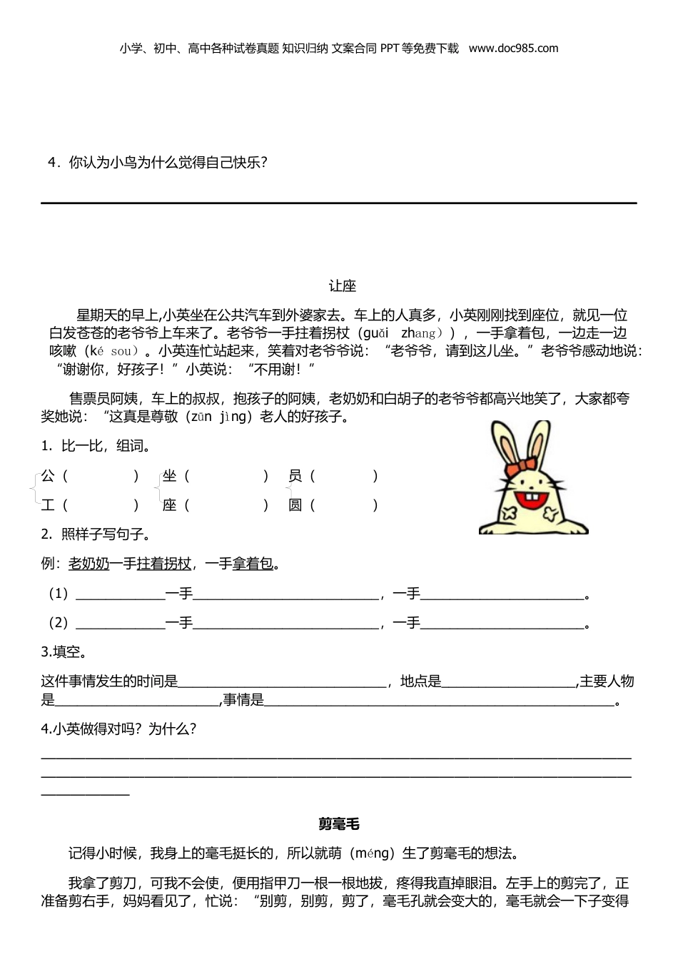 小学、初中、高中各种试卷真题知识归纳文案合同PPT等免费下载www.doc985.com学会把句子写完整我的大名:________________一、成语接龙百花争艳——艳阳高照——照猫画虎——狐假虎威——威风八面——面面俱到二、阅读训练春妈妈的三个小姑娘春妈妈回来了,带来了三个淘气的小姑娘。雷姑娘天天敲着鼓儿玩,敲醒了天空,敲醒了田野,敲醒了沉睡的山庄。雨姑娘天天洒着水儿玩,洗绿了大树,洗青了小草,洗红了花朵的脸儿一张张。风姑娘天天吹着气儿玩,吹柔了树枝,吹长了青草,吹得春天朝前长。啊,春天来了,春妈妈带来了三个能干的小姑娘。1.春妈妈带回的三个小姑娘是________、________、________。2.照样子,写一写。例:一张张________________________3.照样子,连一连。蔚蓝的大地无边的天空沉睡的田野清新的空气4.万物复苏、花红柳绿……你还知道哪些形容春天的词语?请写一写。小学、初中、高中各种试卷真题知识归纳文案合同PPT等免费下载www.doc985.com———————————————————————————————————————————快乐的小鸟爸爸是树干,妈妈是枝叶,我是树上的小鸟。树干支撑(chēng)着我,树叶为我挡风雨。烈日当空,我不怕,浓密的枝叶遮住骄阳;寒风袭来,我不怕,庞大的树干托起我温暖的巢(cháo)。我为枝叶欢唱,我为树干舞蹈,我是一只快乐的小鸟。1.在“()”里填上适当的词语。()的小鸟()的枝叶()的树干()的巢()的土地()的天空2.给下列多音字注音并组词。()__________()___________当乐()__________()——————3.照样子,写句子。我是一只快乐的小鸟。我是_______________________________。小学、初中、高中各种试卷真题知识归纳文案合同PPT等免费下载www.doc985.com4.你认为小鸟为什么觉得自己快乐?让座星期天的早上,小英坐在公共汽车到外婆家去。车上的人真多,小英刚刚找到座位,就见一位白发苍苍的老爷爷上车来了。老爷爷一手拄着拐杖(guǎizhang)),一手拿着包,一边走一边咳嗽(késou)。小英连忙站起来,笑着对老爷爷说:“老爷爷,请到这儿坐。”老爷爷感动地说:“谢谢你,好孩子!”小英说:“不用谢!”售票员阿姨,车上的叔叔,抱孩子的阿姨,老奶奶和白胡子的老爷爷都高兴地笑了,大家都夸奖她说:“这真是尊敬(zūnjìng)老人的好孩子。1.比一比,组词。公()坐()员()工()座()圆()2.照样子写句子。例:老奶奶一手拄着拐杖,一手拿着包。(1)____________一手_________________________,一手______________________。(2)____________一手_________________________,一手______________________。3.填空。这件事情发生的时间是____________________________,地点是__________________,主要人物是______________________,事情是_______________________________________________。4.小英做得对吗?为什么?——————————————————————————————————————————————————————————————————————————————————————剪毫毛记得小时候,我身上的毫毛挺长的,所以就萌(méng)生了剪毫毛的想法。我拿了剪刀,可我不会使,便用指甲刀一根一根地拔,疼得我直掉眼泪。左手上的剪完了,正准备剪右手,妈妈看见了,忙说:“别剪,别剪,剪了,毫毛孔就会变大的,毫毛就会一下子变得小学、初中、高中各种试卷真题知识归纳文案合同PPT等免费下载www.doc985.com又黑又长,跟黑猩猩似的。”我听了,吓得扔了剪刀。“唉!幸亏右手没剪。”我用右手摸着左手,害怕极了,生怕一下子毫毛全长出来。一分钟,两分钟,一个小时,两个小时,一天,两天……我手上的毫毛还没长出来。我高兴极了,我没有变成黑猩猩,但我以后再也不剪毫毛了,因为那是很疼的。1.找样子,写一写。想——(相)——(相信)萌——()——()猩——()——()疼——()——()2.照样子,用加点的字写句子。例:我以后再也不剪毫毛了,因为那是很疼的。___________________________,因为__________________________。3.“...