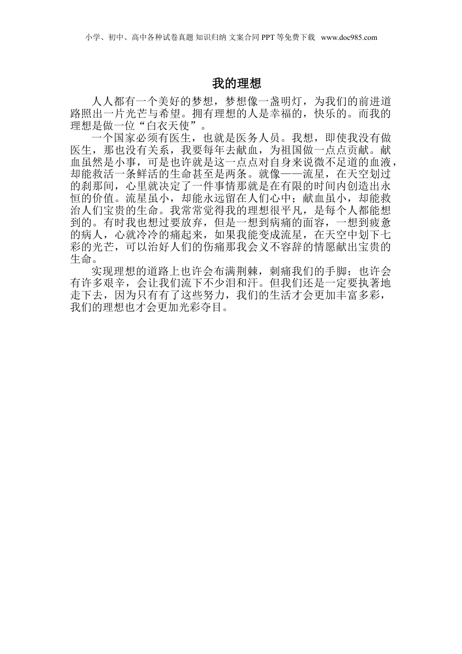 小学、初中、高中各种试卷真题知识归纳文案合同PPT等免费下载www.doc985.com我的理想人人都有一个美好的梦想,梦想像一盏明灯,为我们的前进道路照出一片光芒与希望。拥有理想的人是幸福的,快乐的。而我的理想是做一位“白衣天使”。一个国家必须有医生,也就是医务人员。我想,即使我没有做医生,那也没有关系,我要每年去献血,为祖国做一点点贡献。献血虽然是小事,可是也许就是这一点点对自身来说微不足道的血液,却能救活一条鲜活的生命甚至是两条。就像——流星,在天空划过的刹那间,心里就决定了一件事情那就是在有限的时间内创造出永恒的价值。流星虽小,却能永远留在人们心中;献血虽小,却能救治人们宝贵的生命。我常常觉得我的理想很平凡,是每个人都能想到的。有时我也想过要放弃,但是一想到病痛的面容,一想到疲惫的病人,心就冷冷的痛起来,如果我能变成流星,在天空中划下七彩的光芒,可以治好人们的伤痛那我会义不容辞的情愿献出宝贵的生命。实现理想的道路上也许会布满荆棘,刺痛我们的手脚;也许会有许多艰辛,会让我们流下不少泪和汗。但我们还是一定要执著地走下去,因为只有有了这些努力,我们的生活才会更加丰富多彩,我们的理想也才会更加光彩夺目。
