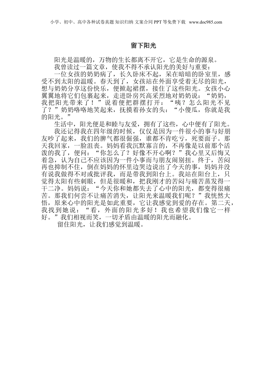 小学、初中、高中各种试卷真题知识归纳文案合同PPT等免费下载www.doc985.com留下阳光阳光是温暖的,万物的生长都离不开它,它是生命的源泉。我曾读过一篇文章,使我不得不承认阳光的美好与重要:一位女孩的奶奶病了,长久卧床不起,呆在暗暗的卧室里,感受不到太阳的温暖。春天到了,女孩站在外面享受着无尽的阳光,想与奶奶分享这份快乐,便掀起裙摆,接住了这些阳光。女孩小心翼翼地将它们包裹起来,走进卧房兴高采烈地对奶奶说:“奶奶,我把阳光带来了!”说着便把群摆打开:“咦?怎么阳光不见了?”奶奶咯咯地笑起来,抚摸着孙女的头:“小傻瓜,你就是我的阳光。”生活中,阳光便是和睦与友爱,拥有了这些,心中便有了阳光。我还记得我在四年级的时候,仅仅是因为一件很小的事与好朋友吵了起来,我们的脾气都很倔强,谁都不肯吃亏,死要面子。那天我回家,一脸沮丧。妈妈看我沉默寡言的,不再像是以前那个活泼的我了,便问:“你怎么了?好像不开心啊?”我心里又后悔又着急,认为自己不应该因为一件小事而与朋友闹别扭。终于,苦闷再也抑制不住,倒在妈妈的怀里边哭边说出了今天的事,妈妈并没有说我做得不对或批评我,而是带我到阳台上。我站在阳台上,只觉得太阳有些刺眼,但是很暖和,把我刚才的苦闷与痛苦蒸发得一干二净。妈妈说:“今天你和她都失去了心中的阳光,都变得很痛苦。那我们何尝不让痛苦消失,让阳光来温暖我们呢?”我恍然大悟,原来心中的阳光是如此重要,它让我感觉到爱的存在。第二天,我找到她说:“看,外面的阳光多好!我也希望我们像它一样好。”我们相视而笑,一切矛盾由温暖的阳光而融化。留住阳光,让我们感觉到温暖。