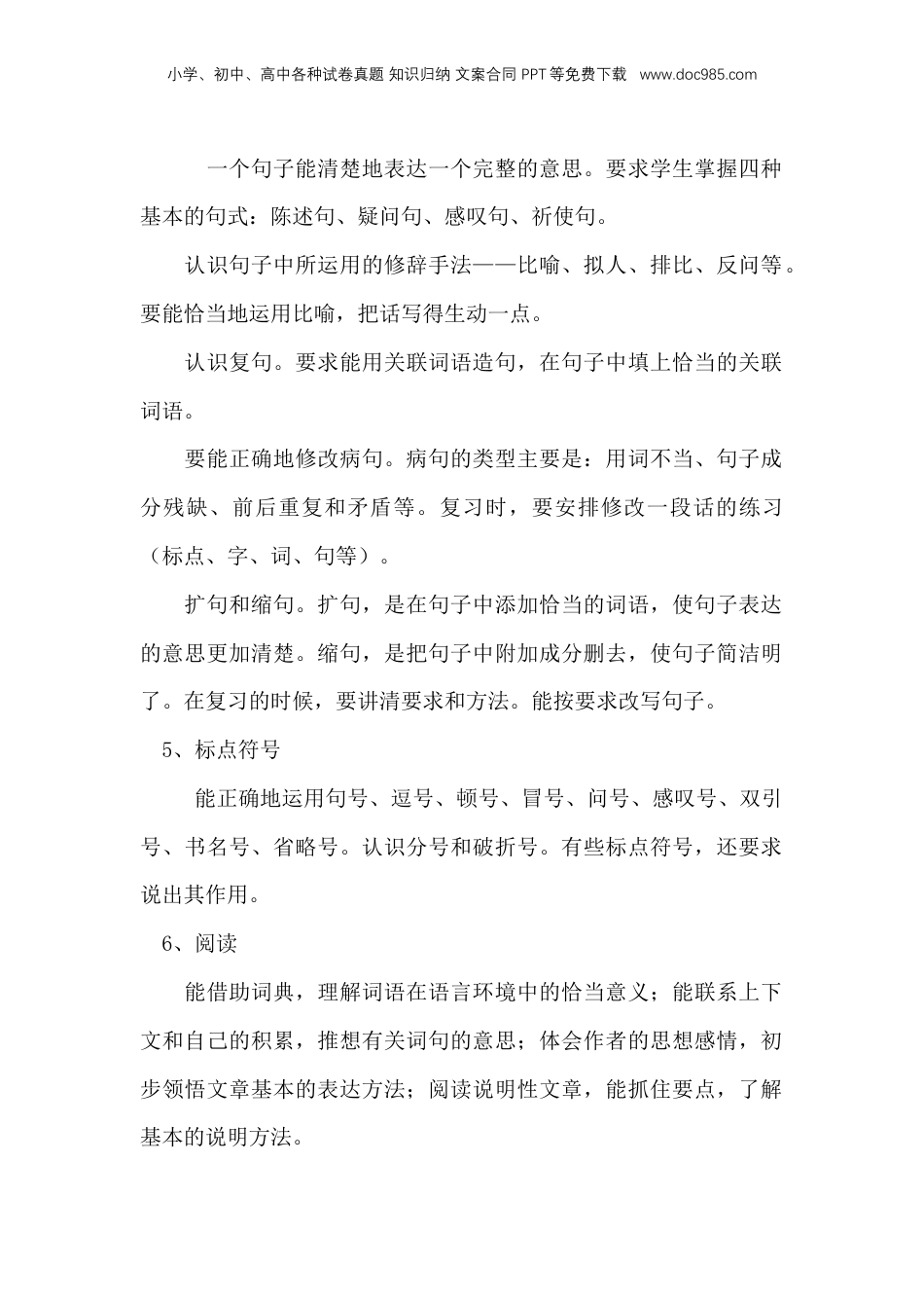 小学、初中、高中各种试卷真题知识归纳文案合同PPT等免费下载www.doc985.com复习计划(一)指导思想:以原教学大纲、教材和《新课程标准》为依据,充分利用现有的教材,根据学生目前存在的问题,作个系统性的复习,同时要面向全体学生,切实抓好基础知识和基本技能的复习,使好、中、差不同的学生都得到提高。(二)复习内容:1、汉语拼音要求学生能正确地认读声母、韵母和整体认读的音节;能正确地书写大小写字母;能正确地拼读音节。要着重复习读拼音,写词语和句子。读拼音,写词语、句子的关键,是拼读后,要先想出语义,然后正确地写出有关的汉字。2、汉字“认识所学的带读字,掌握生字,读准字音,认清字形,理解字义,并能正确地书写。3、词语要求学生能正确地理解所学词语的意思,而且大部分能在口头和书面中正确地运用。要能联系上下文理解词语的意思的。要注意积累词汇,部分能灵活运用。4、句子小学、初中、高中各种试卷真题知识归纳文案合同PPT等免费下载www.doc985.com一个句子能清楚地表达一个完整的意思。要求学生掌握四种基本的句式:陈述句、疑问句、感叹句、祈使句。认识句子中所运用的修辞手法——比喻、拟人、排比、反问等。要能恰当地运用比喻,把话写得生动一点。认识复句。要求能用关联词语造句,在句子中填上恰当的关联词语。要能正确地修改病句。病句的类型主要是:用词不当、句子成分残缺、前后重复和矛盾等。复习时,要安排修改一段话的练习(标点、字、词、句等)。扩句和缩句。扩句,是在句子中添加恰当的词语,使句子表达的意思更加清楚。缩句,是把句子中附加成分删去,使句子简洁明了。在复习的时候,要讲清要求和方法。能按要求改写句子。5、标点符号能正确地运用句号、逗号、顿号、冒号、问号、感叹号、双引号、书名号、省略号。认识分号和破折号。有些标点符号,还要求说出其作用。6、阅读能借助词典,理解词语在语言环境中的恰当意义;能联系上下文和自己的积累,推想有关词句的意思;体会作者的思想感情,初步领悟文章基本的表达方法;阅读说明性文章,能抓住要点,了解基本的说明方法。小学、初中、高中各种试卷真题知识归纳文案合同PPT等免费下载www.doc985.com关于阅读的要求,作一些说明:(1)句子意思的理解。(2)给自然段划分层次。(3)分段和概括段落大意。(4)文章的中心思想。复习时,既要提示学生弄清作者的本意,又要尊重学生自己的独特体验。(5)体会思想感情。背诵。主要是第十一册课本中要求背诵的课文,一般是要求背诵课文中重要的部分。默写,只指课本中规定的内容。7、写作1)、按照课本编排的顺序,逐组课文地进行复习。采用这样的方法进行复习,最重要的是要善于引导学生进行比较,明确每单元课文的类型,而且要找出每篇课文在表达上的特点。2)、读写结合复习。就是把有关的课文或课外的文章进行归类,让学生进行比较性的阅读,找出这类文章在写法上的特点。并引导学生把阅读中学到的有关写作的知识迁移到写作上来。读了有关的文章,就让学生写相应的作文。A、分类性复习从大的方面分,可以分为:基础知识、阅读、写作等三部分。基础知识部分,就按上面提到五个方面。阅读部分的分类方法很多,可以从文章的内容来分,也可以从文章的表达方式上分。作文的分类也很多,可以从写人、记事、写景和应用文来分,也可以从命题的形式来分。小学、初中、高中各种试卷真题知识归纳文案合同PPT等免费下载www.doc985.com在进行总复习的过程中,还要注意以下两点:1、突出重点。从学生的角度看,我们要特别注意差生,多帮助他们一点,从而提高及格率。从整个学习内容来看,阅读和作文是重点。在阅读的复习中,词、句、段的理解是重点。在作文复习中,怎样把话写通顺是重点。从学生学习的方式来看,探究性的学习是重点。提出自己需要了解的问题,是探究学习的关键。2、讲练结合。在整个复习阶段,要以学生自己的复习为主,要以练习为主,但是老师必须作适当的提示、归纳。在一堂课上学生应该有口头的练习,又有笔头的练习。