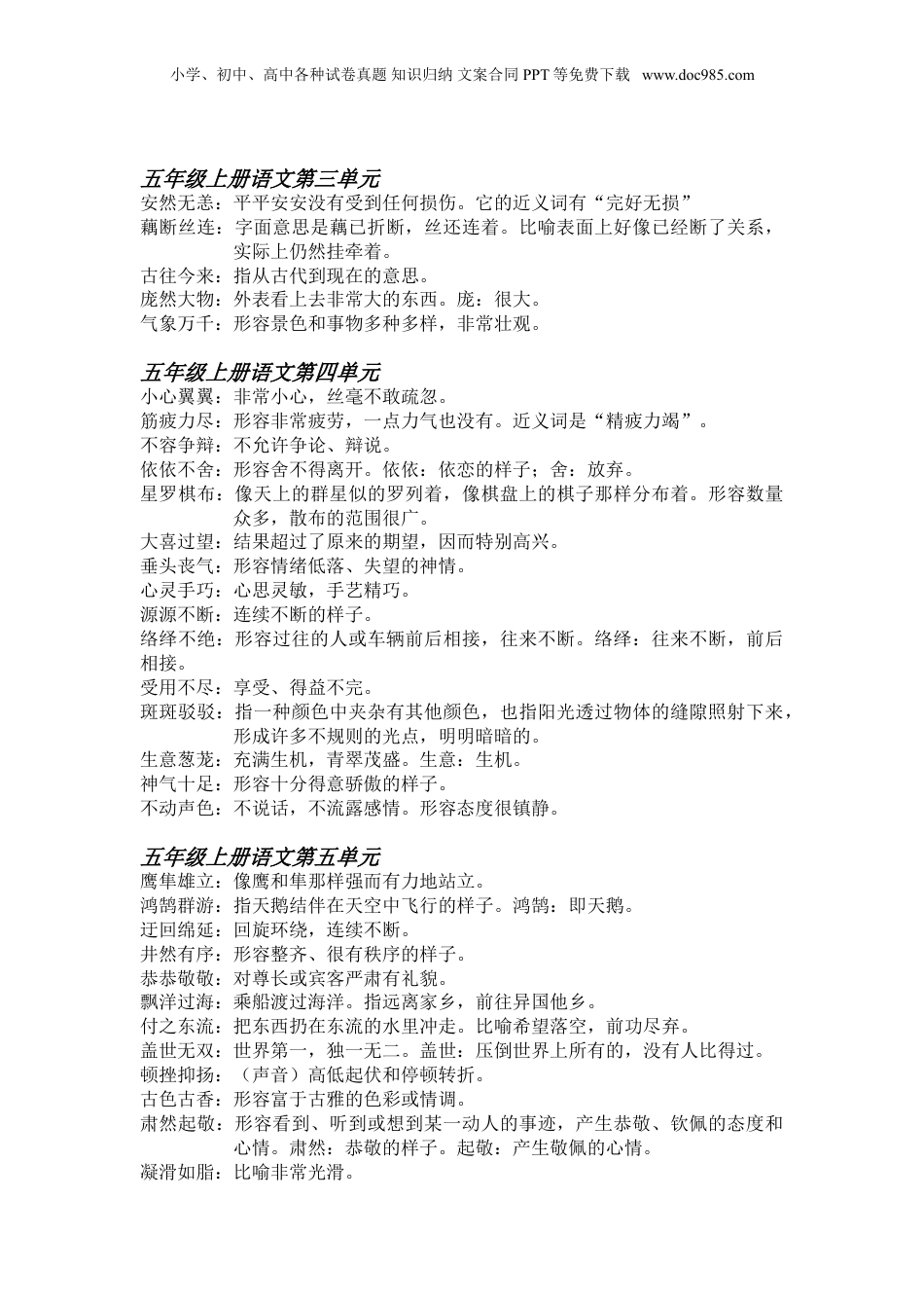 小学、初中、高中各种试卷真题知识归纳文案合同PPT等免费下载www.doc985.com五年级上册语文第一单元倾盆大雨:形容雨极大,就像一大盆一大盆倒下来似的。毫不犹豫:丝毫不迟疑,指(态度)非常坚决。饥肠辘辘:肚子饿得咕咕响,形容十分饥饿。辘辘,象声词,这里指肠呜声。依依不舍:形容很留恋,十分舍不得。绿林好汉:农民起义军英雄好汉的统称。滚瓜烂熟:形容朗读、背诵得非常熟练流利。流光溢彩:流动的光影,丰富的色彩。形容色彩丰富明丽。津津有味:吃得很有味道或谈得很有兴趣。天长日久:时间长,日子久。形容长久。如醉如痴:形容神态失常,失去自控。浮想联翩:头脑里涌现的感想连续不断。浮想:飘浮不定的想象。联翩:鸟飞的样子,比喻连续不断,指许许多多的想象不断地涌现出来。囫囵吞枣:比喻读书不做细致分析,不管懂不懂,全盘接受。囫囵:整个儿。不求甚解:只求懂个大概,不求深刻理解。甚:很,非常。悲欢离合:指生活中经历的各种境遇和由此产生的各种心情。悲欢:悲伤和欢乐。离合:离散和聚会。牵肠挂肚:形容十分惦念,放心不下。如饥似渴:形容要求很迫切,好像饿了急着要吃饭,渴了盼着要喝水一样。不言而喻:不用说就能明白,形容道理(情况)明摆着。喻:了解,明白。黯然神伤:心里不舒服,情绪低落,非常伤心。千篇一律:指文章都一个样,形容呆板雷同,没有新意。别出心裁:独创一格,与众不同。与众不同:跟大家不一样。大显身手:充分显示出本领和才干。显:表露,表现。身手:指本领。心安理得:觉得事情合情合理,心里很坦然。得:适合。念念不忘:形容牢记于心,时刻不忘。念念:时刻思念着。呕心沥血:比喻费尽心血。沥:滴。五年级上册语文第二单元能书善画:懂书法,会作画,有书写和绘画的才干。风欺雪压:遭受寒风冰雪的袭击,指天气恶劣。顶天立地:形容大无畏的英雄气概。低头折节:低下头,弯下腰。比喻屈服。折:弯,弯曲。节:物体各段之间相连的地方。泪眼蒙胧:两眼含着泪花,看东西不清楚的样子。颇负盛名:指名气很大。颇:很。不甚在意:不太在意,不怎么在乎。香飘十里:香味飘到十里之外,形容香气浓郁,在很远的地方都能闻到。日出而作:太阳出来了,就开始干活。日入而息:太阳下山了,就回家休息,也称日落而息。守望相助:为防备外来的侵害,相邻各村落协同守卫瞭望,遇到情况相互通报支援。小学、初中、高中各种试卷真题知识归纳文案合同PPT等免费下载www.doc985.com五年级上册语文第三单元安然无恙:平平安安没有受到任何损伤。它的近义词有“完好无损”藕断丝连:字面意思是藕已折断,丝还连着。比喻表面上好像已经断了关系,实际上仍然挂牵着。古往今来:指从古代到现在的意思。庞然大物:外表看上去非常大的东西。庞:很大。气象万千:形容景色和事物多种多样,非常壮观。五年级上册语文第四单元小心翼翼:非常小心,丝毫不敢疏忽。筋疲力尽:形容非常疲劳,一点力气也没有。近义词是“精疲力竭”。不容争辩:不允许争论、辩说。依依不舍:形容舍不得离开。依依:依恋的样子;舍:放弃。星罗棋布:像天上的群星似的罗列着,像棋盘上的棋子那样分布着。形容数量众多,散布的范围很广。大喜过望:结果超过了原来的期望,因而特别高兴。垂头丧气:形容情绪低落、失望的神情。心灵手巧:心思灵敏,手艺精巧。源源不断:连续不断的样子。络绎不绝:形容过往的人或车辆前后相接,往来不断。络绎:往来不断,前后相接。受用不尽:享受、得益不完。斑斑驳驳:指一种颜色中夹杂有其他颜色,也指阳光透过物体的缝隙照射下来,形成许多不规则的光点,明明暗暗的。生意葱茏:充满生机,青翠茂盛。生意:生机。神气十足:形容十分得意骄傲的样子。不动声色:不说话,不流露感情。形容态度很镇静。五年级上册语文第五单元鹰隼雄立:像鹰和隼那样强而有力地站立。鸿鹄群游:指天鹅结伴在天空中飞行的样子。鸿鹄:即天鹅。迂回绵延:回旋环绕,连续不断。井然有序:形容整齐、很有秩序的样子。恭恭敬敬:对尊长或宾客严肃有礼貌。飘洋过海:乘船渡过海洋。指远离家乡,前往异国他乡。付之东流:把东西扔在东流的水里冲走。比喻希望...