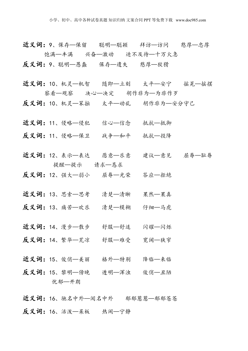 小学、初中、高中各种试卷真题知识归纳文案合同PPT等免费下载www.doc985.com近义词:1、环绕—围绕飘荡—浮荡尽情—纵情伙伴—同伴悄悄地—偷偷地反义词:1、凉爽—炎热愉快—痛苦幸福—苦难近义词:2、解释—解说理解—明白旅游—旅行反义词:2、强烈—微弱意味深长—索然无味近义词:3、寒—冷啼—叫反义词:3、远—近落—升近义词:4、奉献—贡献飘零—飘落茁壮—健壮嫩绿—碧绿肥美—丰美输送—运送反义词:4、奉献—索取形态各异—一模一样近义词:5、清澈—明澈如同—好像顿时—立刻反义词:5、清澈—浑浊热闹—冷清赞美—责备近义词:6、硕大—巨大格外—特别泛舟—荡舟优美—优雅轻柔—柔和仿佛—好像反义词:6、硕大—微小平静—动荡典雅—庸俗近义词:7、对照—对比神往—向往雄伟—宏伟反义词:7、纯净—污秽吸引—排斥近义词:8、嘱咐—叮嘱黑黝黝—黑油油竞相开放—争相开放反义词:8、洁白—乌黑欢乐—痛苦美丽—丑陋迷惑—明白小学、初中、高中各种试卷真题知识归纳文案合同PPT等免费下载www.doc985.com近义词:9、保存—保留聪明—聪颖拜访—访问憨厚—忠厚饱满—丰满兴奋—激动迫不及待—十万火急反义词:9、聪明—愚蠢保存—遗失憨厚—狡猾近义词:10、机灵—机智随即—立刻太平—安宁摇晃—摇摆察看—观察决心—决定胡作非为—为非作歹反义词:10、机灵—笨拙太平—动乱胡作非为—安分守己近义词:11、侵略—侵犯信心—信念抵抗—抵御反义词:11、侵略—保卫战争—和平抵抗—投降近义词:12、表示—表达愿意—乐意建议—意见屈辱—耻辱提醒—提示请求—恳求反义词:12、强大—弱小屈辱—光荣答应—拒绝近义词:13、思索—思考清楚—清晰果然—果真反义词:13、痛苦—欢乐清楚—模糊仔细—马虎近义词:14、漫步—散步舒服—舒适闪耀—闪烁反义词:14、繁华—荒凉舒服—难受宽阔—狭窄近义词:15、俊俏—美丽格外—特别降临—来临反义词:15、黎明—傍晚透明—浑浊俊俏—丑陋忧郁—开朗近义词:16、驰名中外—闻名中外郁郁葱葱—郁郁苍苍反义词:16、活泼—呆板热闹—宁静小学、初中、高中各种试卷真题知识归纳文案合同PPT等免费下载www.doc985.com近义词:17、勘探—勘测聚精会神—全神贯注奇怪—稀奇刨根问底—追根问底反义词:17、高兴—难过聚精会神—心不在焉近义词:18、警觉—警惕洪亮—响亮欺负—欺侮反义词:18、洪亮—低沉激烈—温和有气无力—生气勃勃近义词:19、得意—自豪本领—本事巨大—庞大呼啸—长啸反义词:19、巨大—微小俯冲—爬升释放—回收长处—短处近义词:20、恳切—诚恳担心—害怕损伤—损害反义词:20、镇定—慌张崭新—陈旧坚决—犹豫近义词:21、了解—熟悉犹豫—迟疑情绪—心绪忧郁—忧愁慢吞吞—慢悠悠反义词:21、残疾—健康犹豫—果断镇定—慌张持久—短暂开始—结束近义词:22、装扮—打扮梦想—理想骄傲—自豪反义词:22、无意—有意坑坑洼洼—平平整整近义词:23、思念—想念兴高采烈—兴致勃勃反义词:23、热闹—冷清兴高采烈—垂头丧气近义词:24、刺痛—刺伤痛苦—难受空闲—闲暇陋习—陋俗空闲—空暇废除—取消小学、初中、高中各种试卷真题知识归纳文案合同PPT等免费下载www.doc985.com反义词:24、穷—富经常—偶尔词语积累:喜不自胜喜从天降喜笑颜开喜气洋洋喜出望外喜上加喜喜形于色欢天喜地海不扬波海沸江翻海阔天空海啸山崩海底捞月海枯石烂海角天涯海誓山盟海北天南海内无双山明水秀山鸣谷应山重水复山颓木坏江天一色江山如画江湖日下江云渭树叶落归根叶落知秋一叶知秋绿叶成阴根深叶茂秋风过耳秋草人情秋风落叶秋风团扇秋高气爽秋高马肥秋月春风秋收冬藏水天一色一碧万顷风平浪静湖光山色碧空万里天高云淡碧空如洗碧天如水天高日远天朗气清天上人间天高地厚花枝招展花天锦地花团锦簇花朝月夕花样百出花香鸟语花好月圆花红柳绿勤俭持家勤能补拙勤勤恳恳鼠目寸光聪明才智聪明伶俐车水马龙叶公好龙龙潭虎穴蛟龙得水藏龙卧虎龙争虎斗龙蛇飞动龙吟虎啸百折不回勇往直前坚持不懈披荆斩棘百折不挠一往无前坚贞不屈艰苦奋斗草木皆兵望梅止渴鞭长莫及唇亡齿寒四面楚歌乐不思蜀一鼓作气管中窥豹提心吊胆肝肠寸断沁人肺腑...