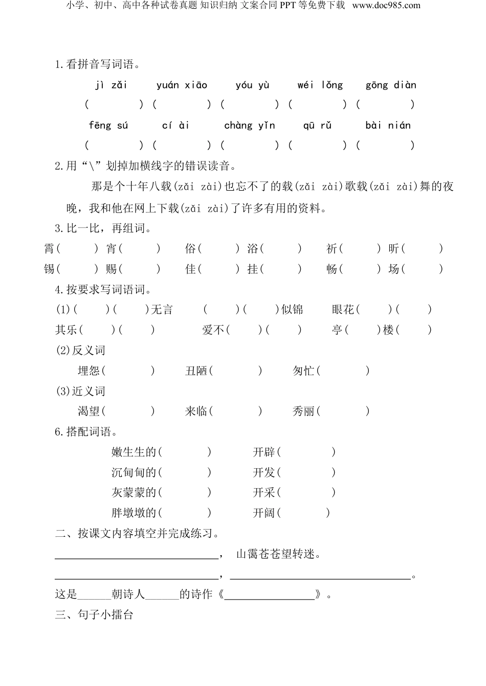 小学、初中、高中各种试卷真题知识归纳文案合同PPT等免费下载www.doc985.com五年级基础知识练习(一)一、按要求完成下面各题:1.看拼音写词语zītàiménglóngshūshìchángdīxiánliáo()()()()()chǔcúnjiāoguànfànwéifánhuāsìjǐn()()()()2.用“\”划掉加点字的错误读音。长堤(tídī)镂空(lóulòu)薄纸(bóbáo)炙热(zhìchì)贝壳(kéqiào)枝丫(yāyà)3.比一比,再组词。堤()辉()资()灌()杭()阴()提()挥()姿()罐()抗()荫()4.多音字组词。壳qiào()薄báo()似sì()ké()bó()shì()5.在括号里填上合适的词语,使前后搭配得当。诚恳的()剧烈地()观赏()()的声音()地离开欣赏()6.选词填空。屹立座立矗立挺立(1)北京长安街两旁()着很多高层建筑。(2)改革开放后的中国像巨人一样,巍然()在世界的东方。(3)砖瓦房后面是一片树林,()着一棵棵的钻天杨。(4)公园正中圆形花坛的中心()着一尊林则徐塑像。二、按课文内容填空。想当一棵树,先要学会它的,少说,少,少。,才像小学、初中、高中各种试卷真题知识归纳文案合同PPT等免费下载www.doc985.com树。三、句子小擂台1.将下列句子补充完整。(1)夏天的太阳,像个挂在空中。(2像柳絮一样在空中飞舞。(3)节日的广场花很多,简直成了。(4)大雨像一样从空中倾泻下来。(5)挂在树上的柿子,像一个个。2.修改病句。(1)只要我们都讲卫生,健康和疾病就有了保证。(2)我想起了过去的往事。(3)我们要运用和理解学过的词语。(4)大雨哗哗地下着,淋得像落汤鸡一样。3.给下面的句子填上正确的关联词。(1)()你同意,我们()按计划行事。(2)他()普通的浏览,()边看边思索。(3)()小兰坚持锻炼,()她的身体非常健康。五年级基础知识练习(二)一、按要求完成下面各题小学、初中、高中各种试卷真题知识归纳文案合同PPT等免费下载www.doc985.com1.看拼音写词语。jìzǎiyuánxiāoyóuyùwéilǒnggōngdiàn()()()()()fēngsúcíàichàngyǐnqūrǔbàinián()()()()()2.用“\”划掉加横线字的错误读音。那是个十年八载(zǎizài)也忘不了的载(zǎizài)歌载(zǎizài)舞的夜晚,我和他在网上下载(zǎizài)了许多有用的资料。3.比一比,再组词。霄()宵()俗()浴()祈()昕()锡()赐()佳()挂()畅()场()4.按要求写词语词。(1)()()无言()()似锦眼花()()其乐()()爱不()()亭()楼()(2)反义词埋怨()丑陋()匆忙()(3)近义词渴望()来临()秀丽()6.搭配词语。嫩生生的()开辟()沉甸甸的()开发()灰蒙蒙的()开采()胖墩墩的()开阔()二、按课文内容填空并完成练习。,山霭苍苍望转迷。,。这是______朝诗人______的诗作《》。三、句子小擂台小学、初中、高中各种试卷真题知识归纳文案合同PPT等免费下载www.doc985.com1.要求改写句子,一定要看清要求哟。(1)鸟在枝头唧唧直叫。(改成拟人句)(2)时间快速地流逝着。(改成比喻句)________________________________________________(3)让这样的人吃了长生不老药,不是要害更多的人吗?(改成陈述句)_________________________________________________(4)爸爸妈妈经常严厉地斥责法布尔。爸爸妈妈没能阻止法布尔对昆虫的喜爱。(用上关联词)(5)厚厚的松脂在阳光下发出金色的光彩。(缩句)(6)这个故事使我感动得流泪。(改成反问句)2.如果你班上有同学不喜欢读书,你会用哪句名言来劝说他?五年级基础知识练习(三)一、按要求完成下面各题1.看拼音写词语。lǎoshǔlǒngzhàopīpíngwéihùmǒshā()()()()()小学、初中、高中各种试卷真题知识归纳文案合同PPT等免费下载www.doc985.comfèngxiànlímíngcáifùjīběntáoqì()()()()()2.画去括号中不正确的读音。祖国母亲以她博大的胸怀哺育(pǔbǔ)着各族儿女。混(hǔnhùn)合而成的空气又有足够的强度,使我们到处感觉到它的存在。3.用横线画出句中的错别字,并在括号中改正。(1)在芒芒宇宙中,地球显得多么藐小!()(2)休息了一署假,同学们又从新回到了美丽的校圆。()4.比一比,再组词。(6分)陨()损()绒()荣()譬()誓()溶()融()藻()澡()慨()概()5.查字典。“张”字在字典中有以下几种解释:①使合拢的东西分开②陈设;布置③扩大;夸张④看;望⑤商店开业⑥量词⑦姓下面的...