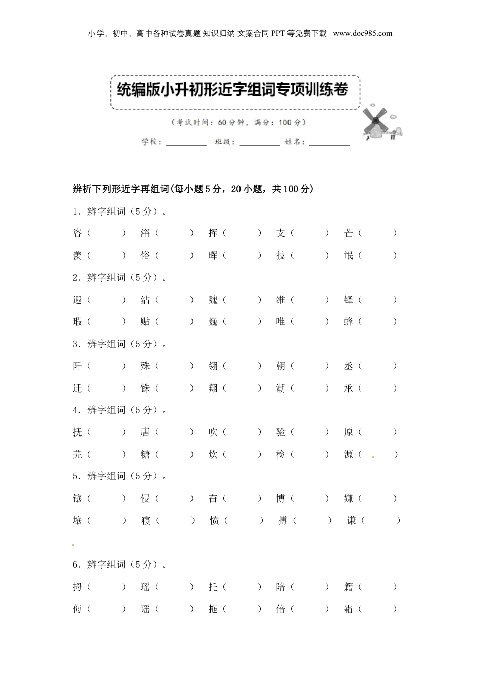 小学、初中、高中各种试卷真题知识归纳文案合同PPT等免费下载www.doc985.com辨析下列形近字再组词(每小题5分,20小题,共100分)1.辨字组词(5分)。咨()浴()挥()支()芒()羡()俗()晖()技()氓()2.辨字组词(5分)。遐()沾()魏()维()锋()瑕()贴()巍()唯()蜂()3.辨字组词(5分)。阡()殊()翎()朝()丞()迁()铢()翔()潮()承()4.辨字组词(5分)。抚()唐()吹()验()原()芜()糖()炊()检()源()5.辨字组词(5分)。镶()侵()奋()博()嫌()壤()寝()愤()搏()谦()6.辨字组词(5分)。[来源:学+科+网]拇()瑶()托()陪()籍()侮()谣()拖()倍()霜()小学、初中、高中各种试卷真题知识归纳文案合同PPT等免费下载www.doc985.com7.辨字组词(5分)。富()刻()狠()刀()踩()辐()克()狼()刁()睬()8.辨字组词(5分)。[来源:学+科+网Z+X+X+K]贷()机()忱()冠()崽()代()讥()枕()寇()筛()[来源:学科网]9.辨字组词(5分)。尝()楼()操()挪()碟()偿()搂()燥()娜()蝶()10.辨字组词(5分)。跻()讨()掀()旋()翔()脐()对()折()族()样()11.辨字组词(5分)。誉()覆()势()票()雅()眷()履()执()飘()稚()12.辨字组词(5分)。资()裕()浑()枝()忙()姿()欲()辉()企()茫()13.辨字组词(5分)。叛()伴()渠()斟()溶()判()胖()喋()堪()榕()14.辨字组词(5分)。熬()挨()航()持()蛮()傲()埃()杭()待()峦()15.辨字组词(5分)。小学、初中、高中各种试卷真题知识归纳文案合同PPT等免费下载www.doc985.com渴()溅()婉()瞭()煎()竭()贱()晚()缭()剪()16.辨字组词(5分)。[来源:Zxxk.Com]乏()扭()睡()咏()绵()贬()丑()陲()永()帛()17.辨字组词(5分)。监()期()蜷()磅()警()临()其()倦()膀()擎()18.辨字组词(5分)。蓝()撕()疆()榜()俘()篮()嘶()僵()傍()浮()19.辨字组词(5分)。择()拦()踉()盆()貌()译()兰()粮()岔()藐()20.辨字组词(5分)。抬()橙()摩()康()粮()胎()澄()磨()糠()酿()【参考答案】辨析下列形近字再组词(每小题5分,20小题,共100分)1.咨(咨询)浴(沐浴)挥(挥手)支(支援)芒(光芒)羡(羡慕)俗(风俗)晖(春晖)技(科技)氓(流氓)2.遐(遐想)沾(沾染)魏(魏国)维(维护)锋(锋利)瑕(无瑕)贴(粘贴)巍(巍峨)唯(唯一)蜂(蜜蜂)小学、初中、高中各种试卷真题知识归纳文案合同PPT等免费下载www.doc985.com3.阡(阡陌)殊(特殊)翎(翎毛)朝(朝代)丞(丞相)迁(迁居)铢(锱铢必较)翔(飞翔)潮(涨潮)承(承接)4.抚(抚爱)唐(唐代)吹(自吹自擂验(实验)原(原来)芜(荒芜)糖(糖果)炊(炊烟)检(检阅)源(源泉)[来源:学|科|网Z|X|X|K]5.镶(镶嵌)侵(侵略)奋(奋斗)博(渊博)嫌(嫌弃)壤(土壤)寝(就寝)愤(愤怒)搏(搏斗)谦(谦虚)6.拇(大拇指)瑶(琼瑶)托(托付)陪(陪客)籍(书籍)侮(侮辱)谣(谣言)拖(拖泥带水)倍(倍加)霜(雪上加霜)7.富(富裕)刻(雕刻)狠(凶狠)刀(剪刀)踩(踩踏)辐(辐射)克(克服)狼(狼狗)刁(刁难)睬(理睬)8.贷(贷款)机(机会)忱(热忱)冠(冠冕堂皇崽(猪崽)代(代表)讥(讥笑)枕(枕头)寇(日寇)筛(筛选)9.尝(品尝)楼(楼房)操(早操)挪(挪移)碟(彩蝶)偿(赔偿)搂(搂抱)燥(干燥)娜(婀娜多姿)蝶(蝴蝶)10.跻(跻身)讨(讨厌)掀(掀翻)旋(漩涡)翔(飞翔)脐(脐带)对(对立)折(折腾)族(民族)样(榜样)11.誉(荣誉)覆(覆盖)势(势力)票(邮票)雅(雅兴)眷(家眷)履(履行)执(执行)飘(飘扬)稚(幼稚)12.资(资源)裕(富裕)浑(浑浊)枝(树枝)忙(忙碌)姿(姿态)欲(欲望)辉(光辉)...