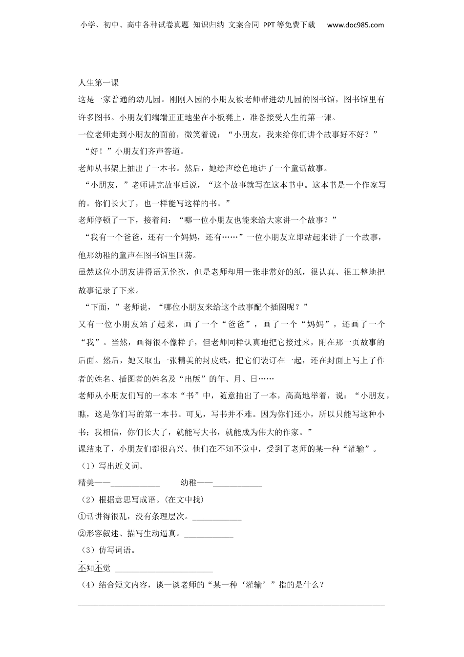 小学、初中、高中各种试卷真题知识归纳文案合同PPT等免费下载www.doc985.com小升初语文专项训练记事类文章的阅读基础题一、现代文阅读1.课外类文阅读。两个电话看完电视以后,老王一整晚都没睡好。第二天一上班就匆匆给武汉的儿子打电话,直到9点,那端才响起了儿子的声音:“爸,什么事?”他连忙问:“昨晚的天气预报看了没有?寒流快到武汉了,厚衣服准备好了吗?要不然,叫你妈给你寄……”①儿子漫不经心地说:“不要紧的,还很暖和呢,到真冷了再说。”他喋喋不休。儿子不耐烦了:“知道了,知道了。”撂了电话。他刚准备再拨过去,铃声突然响了,是他住在哈尔滨的老母亲,声音颤巍巍的:“天气预报说,北京今天要变天,你加衣服了没有?”疾风阵阵,从他忘了关好的窗缝里乘虚而入,他还来不及答话,已经结结实实打了个喷嚏(tì)。老母亲急了:“已经感冒了是不是?怎么这么不听话?从小就不爱加衣服……”②絮絮叨叨,从他七岁时的“劣迹”一直说起,他赶紧截住:“妈,你那边天气怎么样?”老人答:“雪还在下呢。”他不由自主地愣住了。在寒潮乍起的清晨,他深深牵挂的,是北风尚未抵达的武汉,却忘了北风已起的故乡和年过七旬的母亲。人间最温暖的亲情,为什么竟是这样的?老王自己有点发懵(měnɡ)。(1)为什么看完电视以后,老王一整晚都没睡好?___________________________________________________________________________(2)判断文中省略号的作用。A.话语被打断B.语言的省略C.说话断断续续D.列举的省略①表示()②表示()(3)读画“”的句子,他愣住的原因是:____________________________(4)这个故事让你想到了一句什么谚语或诗句?___________________________________________________________________________2.课外阅读。小学、初中、高中各种试卷真题知识归纳文案合同PPT等免费下载www.doc985.com人生第一课这是一家普通的幼儿园。刚刚入园的小朋友被老师带进幼儿园的图书馆,图书馆里有许多图书。小朋友们端端正正地坐在小板凳上,准备接受人生的第一课。一位老师走到小朋友的面前,微笑着说:“小朋友,我来给你们讲个故事好不好?”“好!”小朋友们齐声答道。老师从书架上抽出了一本书。然后,她绘声绘色地讲了一个童话故事。“小朋友,”老师讲完故事后说,“这个故事就写在这本书中。这本书是一个作家写的。你们长大了,也一样能写这样的书。”老师停顿了一下,接着问:“哪一位小朋友也能来给大家讲一个故事?”“我有一个爸爸,还有一个妈妈,还有……”一位小朋友立即站起来讲了一个故事,他那幼稚的童声在图书馆里回荡。虽然这位小朋友讲得语无伦次,但是老师却用一张非常好的纸,很认真、很工整地把故事记录了下来。“下面,”老师说,“哪位小朋友来给这个故事配个插图呢?”又有一位小朋友站了起来,画了一个“爸爸”,画了一个“妈妈”,还画了一个“我”。当然,画得很不像样子,但老师同样认真地把它接过来,附在那一页故事的后面。然后,她又取出一张精美的封皮纸,把它们装订在一起,还在封面上写上了作者的姓名、插图者的姓名及“出版”的年、月、日……老师从小朋友们写的一本本“书”中,随意抽出了一本,高高地举着,说:“小朋友,瞧,这是你们写的第一本书。可见,写书并不难。因为你们还小,所以只能写这种小书;我相信,你们长大了,就能写大书,就能成为伟大的作家。”课结束了,小朋友们都很高兴。他们在不知不觉中,受到了老师的某一种“灌输”。(1)写出近义词。精美——____________幼稚——____________(2)根据意思写成语。(在文中找)①话讲得很乱,没有条理层次。____________②形容叙述、描写生动逼真。____________(3)仿写词语。不知不觉________________________(4)结合短文内容,谈一谈老师的“某一种‘灌输’”指的是什么?___________________________________________________________________________小学、初中、高中各种试卷真题知识归纳文案合同PPT等免费下载www.doc985.com3.课外阅读。夜读书籍是通往心灵的小路。读书,使我远离浮躁(zàozóo);读书,使我宁静淡泊(báibó)。读书让我...