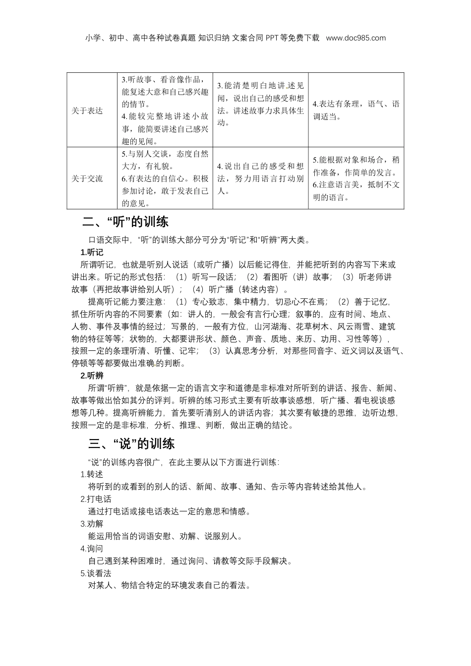 小学、初中、高中各种试卷真题知识归纳文案合同PPT等免费下载www.doc985.com第二部分口语交际与综合性学习专题五口语交际考点解读:口语交际的考点内容包括把握对方说话的要点,做出准确地判断或得体的回答;说话时语言表达要简明、得体、连贯;能根据交流的对象和场合,做简单的发言等。考查重点:重点考查的是在各种交际活动中,倾听、表达的能力。如与人交流能尊重、理解对方;参加讨论时,敢于发表自己的意见;听他人说话能抓住要点,并能简要转述;在交际中注意语言美,抵制不文明的语言等。常靠题型:常考题型有两大类:一类为选择题,另一类为书写题。“听话”“说话”题的题面设计为一种或几种对话情景,要求学生依据情景答题,可分为单一型对话题和复合型对话题。单一型对话题指的是设计某一情景,要求考生以自己或以情景中的某个人物的身份对某个人或某件事说一段简明、得体的话。常见方式有:访谈式、辩论式、劝说式、推荐式等。而复合型对话则要求考生面对同一情境中的不同对象或不同情境中同一个对象或不同情境中的不同对象说出应说的话。第一步:知识梳理一、语言技巧口语交际,一般是指在同一时间、同一地点,面对面(或通过通讯工具)交流思想和感情,或者传递信息的活动。在传递信息和社会交往中,口语交际的机会远比书面交流的机会多得多。因此,从某种意义上说,口语训练比作文训练还要重要。具备相当的口语交际能力既是日常生活的需要,又能促进读写水平的提高和思维能力的发展。《语文课程标准》把口语交际能力培养放在非常突出的位置。口语交际的训练一般包括四个方面:一个是“听”,一个是“说”。两者相辅相成,同步发展,只有具备了相当的听、说能力,才能说是具备了一定的口语交际能力。《全日制义务教育语文课程标准》和《新疆维吾尔自治区少数民族中小学汉语教学大纲》都明确提出了义务教育阶段“口语交际”的总目标,使学生“具有日常口语交际的基本能力,在各种交际活动中,学会倾听、表达与交流,初步学会文明地进行人际沟通和社会交往、发展合作精神。”具体情况参见下表:第一阶段(1、2年级)第二阶段(3、4阶段)第三阶段(5、6年级)关于普通话1.学讲普通话,逐步养成用普通话交谈的习惯。1.能用普通话交谈。学会认真倾听,能就不理解的地方向人请教,就不同的意见与人商讨。1.与人交流能尊重和理解对方。2.乐于参与讨论,敢于发表自己的意见。关于倾听2.能认真听别人讲话,努力了解讲话的主要内容。2.听人说话能把握主要内容,并能简要转述。3.听人说话认真、耐心,能抓住要点,并能简要转述。[来源:学。科。网Z。X。X。K]小学、初中、高中各种试卷真题知识归纳文案合同PPT等免费下载www.doc985.com关于表达3.听故事、看音像作品,能复述大意和自己感兴趣的情节。4.能较完整地讲述小故事,能简要讲述自己感兴趣的见闻。3.能清楚明白地讲述见闻,说出自己的感受和想法。讲述故事力求具体生动。4.表达有条理,语气、语调适当。关于交流5.与别人交谈,态度自然大方,有礼貌。6.有表达的自信心。积极参加讨论,敢于发表自己的意见。4.说出自己的感受和想法,努力用语言打动别人。5.能根据对象和场合,稍作准备,作简单的发言。6.注意语言美,抵制不文明的语言。二、“听”的训练口语交际中,“听”的训练大部分可分为“听记”和“听辨”两大类。1.听记所谓听记,也就是听别人说话(或听广播)以后能记得住,并能把听到的内容写下来或讲出来。听记的形式包括:(1)听写一段话;(2)看图听(讲)故事;(3)听老师讲故事(再把故事讲给别人听);(4)听广播(转述内容)。提高听记能力要注意:(1)专心致志,集中精力,切忌心不在焉;(2)善于记忆,抓住所听内容的不同要素(如:讲人的,一般会有言行心理;叙事的,应有时间、地点、人物、事件及事情的经过;写景的,一般有方位,山河湖海、花草树木、风云雨雪、建筑物的特征等等;状物的,大都要讲形状、颜色、声音、质地、来历、功用、习性等等),按照一定的条理听清、听懂、记牢;(3)认真思考分析,对那些同音字、近义词以及语气、停顿等等都要做出准确的判断。2.听辨所谓“听辨”,就...