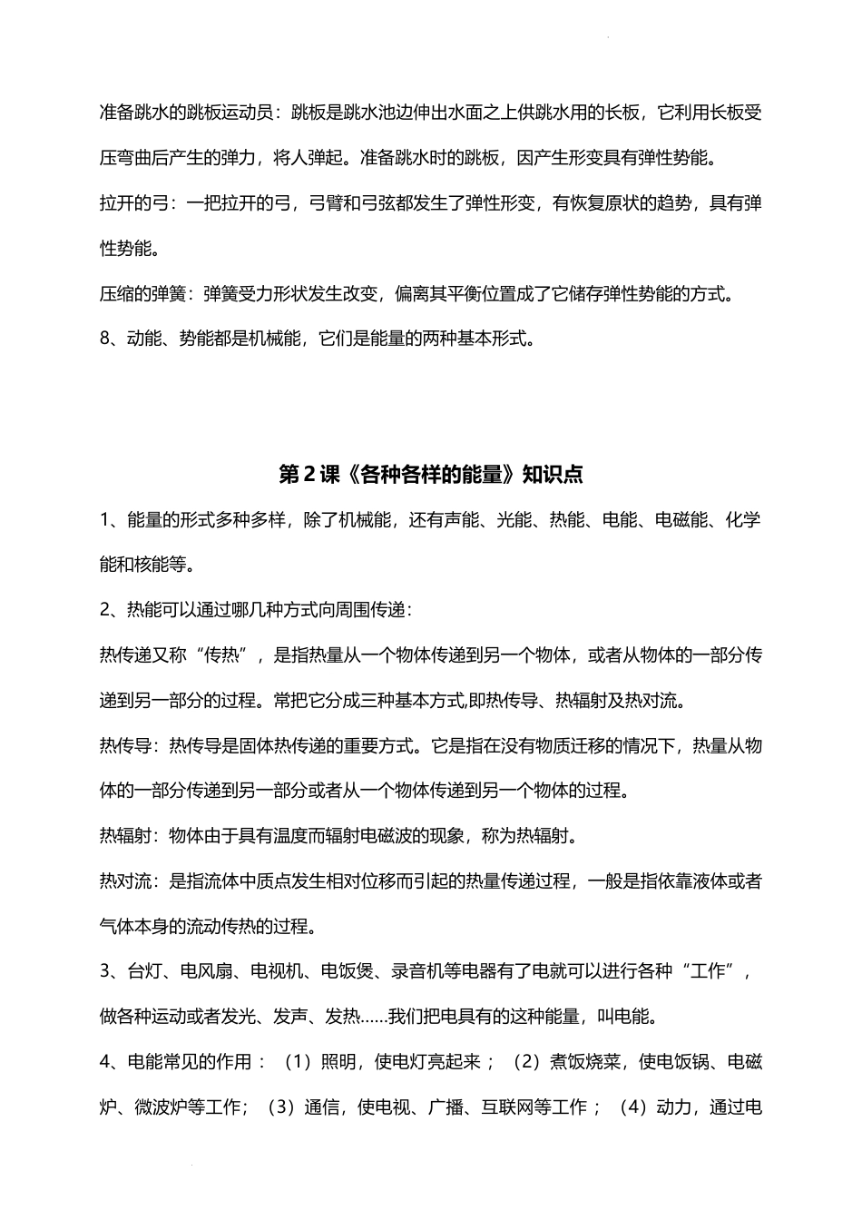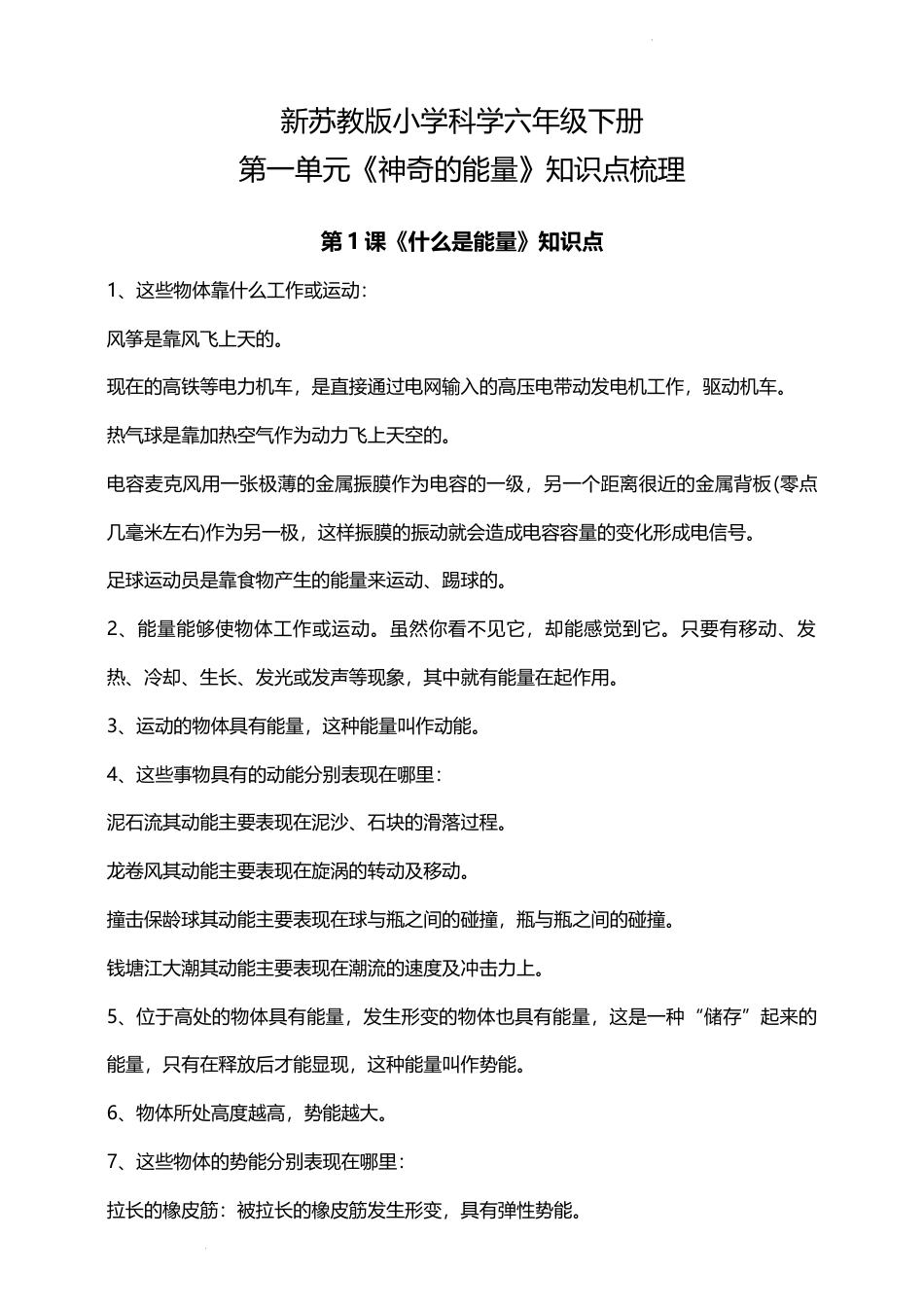 学科网(北京)股份有限公司新苏教版小学科学六年级下册第一单元《神奇的能量》知识点梳理第1课《什么是能量》知识点1、这些物体靠什么工作或运动:风筝是靠风飞上天的。现在的高铁等电力机车,是直接通过电网输入的高压电带动发电机工作,驱动机车。热气球是靠加热空气作为动力飞上天空的。电容麦克风用一张极薄的金属振膜作为电容的一级,另一个距离很近的金属背板(零点几毫米左右)作为另一极,这样振膜的振动就会造成电容容量的变化形成电信号。足球运动员是靠食物产生的能量来运动、踢球的。2、能量能够使物体工作或运动。虽然你看不见它,却能感觉到它。只要有移动、发热、冷却、生长、发光或发声等现象,其中就有能量在起作用。3、运动的物体具有能量,这种能量叫作动能。4、这些事物具有的动能分别表现在哪里:泥石流其动能主要表现在泥沙、石块的滑落过程。龙卷风其动能主要表现在旋涡的转动及移动。撞击保龄球其动能主要表现在球与瓶之间的碰撞,瓶与瓶之间的碰撞。钱塘江大潮其动能主要表现在潮流的速度及冲击力上。5、位于高处的物体具有能量,发生形变的物体也具有能量,这是一种“储存”起来的能量,只有在释放后才能显现,这种能量叫作势能。6、物体所处高度越高,势能越大。7、这些物体的势能分别表现在哪里:拉长的橡皮筋:被拉长的橡皮筋发生形变,具有弹性势能。学科网(北京)股份有限公司准备跳水的跳板运动员:跳板是跳水池边伸出水面之上供跳水用的长板,它利用长板受压弯曲后产生的弹力,将人弹起。准备跳水时的跳板,因产生形变具有弹性势能。拉开的弓:一把拉开的弓,弓臂和弓弦都发生了弹性形变,有恢复原状的趋势,具有弹性势能。压缩的弹簧:弹簧受力形状发生改变,偏离其平衡位置成了它储存弹性势能的方式。8、动能、势能都是机械能,它们是能量的两种基本形式。第2课《各种各样的能量》知识点1、能量的形式多种多样,除了机械能,还有声能、光能、热能、电能、电磁能、化学能和核能等。2、热能可以通过哪几种方式向周围传递:热传递又称“传热”,是指热量从一个物体传递到另一个物体,或者从物体的一部分传递到另一部分的过程。常把它分成三种基本方式,即热传导、热辐射及热对流。热传导:热传导是固体热传递的重要方式。它是指在没有物质迁移的情况下,热量从物体的一部分传递到另一部分或者从一个物体传递到另一个物体的过程。热辐射:物体由于具有温度而辐射电磁波的现象,称为热辐射。热对流:是指流体中质点发生相对位移而引起的热量传递过程,一般是指依靠液体或者气体本身的流动传热的过程。3、台灯、电风扇、电视机、电饭煲、录音机等电器有了电就可以进行各种“工作”,做各种运动或者发光、发声、发热……我们把电具有的这种能量,叫电能。4、电能常见的作用:(1)照明,使电灯亮起来;(2)煮饭烧菜,使电饭锅、电磁炉、微波炉等工作;(3)通信,使电视、广播、互联网等工作;(4)动力,通过电学科网(北京)股份有限公司动机驱动电风扇、洗衣机、汽车等。5、化学能是在什么情况下释放的:化学能只有在发生化学变化时才释放出来,变成热能或其他形式的能量。(1)人体内的化学能人体的能量来源于每天所吃的食物,食物在体内通过一系列化学反应产生能量。所以,食物中储存着化学能。(2)燃料中的化学能。篝火燃烧是利用木材中的化学能通过燃烧这一化学反应过程,释放木材中的化学能,发光、发热。(3)燃料中的化学能。汽车开动时,通过发动机燃烧汽油来提供能量,汽油来自于石油,通过燃烧汽油释放化学能。6、储存在燃料、食物和一些化学物质中的能量叫化学能。化学能是一种隐蔽的能量,绿色植物、食物、电池、煤、汽油中均储存着化学能。7、光是一种看得见的电磁波,微波、X光是看不见的电磁波,它们所具有的能量都属于电磁能。8、核能是原子核在聚合或分裂的过程中产生的能量。太阳等恒星发出的光是由原子核聚变产生的,核电站发电所用到的热能是由原子核裂变产生的。9、人们开发核能的途径有两条:一是重核裂变,二是轻核聚变。核裂变已得到实际应用,如核电站。核聚变的和平利用正在积极探索中。新苏教版六年级科学下册第1单元第3课《...