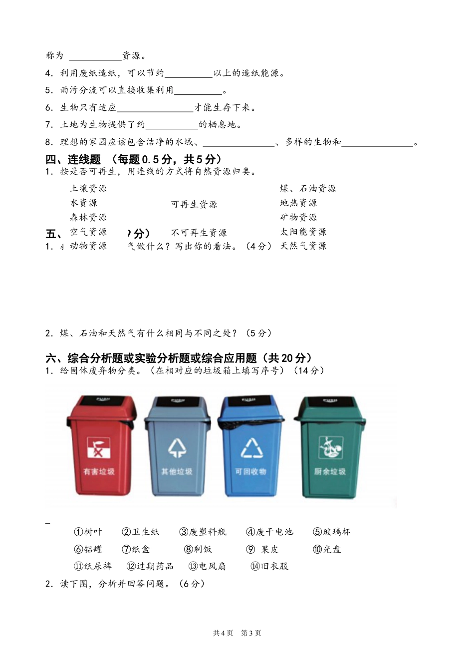 苏教版小学科学六年级下册期末测试卷(时间:60分钟总分:100分)一、选择题(每空2分,共40分)1.人吃了食物,就可以将()转换为(),使人能够工作、学习、运动等。A.热能B.电能C.化学能2.下列事例中,属于动能转化为势能的是()。A.从空中下降的跳伞运动员B.骑自行车冲上斜坡C.跳高运动员离地腾空上升3.下列对能源的利用事例,属于利用生物质能的是()。A.抽水机抽水B.植物的光合作用C.秸秆焚烧4.“螳螂捕蝉,黄雀在后”这句成语,从食物链的角度来分析,正确的是()。A.螳螂→蝉→黄雀B.树→蝉→螳螂→黄雀C.黄雀→螳螂→蝉5.在自然界中,有一类生物占据了食物链非常重要的一环,它们让我们拥有一个干净的地球,它们是()。A.生产者B.分解者C.消费者6.生态平衡是一种()。A.绝对平衡B.动植物数量相等平衡C.动态平衡7.新能源的开发是以()为原理的。A.节约不可再生资源B.能量递减C.能量转化8.核能的利用分()两大类。A.核裂变和核聚变B.核裂变和核变C.核聚变和原子能9.如果电磁铁的线圈圈数有以下几种,那么()的磁力大。A.50圈B.100圈C.80圈10.某农田保护区,为防止鸟类啄食农作物的种子,对鸟类进行大肆的捕杀,后来发现农田中有大量害虫,造成这种现象的原因是()。A.害虫过度繁殖B.食物链被破坏C.干旱缺水11.环境的改变会影响动物的生存,下列生物中()不需要到南方过冬。A.大雁B.天鹅C.燕子D.喜鹊12.下列能源中,不属于新能源的是()。A.风能B.水能C.地热能D.生物质能共4页第1页题号一二三四五六总分得分学校班级姓名----------------------------------------------------------------------------------密封线内请不要答题----------------------------------------------------------------------------------------------------------------13.能耗标识中()级代表能耗最低。A.1B.2C.3D.414.回收一吨废纸,可以生产()千克的纸。A.600B.700C.800D.90015.生物的栖息地,需要为生物提供()。A.食物B.水C.庇护所D.以上都是16.人们采用多样化的方法治理水污染,下列措施()效果不显著。A.治理河流周边污染,寻找污染源B.开凿河道,引入外流水源C.不允许船只进入D.对河道进行清淤17.下列动物中()是近200年灭绝的。A.渡渡鸟B.旅鸽C.猛犸象D.笑鸮18.建设节能型房屋时,我们通常选择()做建筑材料。A.普通红砖B.混领土实心砖C.混领土空心砖19.生活中,我们通常将垃圾分为()类。A.3B.4C.5D.620.“绿色建筑”不是建立在()基础上的。A.充分利用可再生资源B.充分利用太阳能资源C.占据有利地形D.利用风能发电二、判断题(每题1分,共10分)1.鱼的记忆只有7秒钟。()2.绿色建筑与周围环境相融合,和谐一致,动静互补。()3.某一物种的消失,不会影响到其他相关生物的生存。()4.煤、石油和天然气的形成与太阳能有关。()5.动物具有应对环境变化的本领。()6.在自然界,能自己制造“食物”的植物叫分解者。()7.栖息地可以大到一个区域,也可以小到一个水坑。()8.改变电池正负极的接法,电磁铁的磁力不变。()9.“飞流直下三千尺,疑是银河落九天”体现了李白浪漫主义风格,其中“飞流”具有势能。()10.寒冷的冬季,熊、蝙蝠、刺猬、青蛙等动物不吃也不动,以冬眠的方式度过寒冬。()三、填空题(每题1分,共16分)1.能量的形式多种多样,除了机械能,还有、、、、等。2.一个生态系统由、、三者组成。3.土壤、太阳能、水等自然资源,在较短时间内能再生或再循环,被称为资源。煤、石油、天然气等在地下经过漫长而复杂的地质变化才能形成,使用后蕴藏量不断减少,被共4页第2页称为资源。4.利用废纸造纸,可以节约以上的造纸能源。5.雨污分流可以直接收集利用。6.生物只有适应才能生存下来。7.土地为生物提供了约的栖息地。8.理想的家园应该包含洁净的水域、、多样的生物和。四、连线题(每题0.5分,共5分)1.按是否可再生,用连线的方式将自然资源归类。五、简答题(共9分)1.我们能为净化空气做什么?写出你的看法。(4分)2.煤、石油和天然气有什么相同与不同之处?(5分)六、综合分析题或实验分析题或综合应用题...