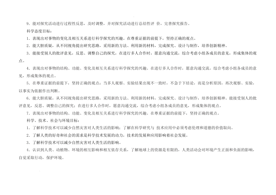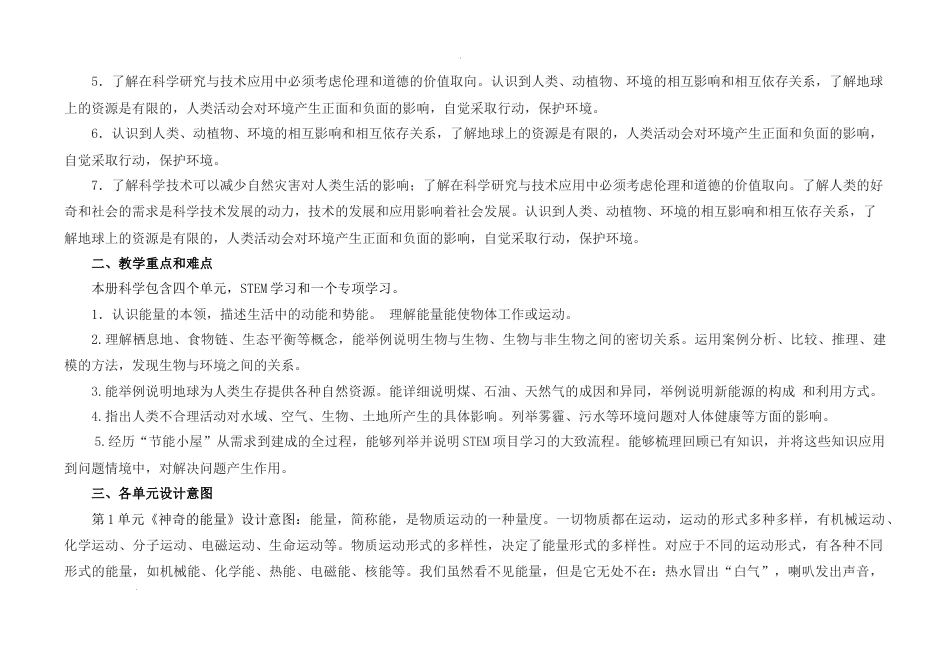 学科网(北京)股份有限公司××小学苏教版小学科学六年级下册教学计划第二学期班级:六年级任课教师:×××一、教学目标科学知识目标:1.初步了解动物与植物之间的相互关系;了解生物的生存条件和生物的多样性。2.认识人类与自然资源和能源的关系,知道地球是人类应当珍惜的家园。3.了解生物的生存条件和生物的多样性;认识人类与自然资源和能源的关系,知道地球是人类应当珍惜的家园。4.了解技术是人们改造周围环境的方法,是人类能力的延伸,工程是依据科学原理设计和制造物品、解决技术应用的难题、创造丰富多彩的人工世界的一系列活动;了解科学技术推动着人类社会的发展和文明进程。5.通过自主阅读和交流介绍,了解科学家在科学研究时所遵循的一般程序,并在学习科学家事迹中,体悟他们的科学精神,激发以“像科学家那样”的态度对待科学探究活动。科学探究目标:1.能基于所学的知识,从事物的变化及相互关系等角度提出可探究的科学问题。2.能基于所学的知识,从事物的结构、功能、变化及相互关系等角度提出有针对性的假设,并能说明假设的依据。3.能基于所学的知识,通过观察、实验、查阅资料、调查、案例分析等方式获取事物的信息。4.能基于所学的知识,初步具备实验设计的能力和控制变量的意识,并能设计单一变量的实验方案。5.能基于所学的知识,用科学语言、概念图、统计图表等方式记录整理信息,表述探究结果。6.能对探究活动进行过程性反思,及时调整,并对探究活动进行总结性评价。7.能基于所学的知识,通过观察、实验、查阅资料、调查、案例分析等方式获取事物的信息。8.能基于所学的知识,运用分析、比较、推理、概括等方法得出科学探究的结论,判断结论与假设是否一致。学科网(北京)股份有限公司9.能对探究活动进行过程性反思,及时调整,并对探究活动进行总结性评价,完善探究报告。科学态度目标:1.表现出对事物的变化及相互关系进行科学探究的兴趣。在尊重证据的前提下,坚持正确的观点。2.能大胆质疑,从不同视角提出研究思路,采用新的方法、利用新的材料,完成探究、设计与制作,培养创新精神。3.能接受别人的批评意见,反思、调整自己的探究,在进行多人合作时,愿意沟通交流,综合考虑小组各成员的意见,形成集体的观点。4.表现出对事物的结构、功能、变化及相互关系进行科学探究的兴趣。在进行多人合作时,愿意沟通交流,综合考虑小组各成员的意见,形成集体的观点。5.在尊重证据的前提下,坚持正确的观点;当多人观察、实验结果出现不一致时,不急于下结论,而是分析原因,再次观察、实验,以事实为依据作出判断。6.能大胆质疑,从不同视角提出研究思路,采用新的方法、利用新的材料,完成探究、设计与制作,培养创新精神。能接受别人的批评意见,反思、调整自己的探究;在进行多人合作时,愿意沟通交流,综合考虑小组各成员的意见,形成集体的观点。7.表现出对事物的结构、功能、变化及相互关系进行科学探究的兴趣。在尊重证据的前提下,坚持正确的观点。科学、技术、社会与环境目标:1.了解科学技术可以减少自然灾害对人类生活的影响;了解在科学研究与技术应用中必须考虑伦理和道德的价值取向。2.了解人类的好奇和社会的需求是科学技术发展的动力,技术的发展和应用影响着社会发展。3.了解科学技术可以减少自然灾害对人类生活的影响。4.认识到人类、动植物、环境的相互影响和相互依存关系,了解地球上的资源是有限的,人类活动会对环境产生正面和负面的影响,自觉采取行动,保护环境。学科网(北京)股份有限公司5.了解在科学研究与技术应用中必须考虑伦理和道德的价值取向。认识到人类、动植物、环境的相互影响和相互依存关系,了解地球上的资源是有限的,人类活动会对环境产生正面和负面的影响,自觉采取行动,保护环境。6.认识到人类、动植物、环境的相互影响和相互依存关系,了解地球上的资源是有限的,人类活动会对环境产生正面和负面的影响,自觉采取行动,保护环境。7.了解科学技术可以减少自然灾害对人类生活的影响;了解在科学研究与技术应用中必须考虑伦理和道德的价值取向。了解人类的好奇和社会的需求是...