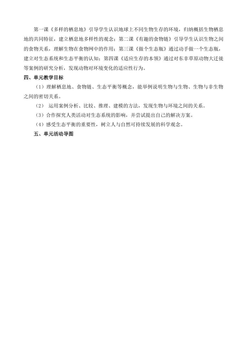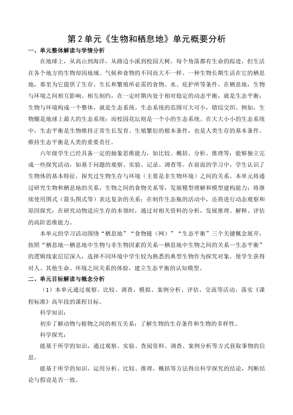 第2单元《生物和栖息地》单元概要分析一、单元整体解读与学情分析在地球上,从高山到海洋,从路边小溪到校园大树,每个角落都有生命的踪迹,但生活在各个地方的生物却因地域、气候和食物的不同而大不一样。一种生物长期生活在它的栖息地,那里为它提供了生存、生长和繁殖所必需的食物、水、庇护所等条件。在栖息地,生物与环境之间相互影响、相互制约,在一定时期内处于相对稳定的动态平衡,就是生态平衡;生物与环境构成一个整体,就是生态系统。生态系统的范围可大可小,错综交织。例如,生物圈是地球上最大的生态系统;而校园花坛则是一个小的生态系统。在大大小小的生态系统中,生态平衡是生物维持正常生长发育、生殖繁衍的根本条件,也是人类生存的基本条件。维持生态平衡是人类的重要责任。六年级学生已经具备一定的抽象思维能力,如比较、概括、分析、推理等;能够独立完成一些探究活动,如基于问题的观察、实验、记录、调查等。在前面的学习中,学生认识了生物体的基本特征,探究过生物生存与环境(主要是非生物环境)之间的关系。本单元将通过研究生物和栖息地的关系,生物之间的食物关系等,发展模型理解和模型建构能力;将继续使用图式(箭头图式等)表达复杂的关系;在制作生态瓶的活动中,还将进行动态观察和原因探究;在研究动物适应生存的本领时,通过对相关资料的分析,发展推理、解释、评估的高阶思维能力。本单元的学习活动围绕“栖息地”“食物链(网)”“生态平衡”三个关键概念展开,按照“栖息地—栖息地中生物与非生物因素的关系—栖息地中生物之间的关系—生态平衡”的逻辑线索层层深入,选择不同环境中学生较为熟悉的典型生物作为探究对象,使学生获得对人、其他生命、环境之间关系的体验,建立生态平衡的认知模型。二、单元目标解读与概念分析(1)本单元通过观察、比较、调查、模拟、案例分析、评估、交流等活动,落实《课程标准》高年段的课程目标。科学知识:初步了解动物与植物之间的相互关系;了解生物的生存条件和生物的多样性。科学探究:能基于所学的知识,通过观察、实验、查阅资料、调查、案例分析等方式获取事物的信息。能基于所学的知识,运用分析、比较、推理、概括等方法得出科学探究的结论,判断结论与假设是否一致。科学态度:表现出对事物的结构、功能、变化及相互关系进行科学探究的兴趣。在进行多人合作时,愿意沟通交流,综合考虑小组各成员的意见,形成集体的观点。科学、技术、社会与环境:认识到人类、动植物、环境的相互影响和相互依存关系,了解地球上的资源是有限的,人类活动会对环境产生正面和负面的影响,自觉采取行动,保护环境。(2)本单元学习内容基于《课程标准》课程内容中“生命科学领域”的高年段要求。8.1植物具有获取和制造养分的结构。知道植物可以吸收阳光、空气和水分,并在绿色叶片中制造其生存所需的养分。9.3动物的行为能够适应环境的变化。举例说出动物在气候、食物、空气和水源等环境变化时的行为。12.1动物和植物都有基本生存需要,如空气和水;动物还需要食物,植物还需要光。栖息地能满足生物的基本需要。举例说出常见的栖息地为生物提供光、空气、水、适宜的温度和食物等基本需要。12.2动物的生存依赖于植物,一些动物吃其他动物。说出不同动物以植物或其他动物为食,动物维持生命需要消耗这些食物而获得能量。说出常见植物和动物之间吃与被吃的链状关系。12.4自然或人为干扰能引起生物栖息地的改变,这种改变对于生活在该地的植物和动物种类、数量可能产生影响。认识到保护身边多种多样的生物非常重要。三、单元构成与逻辑分析本单元由《多样的栖息地》《有趣的食物链》《做个生态瓶》《适应生存的本领》四课组成。四课内容设计的逻辑关系是:由整体到部分,由外部组成到内部关系。即从整体认识栖息地开始,深入栖息地内部认识生物与生物、生物与非生物之间的关系,接着认识生物与环境之间建立的相对稳定的关系,最后认识环境变化后动物的适应性行为。从科学思维的角度看,引导学生分析各种不同的栖息地,归纳概括栖息地的一般特征;分析某几种生物之间的食物关系,再逐渐扩展,综合更多生物之间...